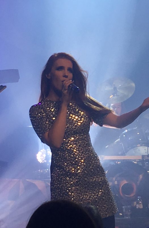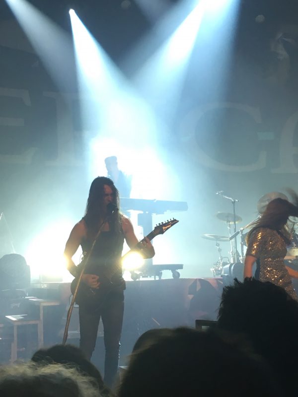 Changement de décor, des prismes prennent place, une batterie centrale entourée d’une plateforme, sur laquelle circulera un piano, fait son apparition. Les lumières se tamisent et apparaissent les musiciens d’Epica, suivis par la ravissante chanteuse du groupe, Simone. Habillée d’une robe brillante, elle entonne les paroles de « Edge of the Blade », provenant de leur dernier album ‘The Holographic Principle‘. Alternent alors les chants lyriques de Simone avec les puissants growls du guitariste Mark Jansen, le tout entouré de compositions sublimes et d’une batterie surpuissante !
