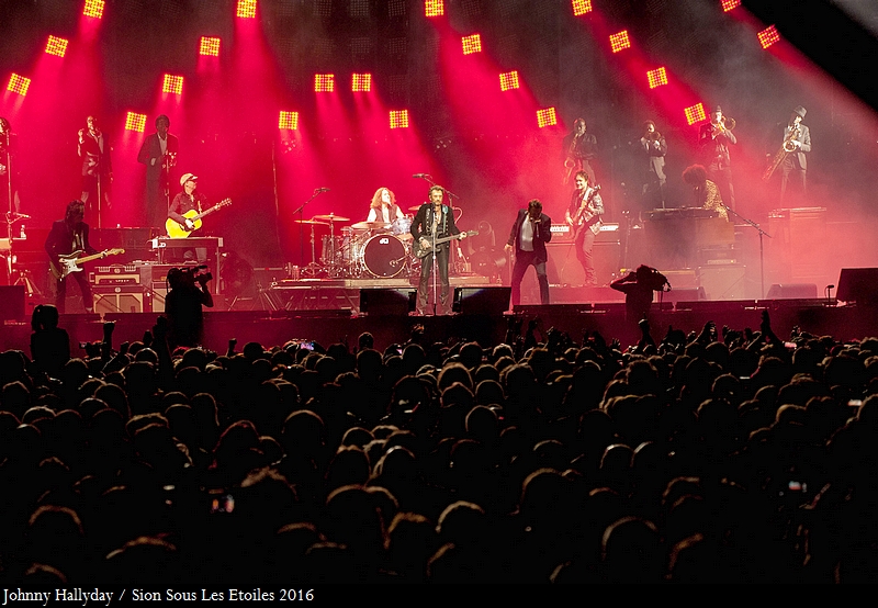Sion Sous Les Étoiles 2016 s’offre Johnny Halliday et quand on est fan de Johnny c’est bien plus que de sa musique. Entre casquettes, t-shirts et santiags, c’est impressionnant de voir la génération Johnny envahir les lieux (le mec des merchs ne doit pas avoir grand-chose à remballer après les concerts). Je vous parle même pas du nombre de tatouages de loups que j’ai vu ce soir!!