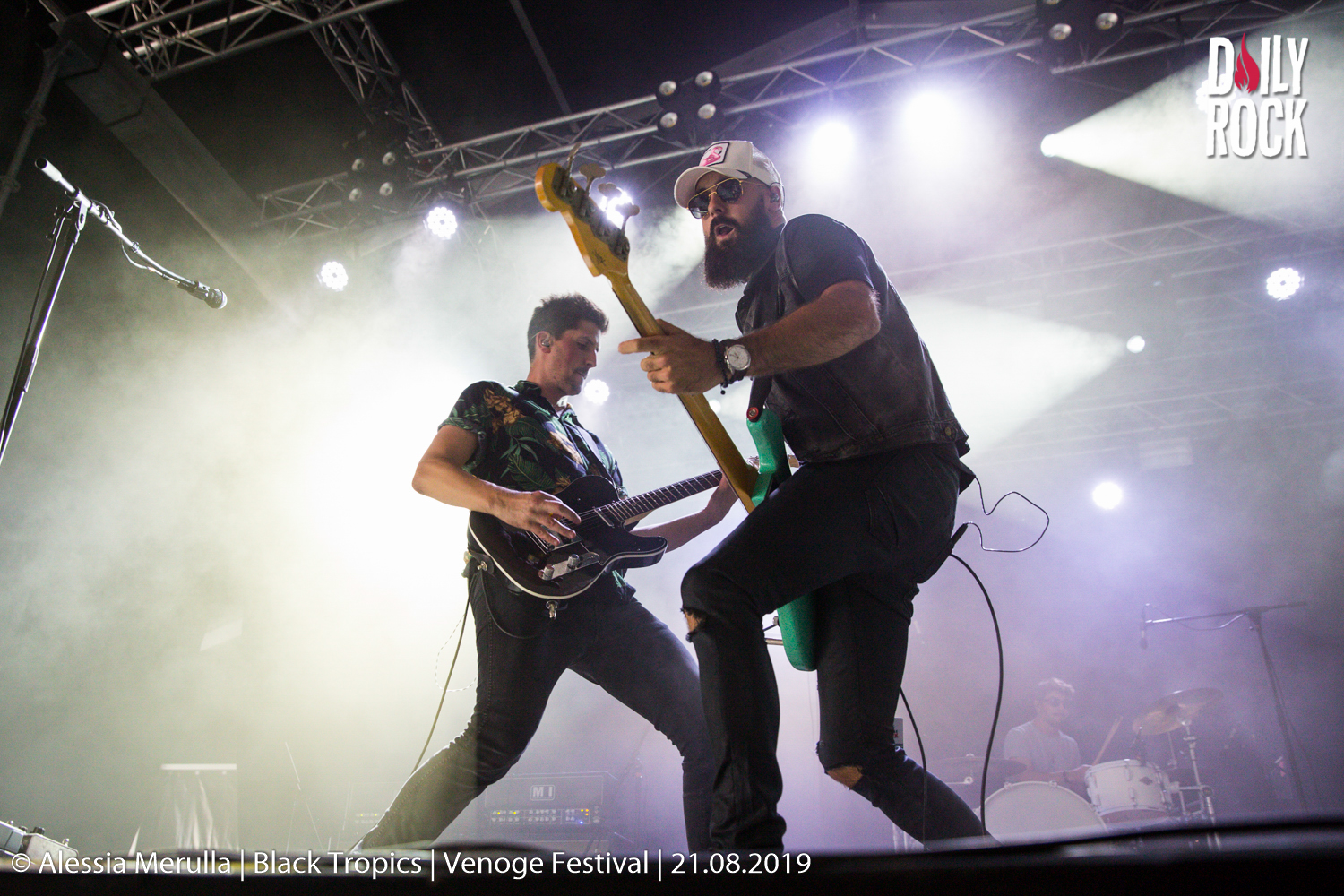 Cette année au Venoge, le site a été un peu remanié : une scène en plus et une River Stage plus grande. C’est les lausannois de Black Tropics qui ont eu l’honneur d’inaugurer cette dernière. Comme ils nous l’avaient confié quelques minutes avant le show, ce n’était que leur onzième concert. Pourtant, ce n’est pas le professionnalisme qui manque. Les trois rockeurs envoient du lourd et placent la barre très haut dès le début de la soirée.