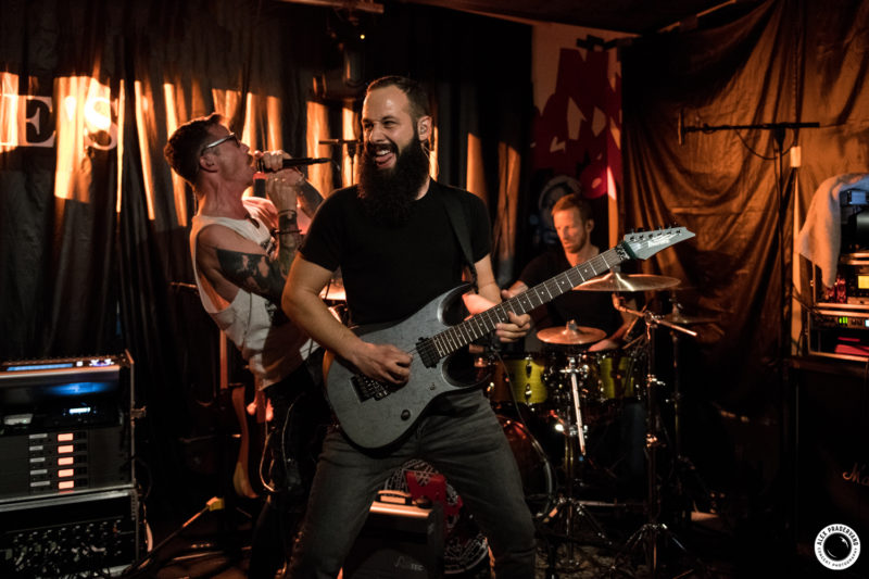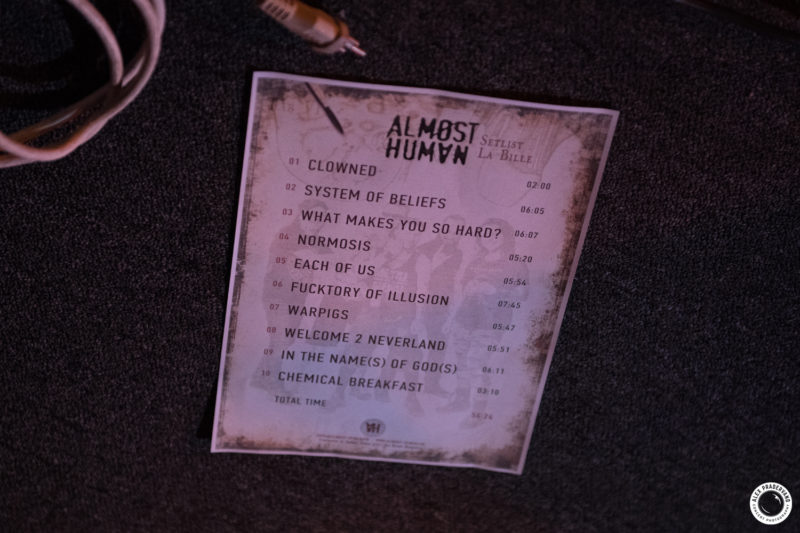 Pour l’occasion, Fri-Son est complet (ou pas loin) et on a droit à un pit pour les photos. Alain a aussi fait le déplacement et je croise également d’autres photographes comme Cyril qui est venu depuis la France pour Ultra Vomit. Merci à Olivier qui a négocié les accréditations et est en passe de devenir tour manager à l’insu de son plein gré. Sans surprise, c’est Almøst Human qui ouvre la soirée. Sara est malheureusement absente. Comme Ben le soulignera au micro durant le set, « ce soir elle est malade dans son lit et elle ultra vomit ». Pour la discrétion, on repassera.