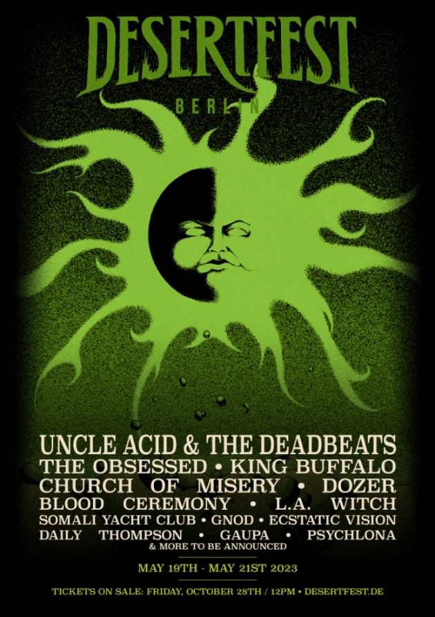 Le festival accueillera du 19 au 21 mai 2023 des groupes comme Uncle Acid & The Deadbeats, The Obsessed, King Buffalo, Church Of Misery, Dozer, Blood Ceremony, L.A. Witch, Somali Yacht Club, Gnod, Ecstatic Vision, Daily Thompson, Gaupa et Psychlona, avec de nombreux autres groupes à annoncer prochainement !