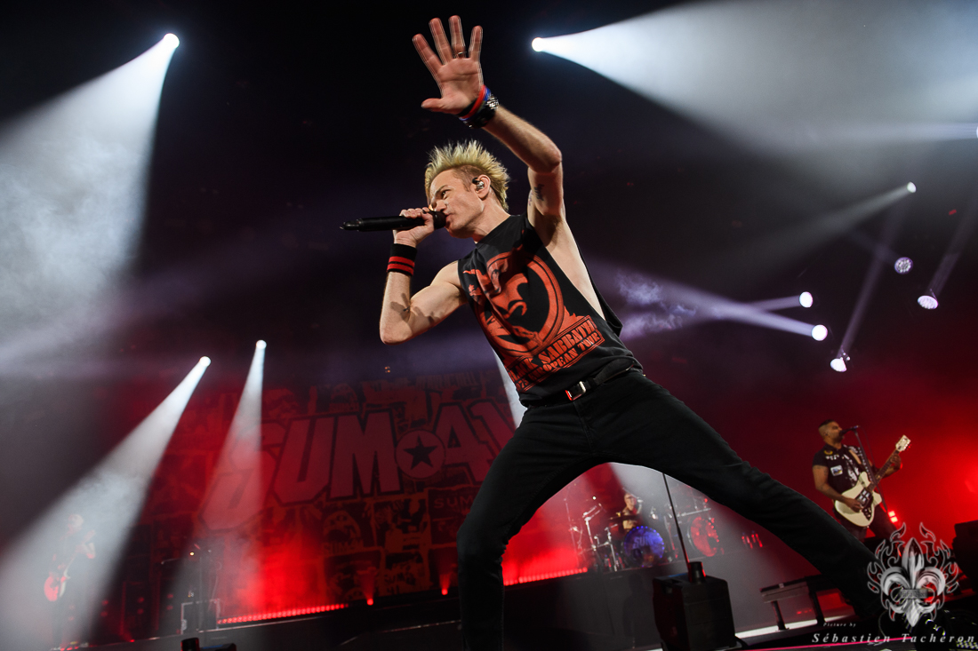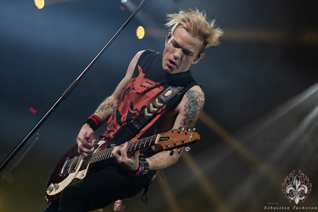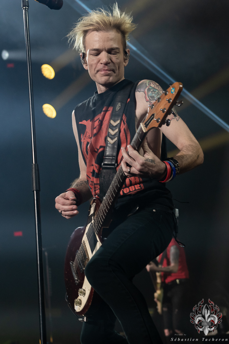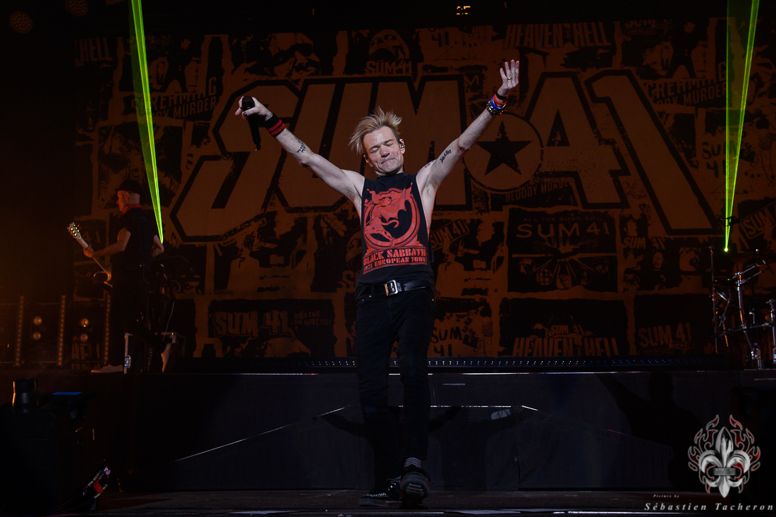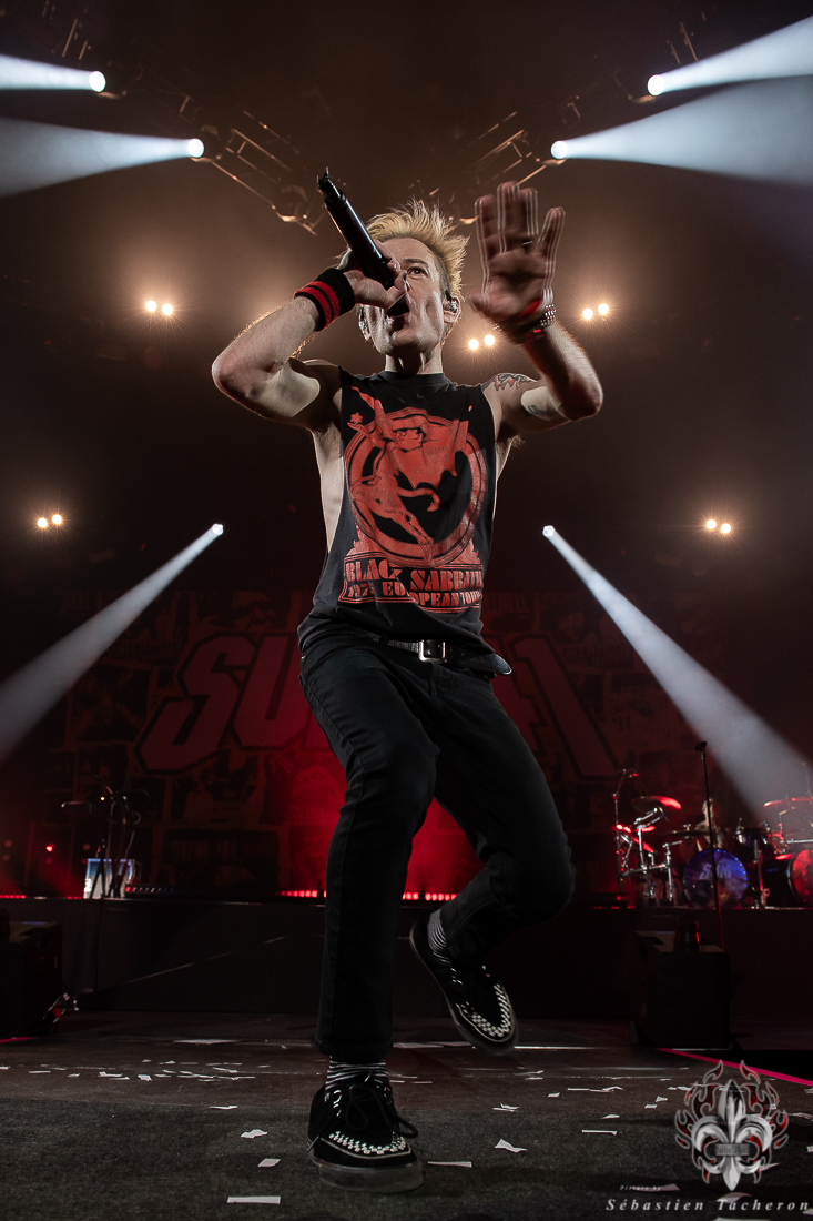 Lorsque l’heure tant attendue arriva pour SUM 41, l’énergie atteignit son paroxysme. Derrière un rideau opaque, une vague d’excitation déferlait dans la salle, chaque seconde d’attente intensifiant l’impatience. Dès que le groupe entra sur scène, la foule se leva spontanément, laissant derrière elle les sièges, emportée par la puissance de l’instant. Dans la lignée de groupes comme Blink 182, Good Charlotte, et d’autres figures emblématiques du pop-punk, SUM 41 a enchaîné ses classiques avec une maîtrise impressionnante, livrant une performance sans faille qui combla les attentes de ses fans. Un moment fort de cette soirée : Deryck Whibley, le chanteur principal, a raconté l’histoire émouvante de sa guitare volée pendant son adolescence, retrouvée 40 ans plus tard. Ce récit, à la fois personnel et symbolique, a créé une communion rare entre le groupe et ses fans, renforcée par les sincères remerciements en français, qui témoignaient de la complicité partagée avec le public québécois. La chanson Pieces a offert un moment de pure émotion, avec des milliers de voix unies dans un chant puissant, où chaque parole semblait renforcer les liens entre le groupe et ses fidèles, transcendant le simple concert pour devenir une expérience collective inoubliable.