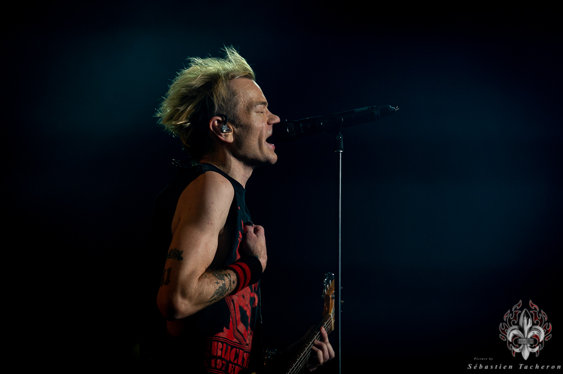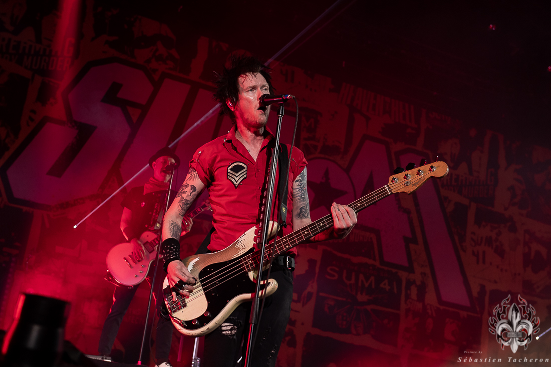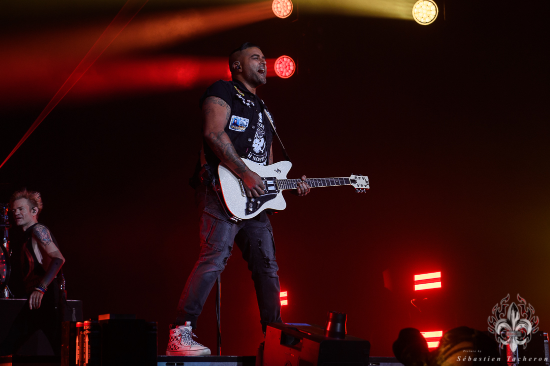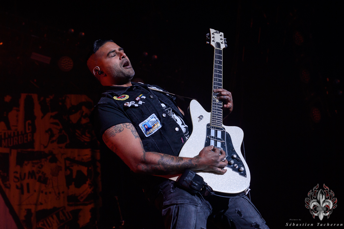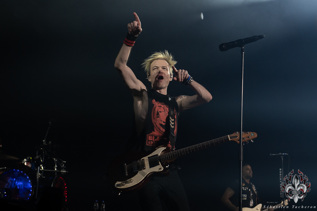 Lorsque l’heure tant attendue arriva pour SUM 41, l’énergie atteignit son paroxysme. Derrière un rideau opaque, une vague d’excitation déferlait dans la salle, chaque seconde d’attente intensifiant l’impatience. Dès que le groupe entra sur scène, la foule se leva spontanément, laissant derrière elle les sièges, emportée par la puissance de l’instant. Dans la lignée de groupes comme Blink 182, Good Charlotte, et d’autres figures emblématiques du pop-punk, SUM 41 a enchaîné ses classiques avec une maîtrise impressionnante, livrant une performance sans faille qui combla les attentes de ses fans. Un moment fort de cette soirée : Deryck Whibley, le chanteur principal, a raconté l’histoire émouvante de sa guitare volée pendant son adolescence, retrouvée 40 ans plus tard. Ce récit, à la fois personnel et symbolique, a créé une communion rare entre le groupe et ses fans, renforcée par les sincères remerciements en français, qui témoignaient de la complicité partagée avec le public québécois. La chanson Pieces a offert un moment de pure émotion, avec des milliers de voix unies dans un chant puissant, où chaque parole semblait renforcer les liens entre le groupe et ses fidèles, transcendant le simple concert pour devenir une expérience collective inoubliable.