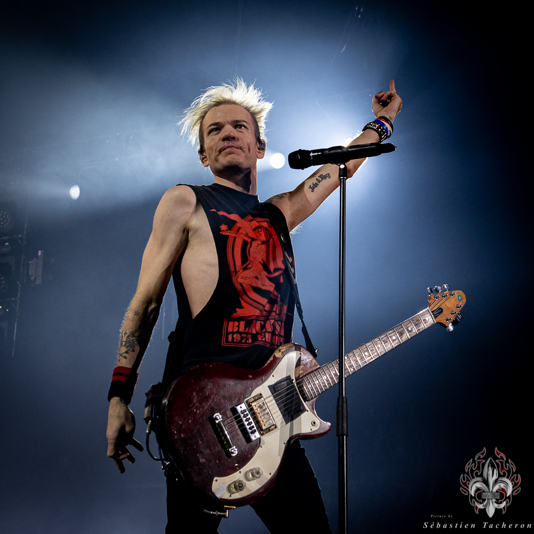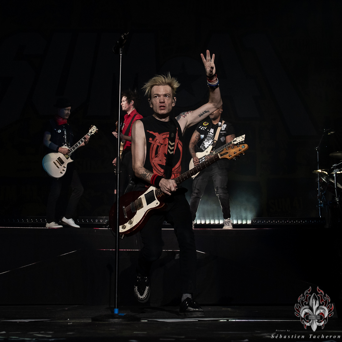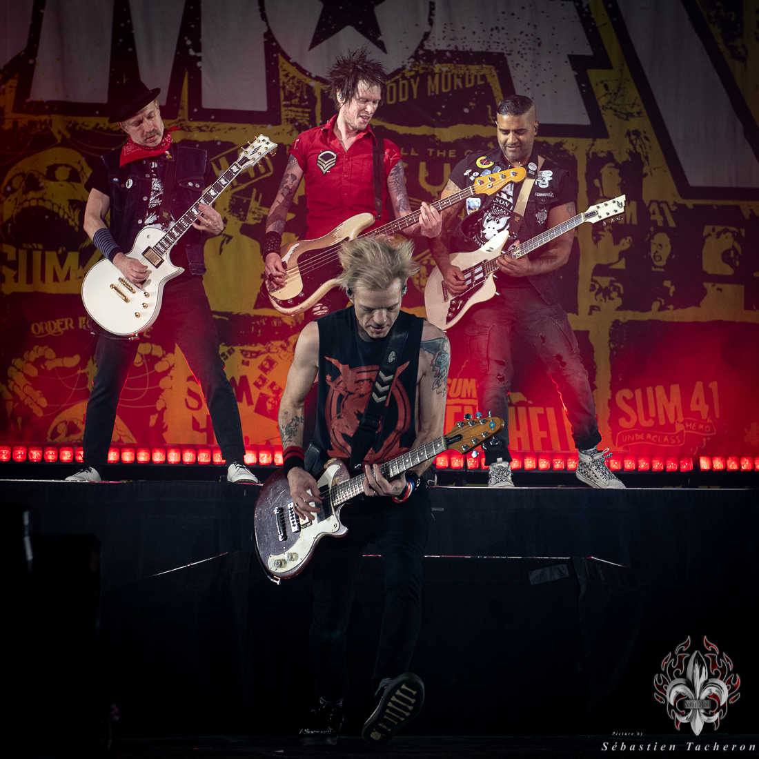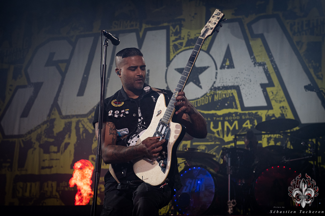 Lorsque l’heure tant attendue arriva pour SUM 41, l’énergie atteignit son paroxysme. Derrière un rideau opaque, une vague d’excitation déferlait dans la salle, chaque seconde d’attente intensifiant l’impatience. Dès que le groupe entra sur scène, la foule se leva spontanément, laissant derrière elle les sièges, emportée par la puissance de l’instant. Dans la lignée de groupes comme Blink 182, Good Charlotte, et d’autres figures emblématiques du pop-punk, SUM 41 a enchaîné ses classiques avec une maîtrise impressionnante, livrant une performance sans faille qui combla les attentes de ses fans. Un moment fort de cette soirée : Deryck Whibley, le chanteur principal, a raconté l’histoire émouvante de sa guitare volée pendant son adolescence, retrouvée 40 ans plus tard. Ce récit, à la fois personnel et symbolique, a créé une communion rare entre le groupe et ses fans, renforcée par les sincères remerciements en français, qui témoignaient de la complicité partagée avec le public québécois. La chanson Pieces a offert un moment de pure émotion, avec des milliers de voix unies dans un chant puissant, où chaque parole semblait renforcer les liens entre le groupe et ses fidèles, transcendant le simple concert pour devenir une expérience collective inoubliable.