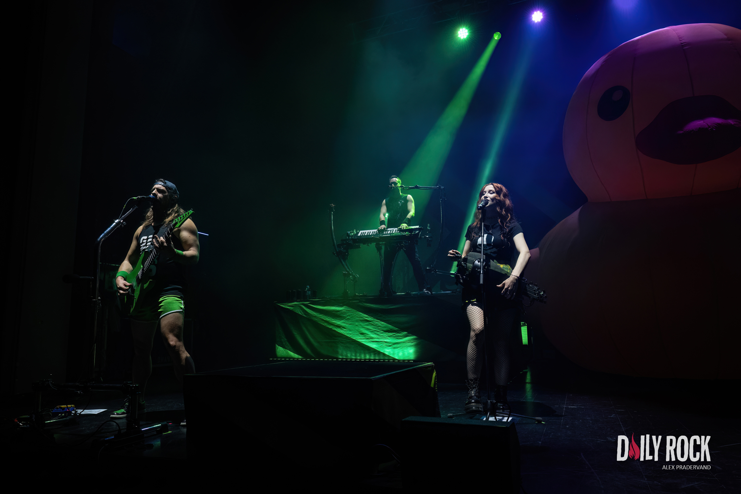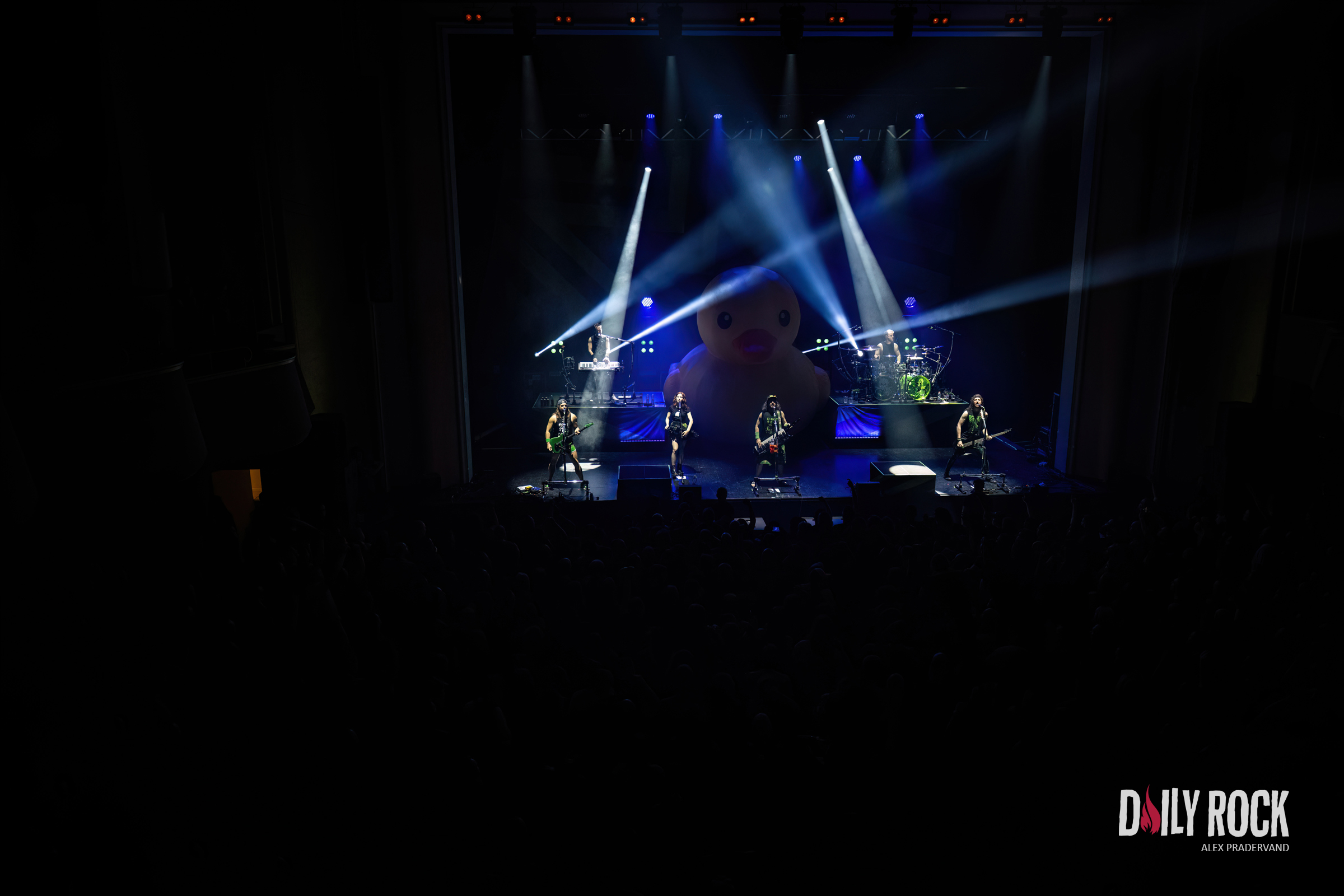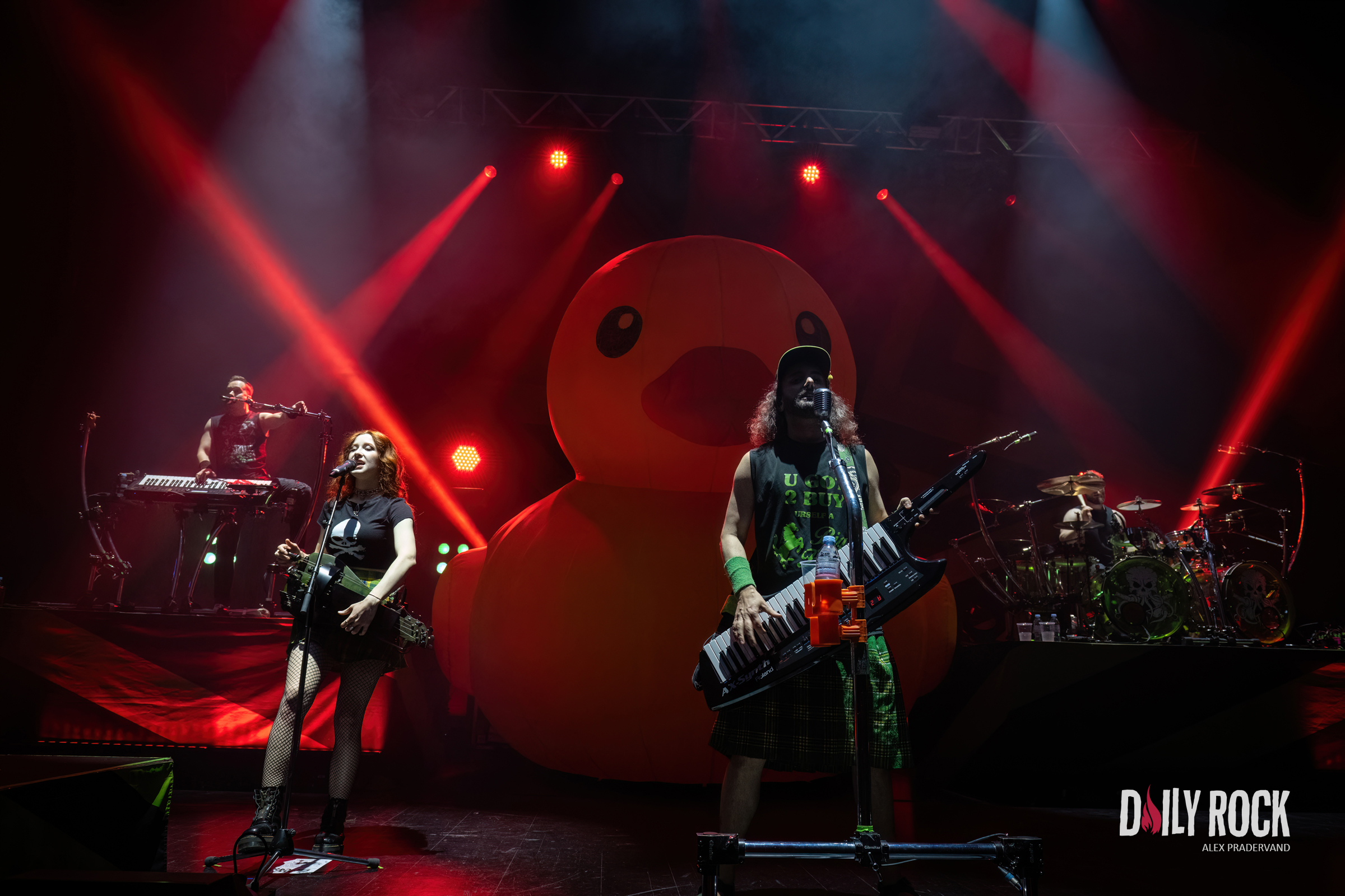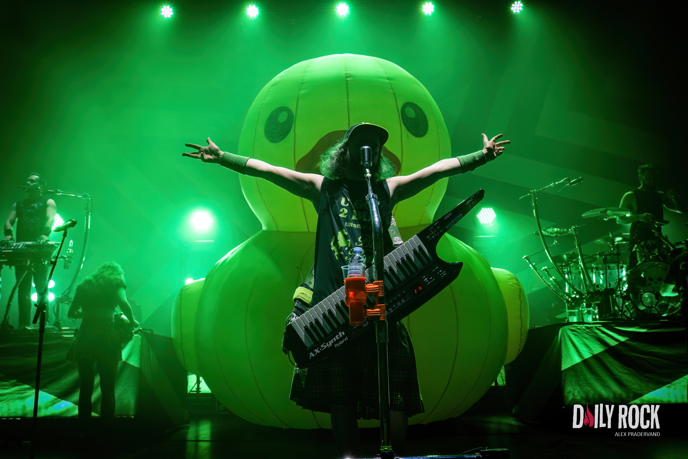 Ça y est, la salle est chaude, à point pour affronter le boss final de la soirée : les pirates écossais d’Alestorm. Quel festival international ! Et ouvert en termes de style, aussi, car nous sommes passés de la fantaisie à la mythologie viking, avec un détour par l’Histoire nordique et médiévale, pour se retrouver avec des pirates des temps modernes, sans filtre, qui détournent les Pokémon, brandissent un canard en plastique géant, et finissent leur concert avec un combat de catch aussi crédible que le second degré du groupe le permet. Une belle réussite en termes d’ambiance festive, qui ne surprendra personne, mais la présence de la désormais célèbre Patty Gurdy aux côtés du groupe sur scène est un facteur indéniable à la continuité de leur succès. Elle apporte une touche de bonne humeur, mais surtout d’authenticité avec sa vielle à roue. Le public chante avec joie tous les refrains, tout en faisant avancer les crowd-surfers jusqu’à la scène (une fan arrivera même sur la scène, mais n’aura pas eu le temps d’approcher Chris). Par contre, je n’envie pas les crowd-surfers, dont la plupart atterrit sur une sécurité qui, encore une fois, n’est pas préparée à un public de métalleux et ne prévient pas les chutes sur la barrière. Troisième preuve. A priori, pas d’incident, mais on n’était pas loin. Les festivités ont pu continuer jusqu’au dernier moment dans une ambiance bon enfant, et tout le monde a l’air ravi. Il faut dire que les chansons d’Alestorm sont tellement entraînantes, dur d’y résister !