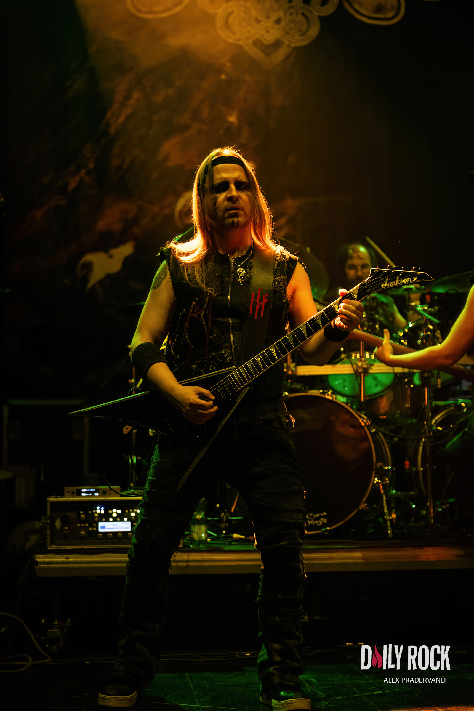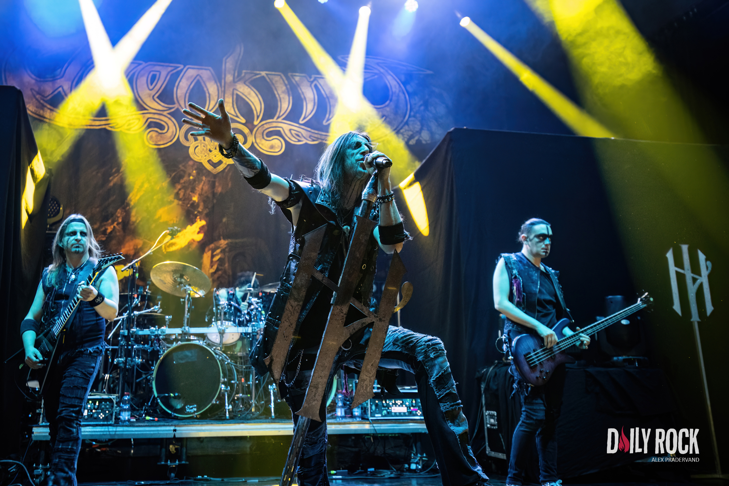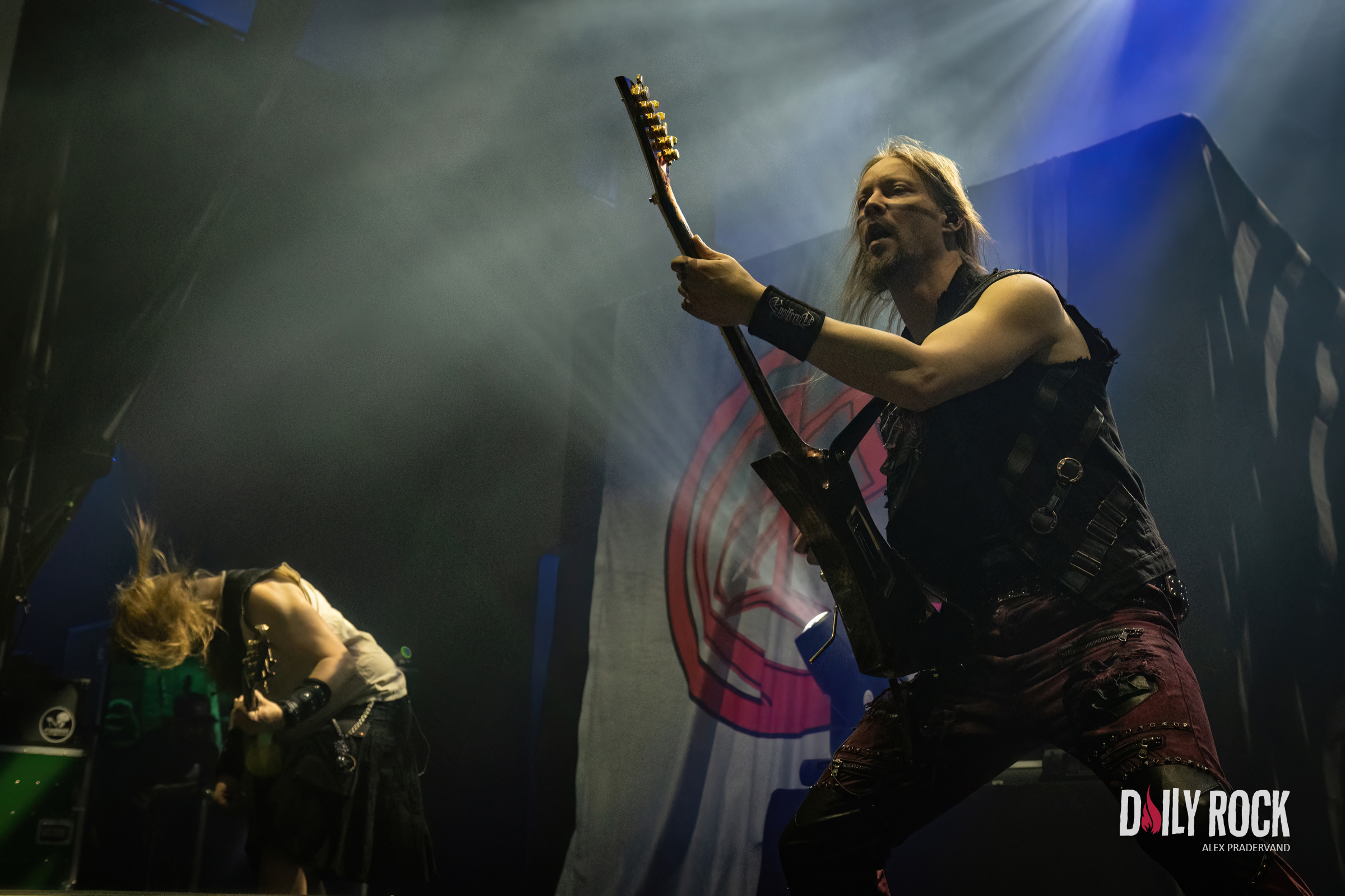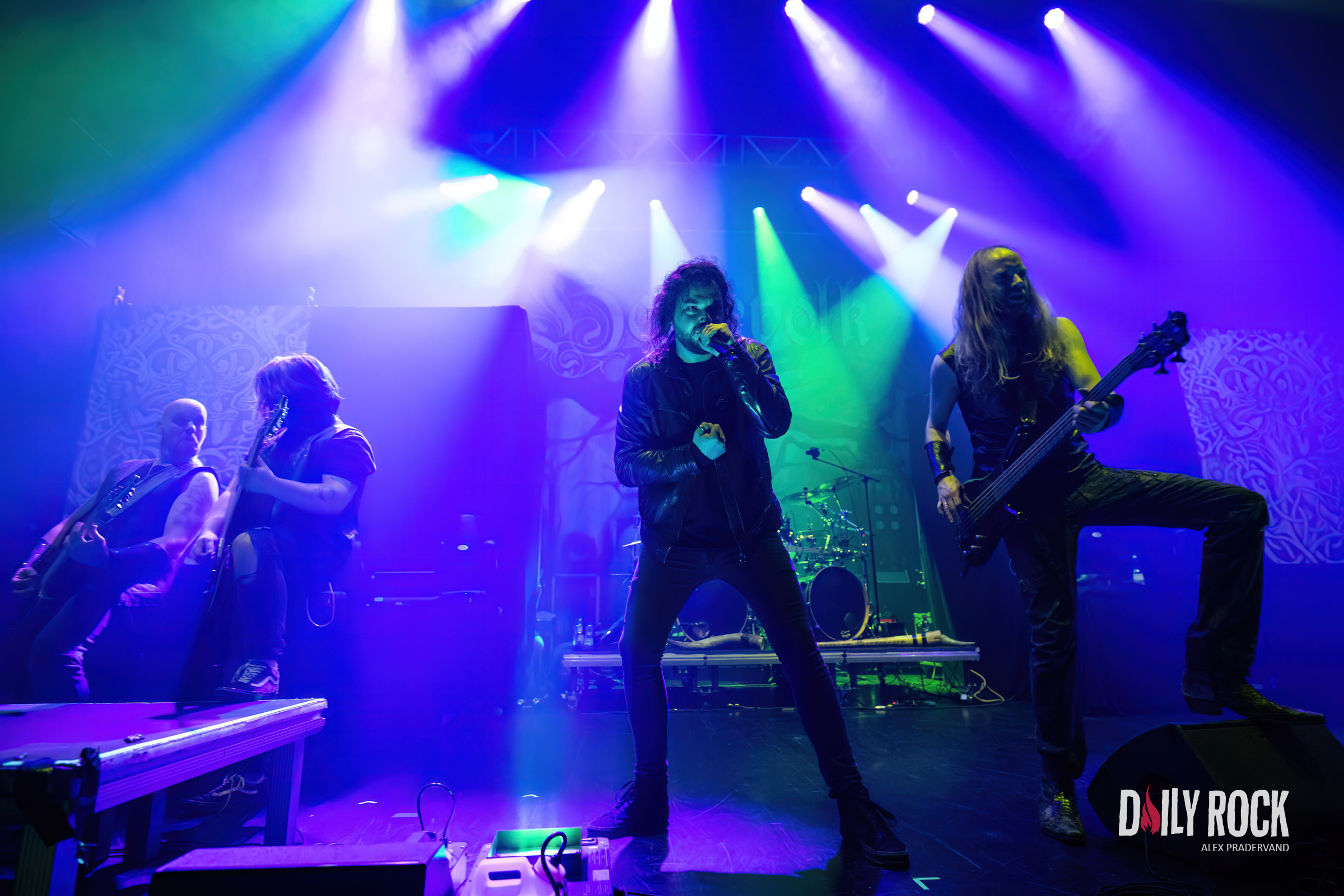 D’ailleurs il l’heure d’aller se ravitailler, tout en trépignant d’impatience pour Ensiferum qui se prépare. Avant-dernière aventure de la soirée, Ensiferum livre son metal aussi death qu’épique. Leur discographie étant composée de morceaux soit mélodiques, soit folkloriques, soit les deux, les Finlandais n’ont qu’à annoncer un titre pour que la foule saute déjà en rythme. Surtout lorsque le morceau a, pour citer Petri, « plusieurs noms, mais je sais qu’entre vous, vous l’appelez « Ta-tadadaaa, ta-tadadaaa ! » » (eh oui, les Finlandais peuvent aussi avoir de l’humour, et ça fonctionne). Lorsqu’il ne fait pas de pogos ou des circle pits qui font la moitié de la salle, le public s’assied et rame pendant de longues minutes. Il paraît que c’est bon pour le cardio, tant mieux. On note beaucoup de variété dans les morceaux, tirés de périodes différentes et avec une alternance des chanteurs (Petri bien sûr, mais beaucoup de Pekka et de Markus). Pas de fausse note pour Ensiferum, donc : ambiance au top, enchaînement de tubes (Lai Lai Hei, Andromeda, Iron évidemment), membres du groupe tout sourire malgré les grimaces guerrières de rigueur pour le show. Le balcon rempli de personnes assises jusque-là est désormais constitué lui aussi d’une barrière humaine qui scande les refrains et le nom du groupe.
