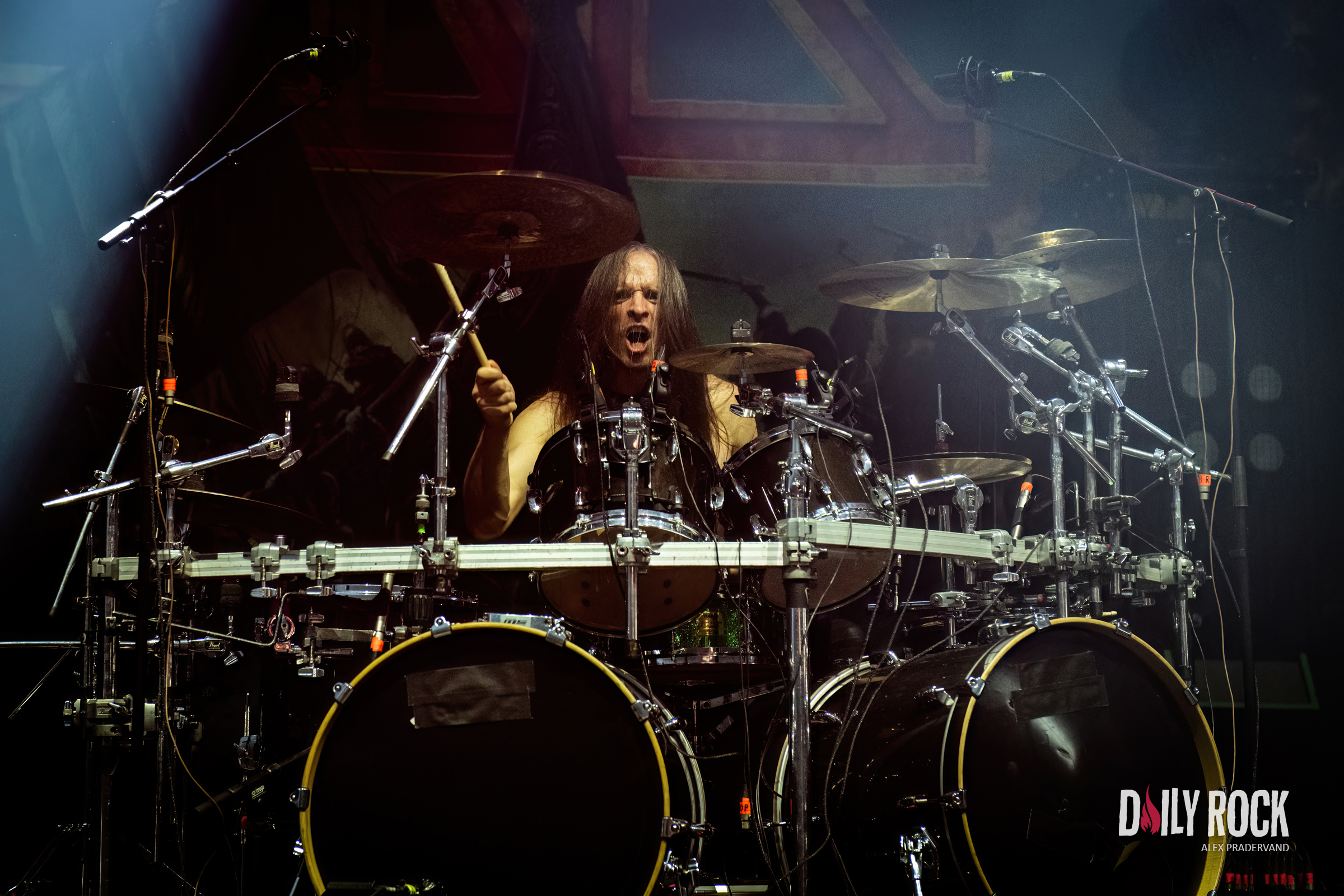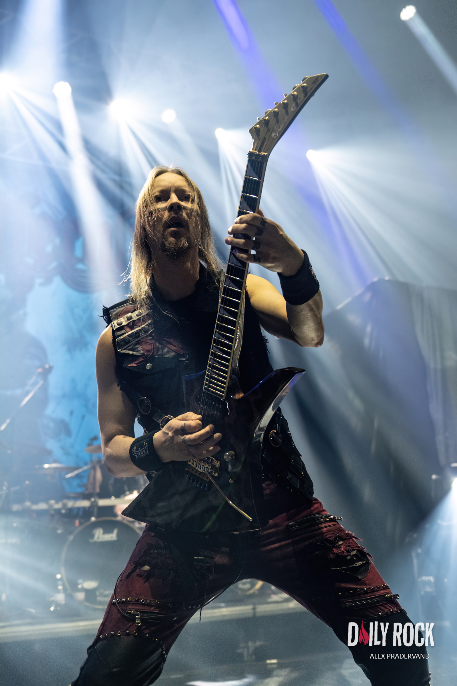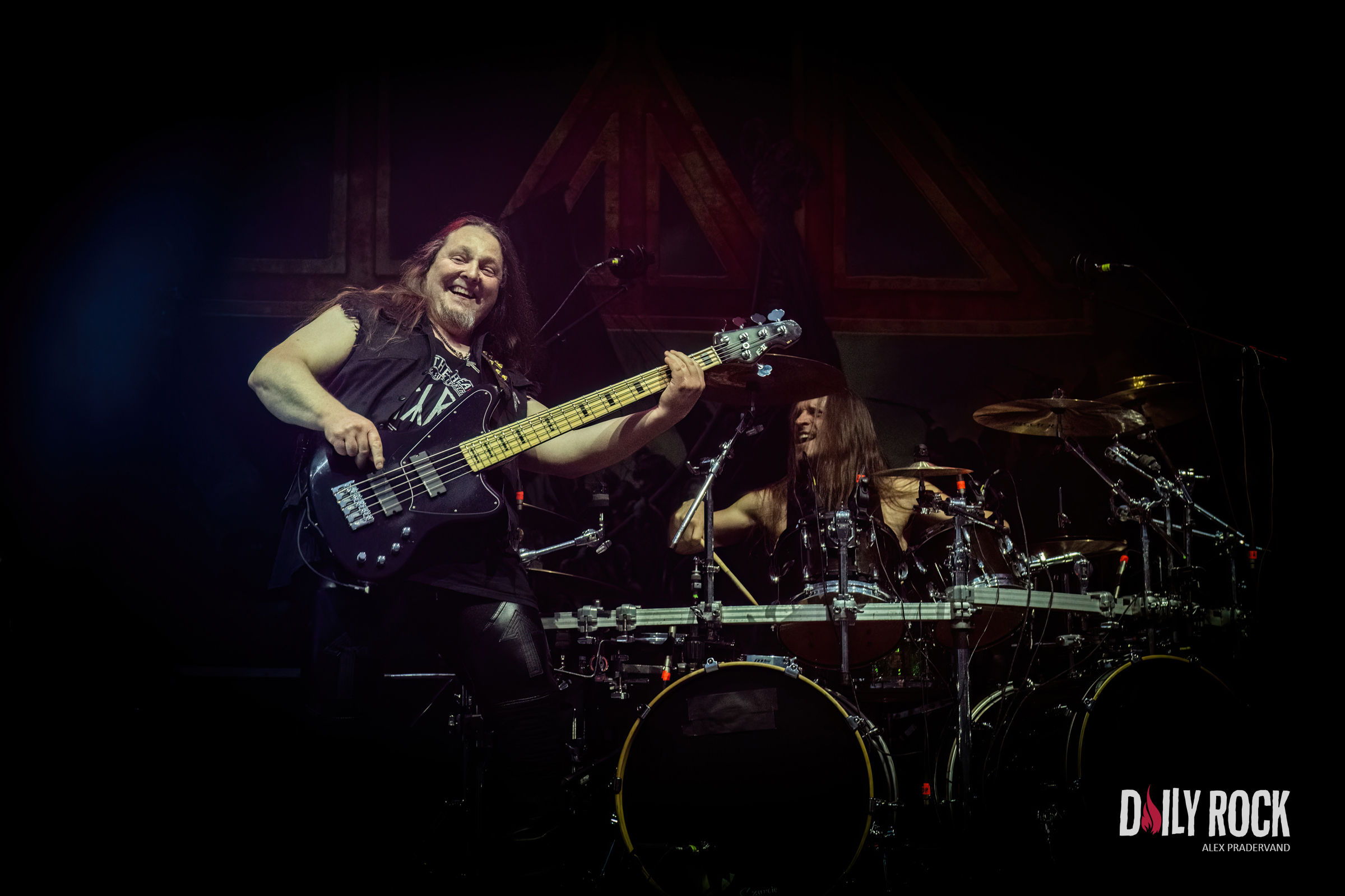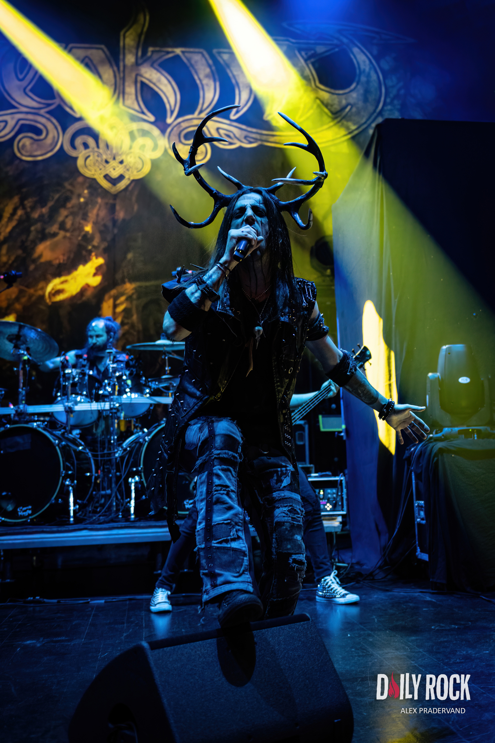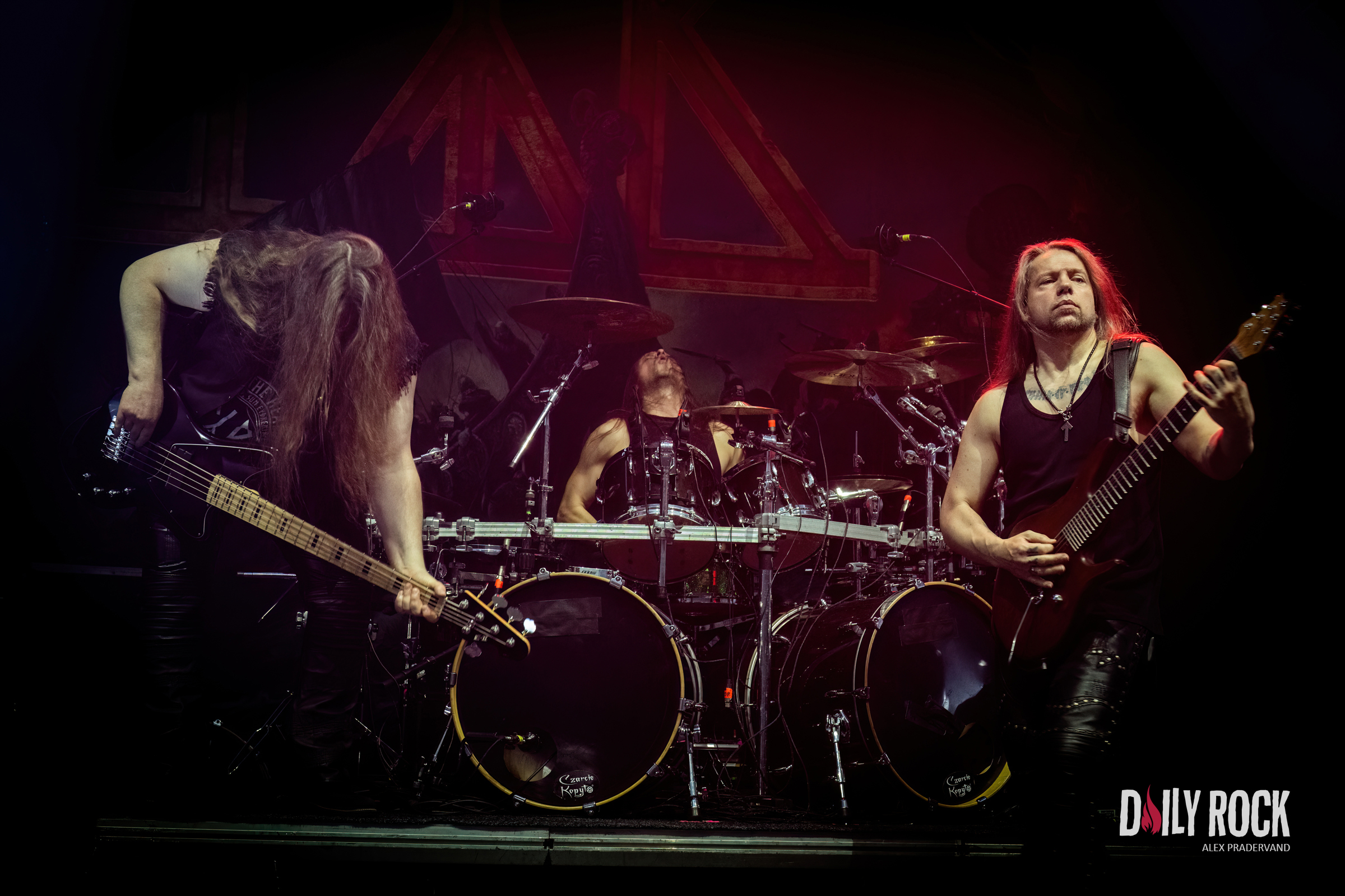D’ailleurs il l’heure d’aller se ravitailler, tout en trépignant d’impatience pour Ensiferum qui se prépare. Avant-dernière aventure de la soirée, Ensiferum livre son metal aussi death qu’épique. Leur discographie étant composée de morceaux soit mélodiques, soit folkloriques, soit les deux, les Finlandais n’ont qu’à annoncer un titre pour que la foule saute déjà en rythme. Surtout lorsque le morceau a, pour citer Petri, « plusieurs noms, mais je sais qu’entre vous, vous l’appelez « Ta-tadadaaa, ta-tadadaaa ! » » (eh oui, les Finlandais peuvent aussi avoir de l’humour, et ça fonctionne). Lorsqu’il ne fait pas de pogos ou des circle pits qui font la moitié de la salle, le public s’assied et rame pendant de longues minutes. Il paraît que c’est bon pour le cardio, tant mieux. On note beaucoup de variété dans les morceaux, tirés de périodes différentes et avec une alternance des chanteurs (Petri bien sûr, mais beaucoup de Pekka et de Markus). Pas de fausse note pour Ensiferum, donc : ambiance au top, enchaînement de tubes (Lai Lai Hei, Andromeda, Iron évidemment), membres du groupe tout sourire malgré les grimaces guerrières de rigueur pour le show. Le balcon rempli de personnes assises jusque-là est désormais constitué lui aussi d’une barrière humaine qui scande les refrains et le nom du groupe.