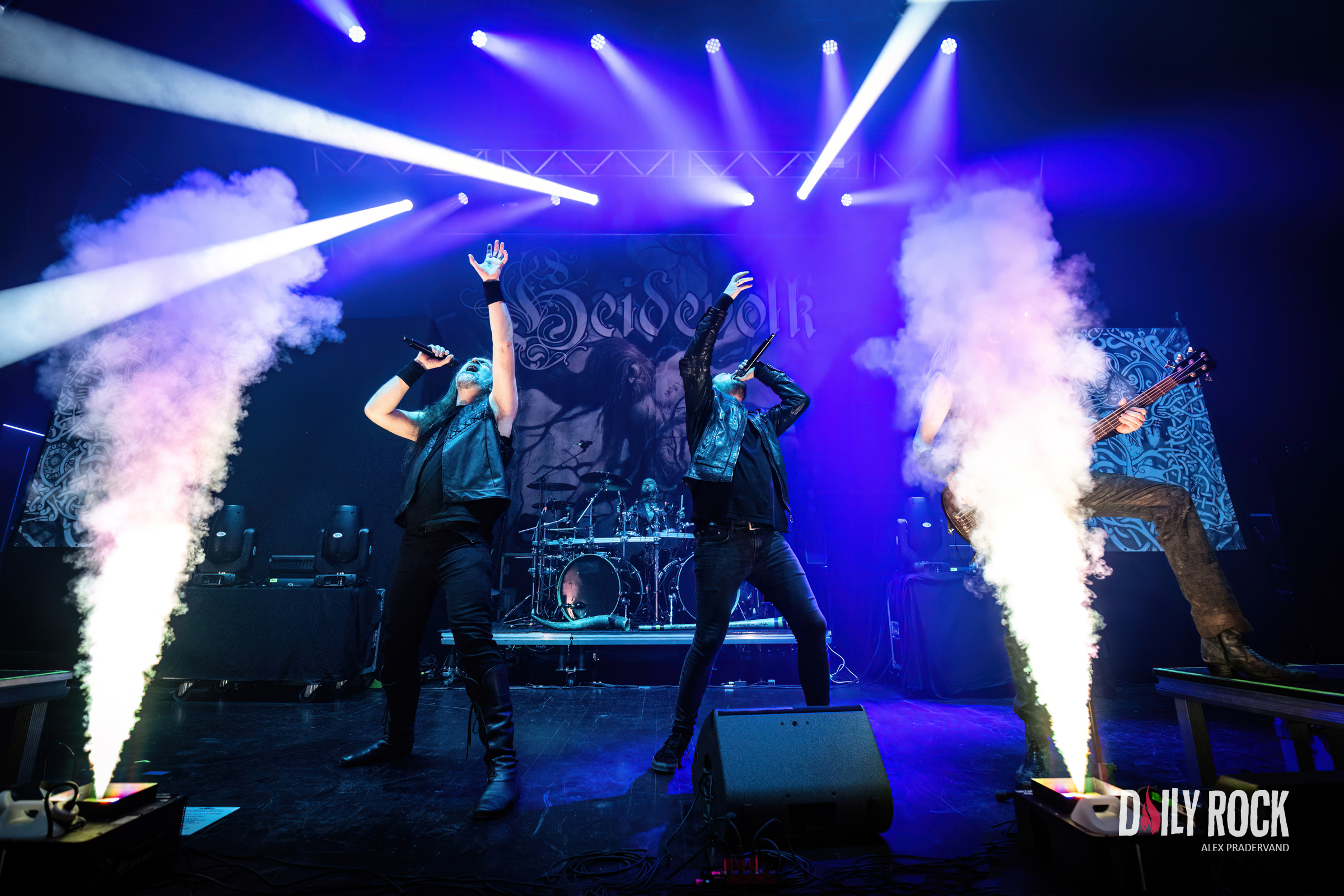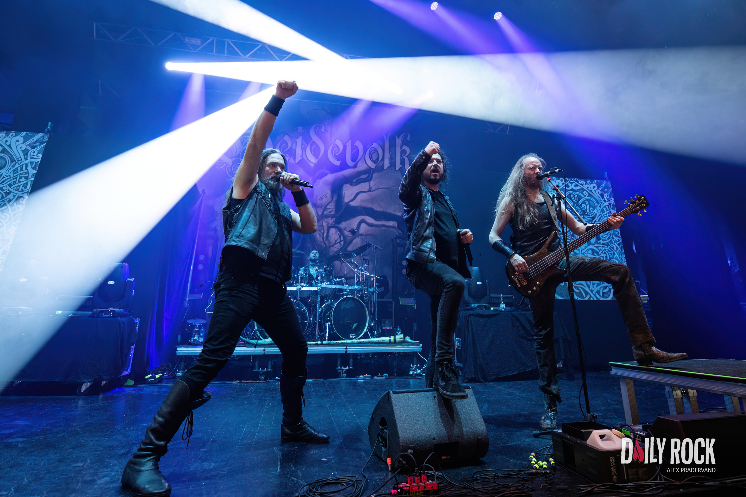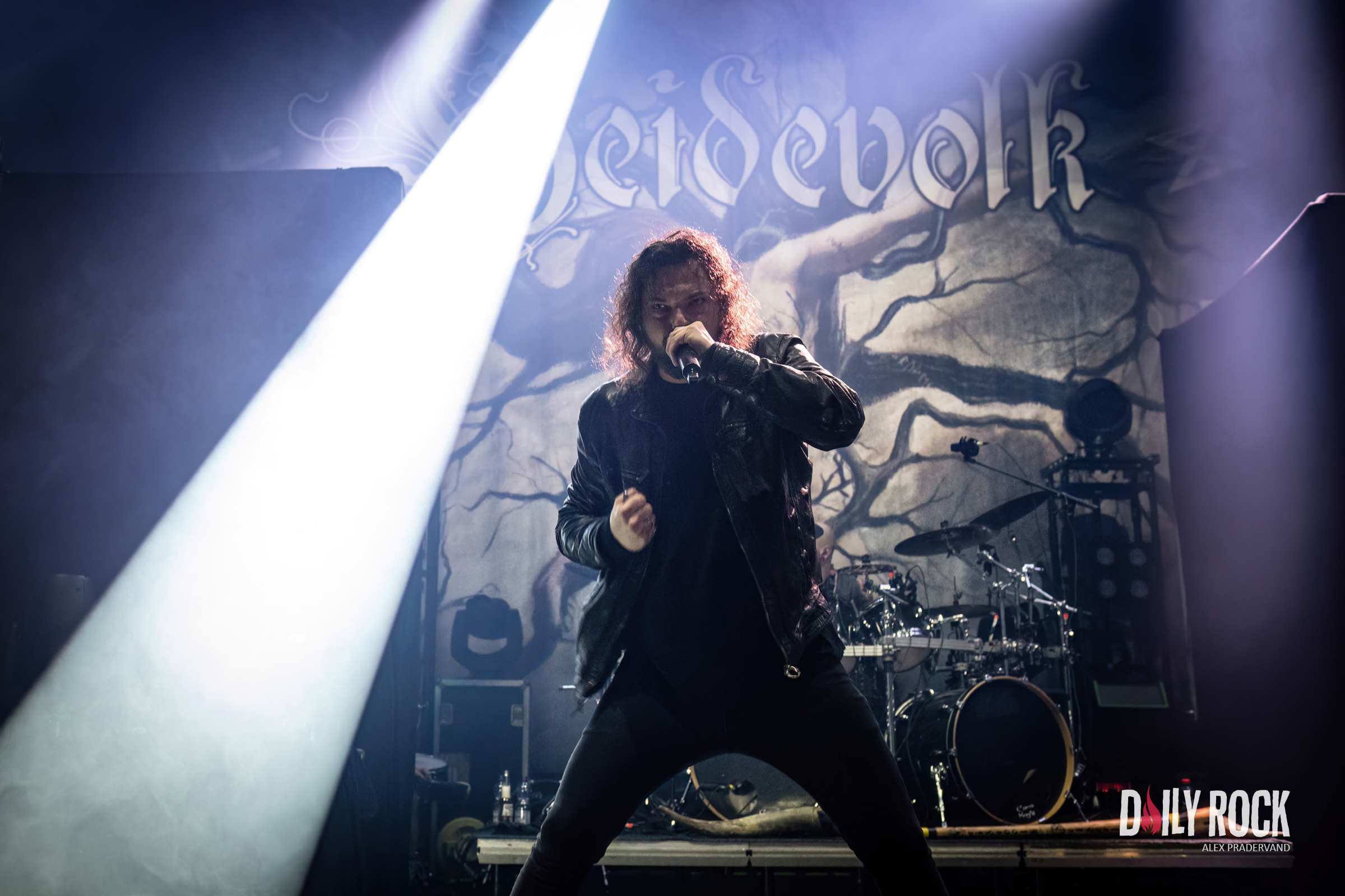 En deuxième affrontement de la soirée, les Néerlandais de Heidevolk apportent leur style hard rock à l’ancienne, sautant de part et d’autre de la scène, avec des vestes en cuir, jouant à la perfection de leur duo de voix très différentes (heavy et baryton). On remarque les premiers circle pits se former pas si timidement que ça, après quelques débuts de pogos qui, si tôt dans la soirée, font plaisir à voir. On accordera d’ailleurs des points bonus au groupe qui a fait l’effort de parler un français très convenable, et a surtout fini sur son morceau qui est un incontournable du genre, pour mettre une ambiance de feu : Vulgaris Magistralis (autrement connu sous le nom « ahou, ahou, ahou ! »).