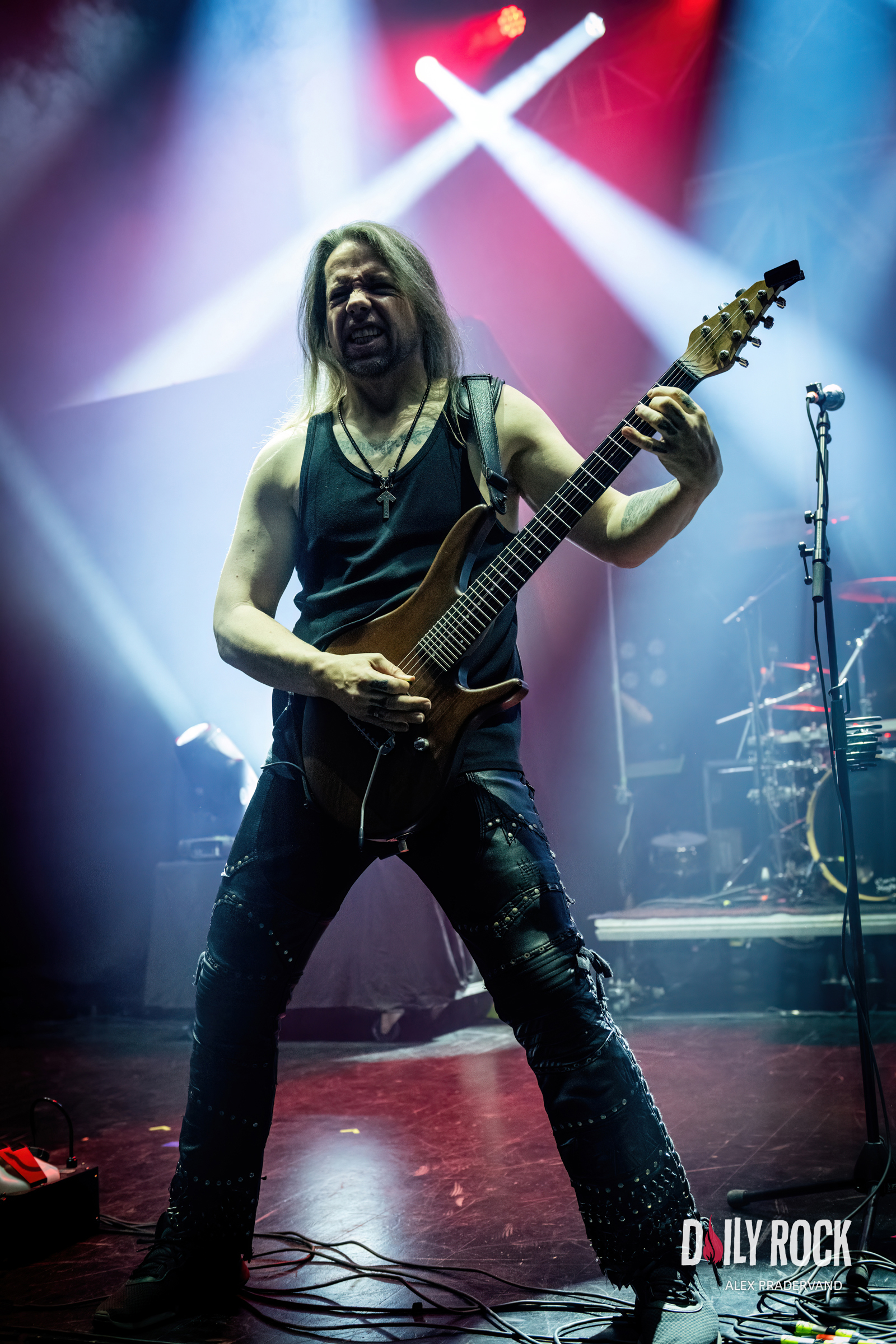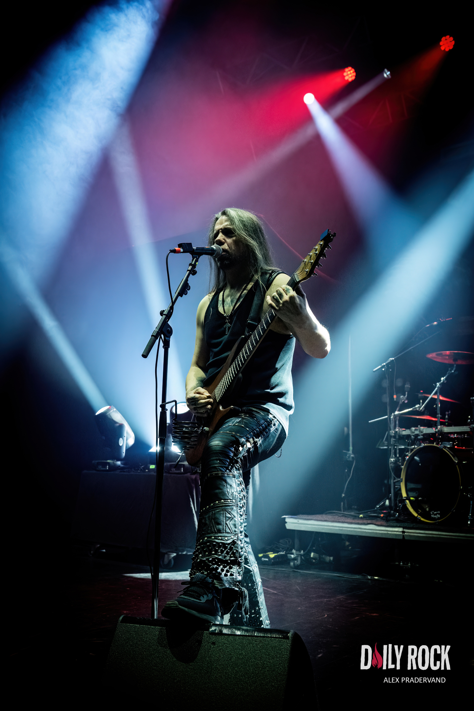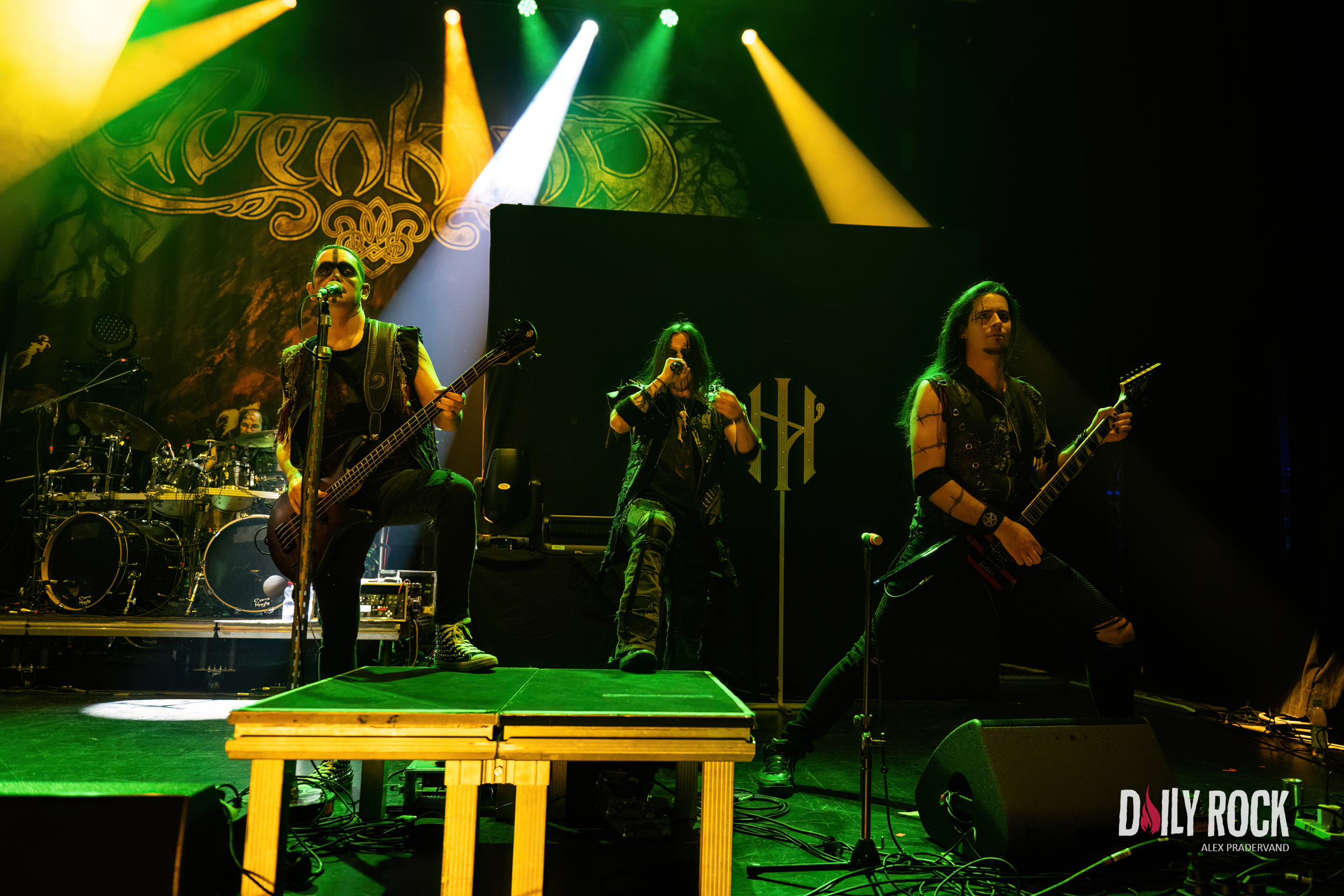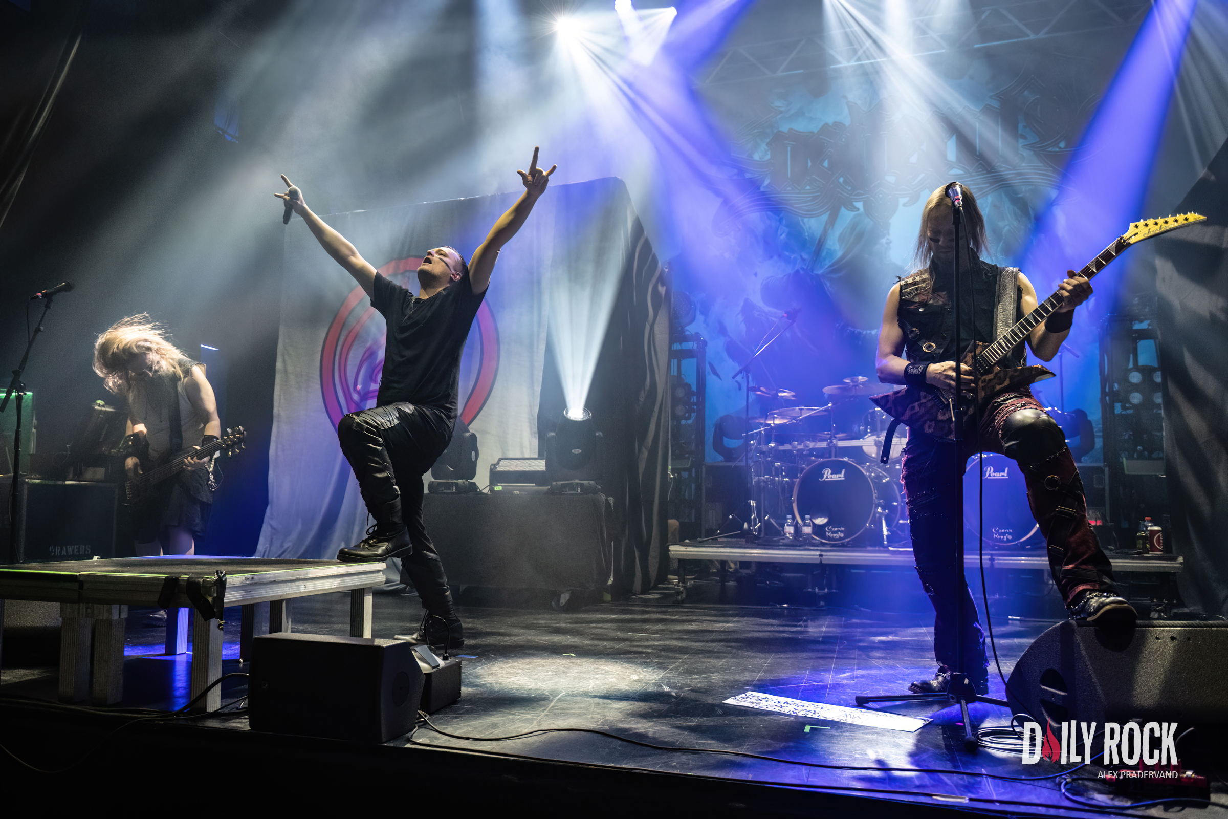 Celles et ceux qui n’avaient pas pensé à prendre leur épée et leur cape en fourrure au bureau devront faire la soirée sans, comme moi, mais ça n’empêche pas d’apprécier Elvenking, le premier groupe, du power metal italien s’inspirant de la fantaisie (elfes, magie, druides…). Ce qui empêche d’apprécier Elvenking, par contre, c’est un problème technique pour un demi-morceau sans son – ce qui a permis de nous prouver, au moins, que le groupe ne joue pas en playback, si jamais on avait un doute. Ils sont très compétents, carrés, charismatiques, et jouent avec le public avec une belle aisance. On ressent leur bientôt 30 ans de carrière. Le public est certes parsemé mais a du répondant, ce qui annonce du bon pour la suite.
