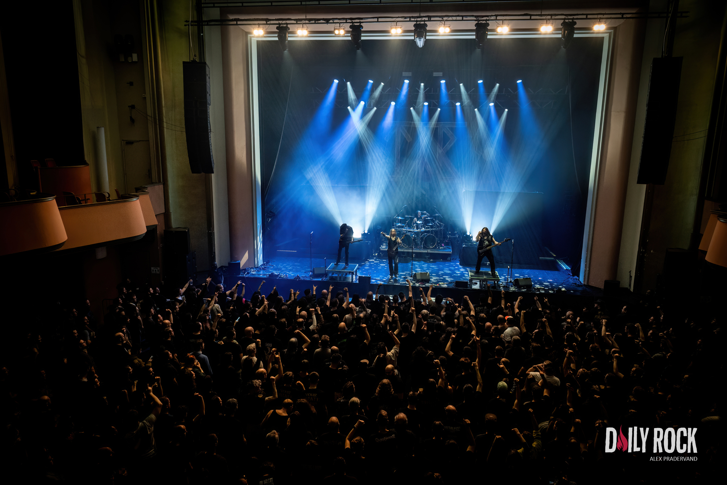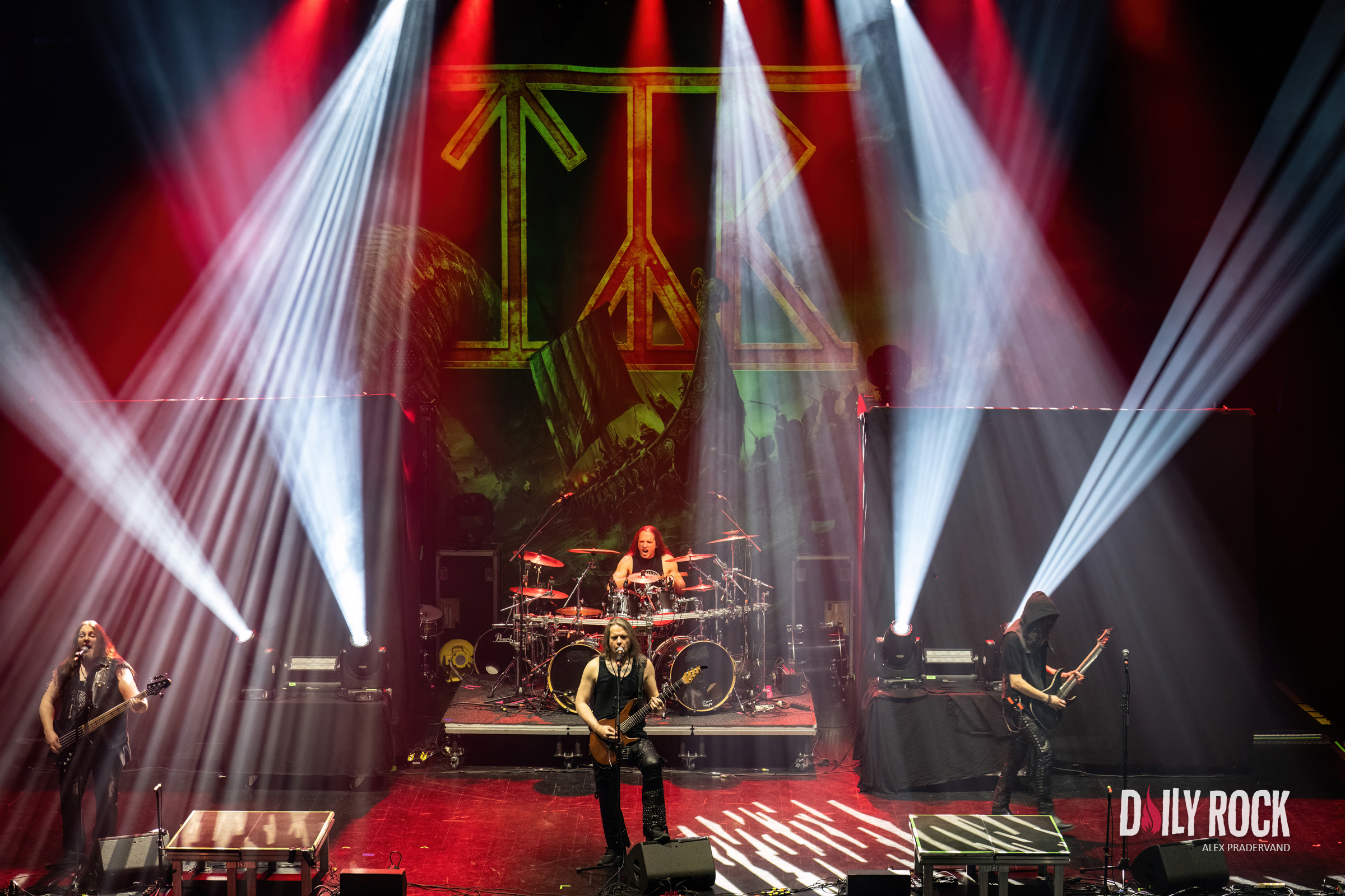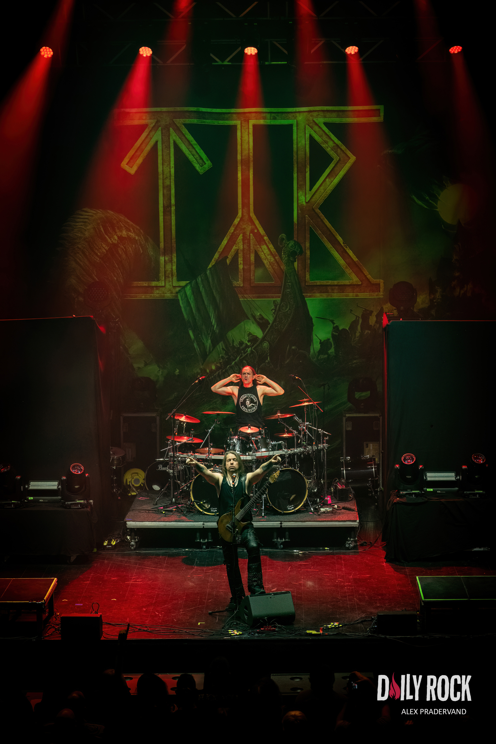 La salle s’est bien remplie entre-temps, on commence même à sentir l’odeur de transpiration. La queue pour aller prendre une bière avant Týr est si longue que le dilemme se pose : rater le début, ou ne pas avoir de bière ? C’est là qu’on remarque les amis en or, qui se sacrifient pour les autres. C’est aussi là qu’on remarque que la salle du Métropole n’est pas rôdée pour les concerts de metal (où le débit de bière n’a d’égal que le niveau des décibels). J’entends au loin les prémices de la guerre pour la place du milieu, le troisième concert sur cinq. J’en vois finalement la majeure partie, mais l’accès aux premiers rangs devient difficile tant le public se densifie. Les riffs épiques portés par les Féroiens féroces qui chantent en chœur en imposent, sans décor grandiloquent, ni maquillage ou costume spécial. Ici, on impose en toute sobriété. Les jeux de lumière suffisent à mettre en valeur le groupe et sa musique. Entre le charisme du bassiste qui ne boude pas son plaisir d’être là, et le doigté précis et incisif du second guitariste dont la capuche nous empêchera de voir son visage tout du long (ce n’est pas grave, on regarde surtout ses mains), je comprends que la foule en délire en vienne à déchirer par accident la moquette qui recouvrait le parquet de la salle. Deuxième preuve que le Métropole n’est pas prêt à accueillir les hordes de barbares que nous sommes.