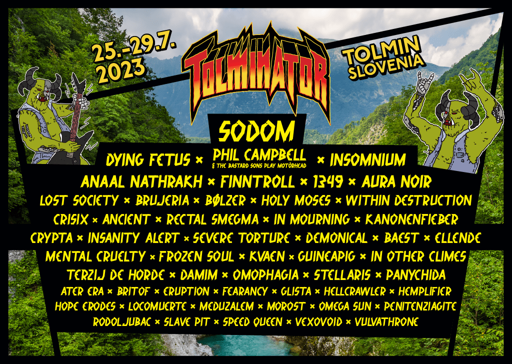Neuvième étape de notre roadtrip, le Tolminator, comme son nom l’indique, se déroulera à Tolmin en Slovénie du 25 au 29 juillet prochains. Beaucoup de festivaliers amateurs du MetalDays ont été déçus du changement de l’emplacement du-dit festival, dû à son expansion. Le Tolminator comble cette demande en proposant un évènement similaire à plus petite échelle, limité à 5’000 visiteurs. Les habitués de l’endroit seront donc ravis de retrouver le cadre paradisiaque du festival, entouré de champs, de forêts et de la fameuse rivière Soča qui longe le site permettant de se rafraîchir ou de participer à la traditionnelle descente de rivière en bouée.