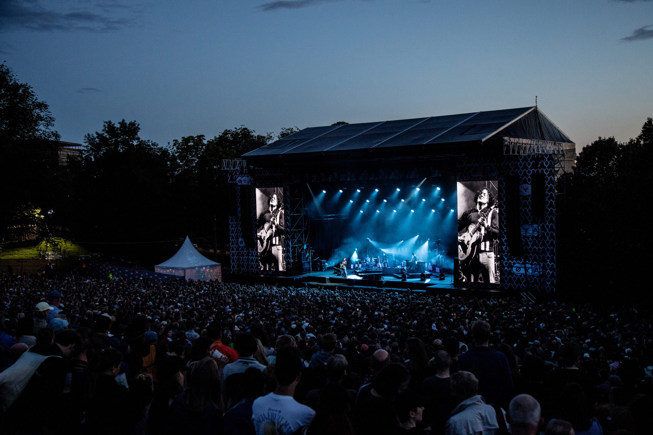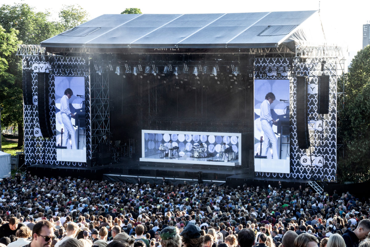 Sur la grande scène, plus tôt dans la soirée (qui sous ces latitudes, il faut le dire, se déroule presque intégralement en plein jour) s’étaient ramenés les deux dandy frenchy tout de blanc vêtus Nicolas Godin et Jean-Benoît Dunckel pour y jouer en intégralité leur album Moon Safari. Je l’avoue, j’y suis passé en courant d’Air, principalement pour écouter les tubes Sexy Boy et Kelly watch the stars, heureusement placé au début du disque. Là aussi le décor était très beau, un grand cadre blanc bardé d’écrans LED. La grande scène du Øya, ayant la particularité de faire face à un immense talus tout en pente fort propice à une contemplation décontractée à distance (bien plus qu’aux pogos furieux, très déconseillé sous la pluie), se montra parfaite pour le show des spécialistes français des ambiances feutrées. Mais pour votre serviteur 20 minutes de langueurs méditatives furent suffisantes à son bonheur.