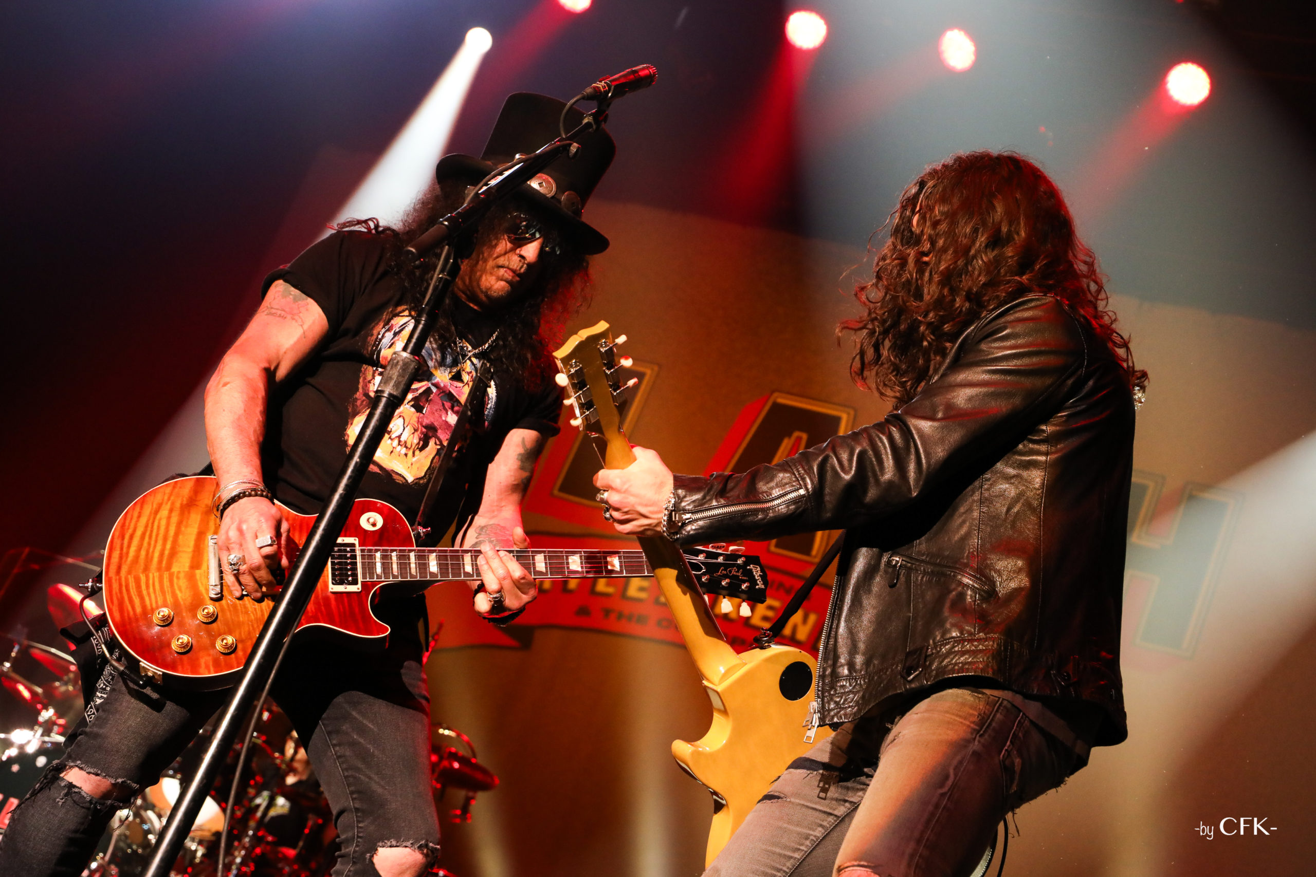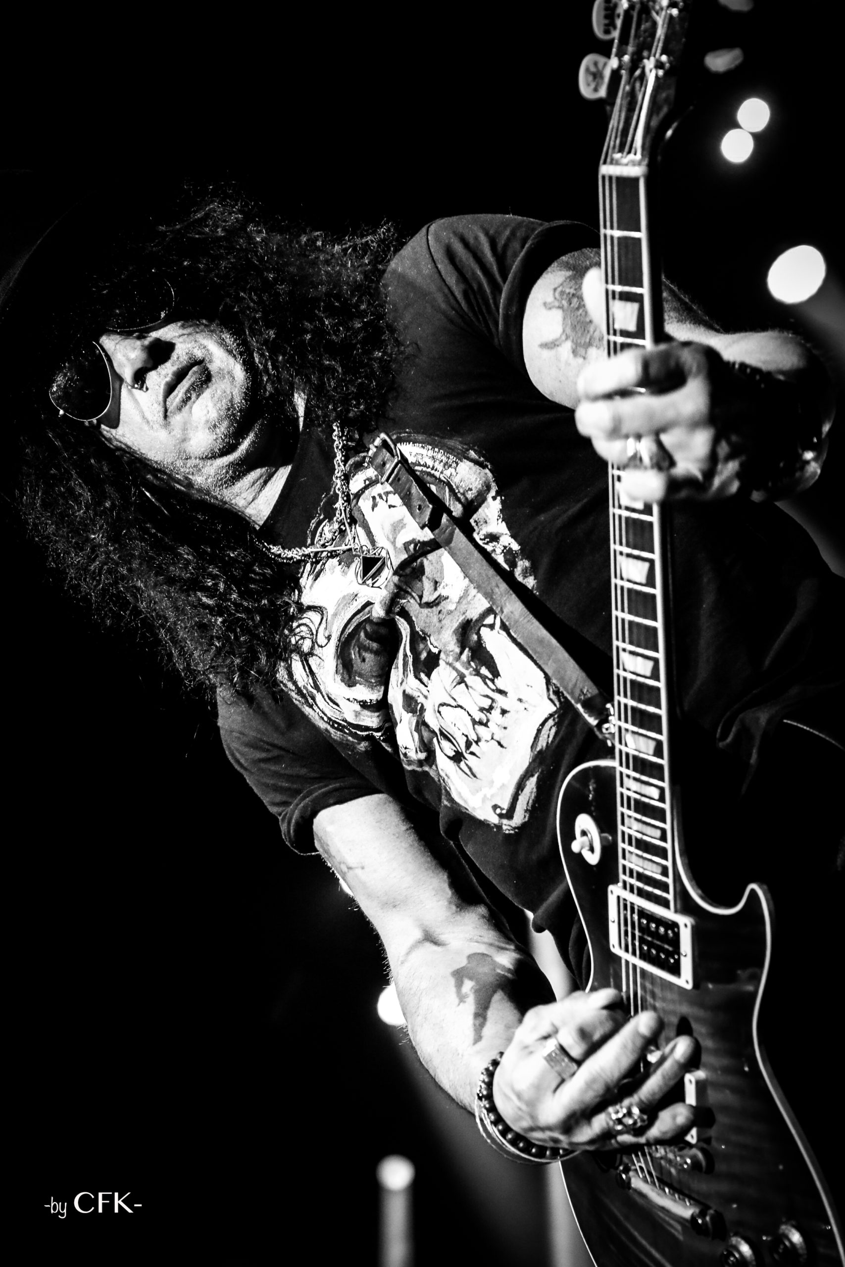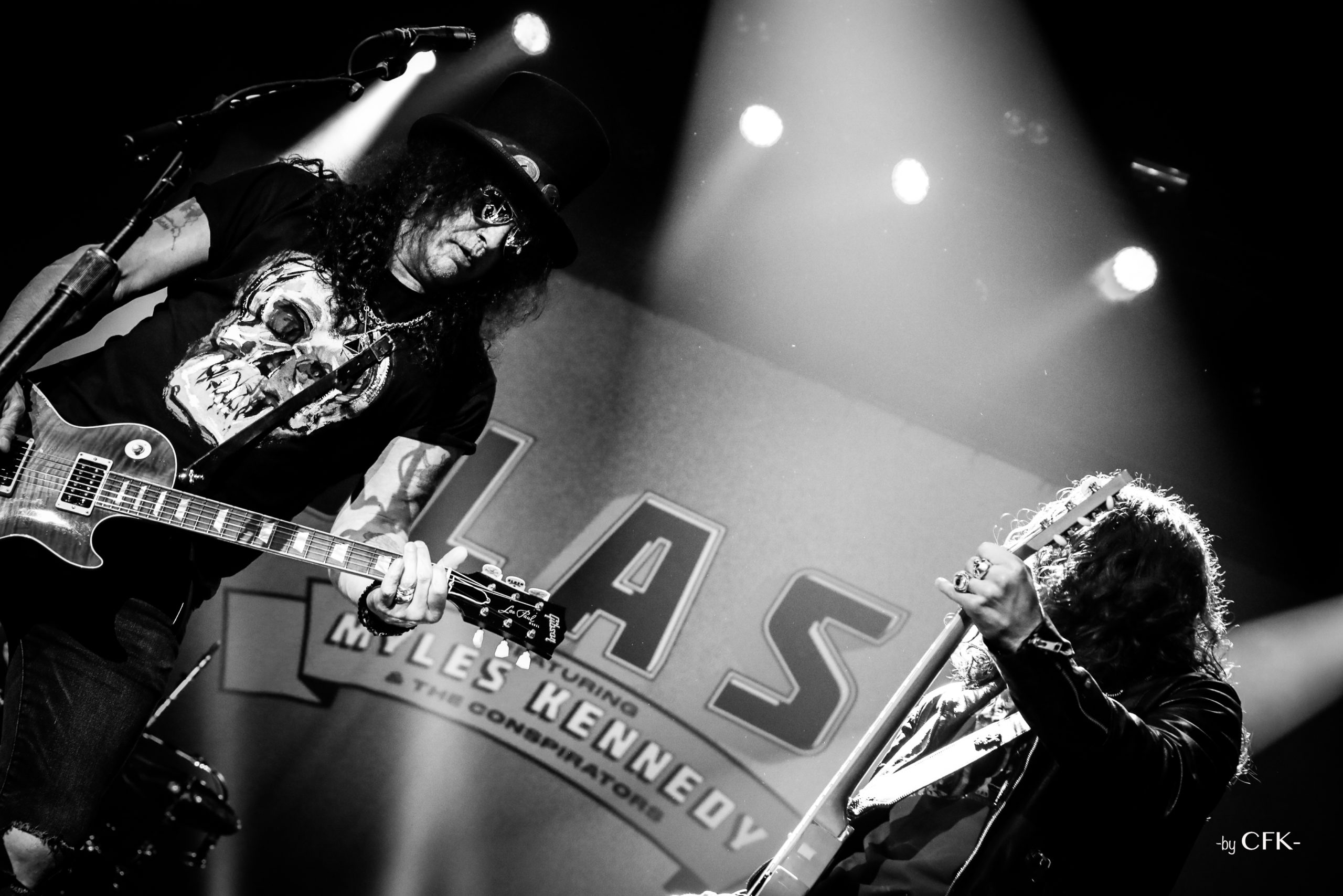 Et puis, après quelques minutes de changement de scène, c’est le Maestro qui arrive sur scène : Slash ! Un Slash en grande forme tout comme ses comparses sur scène : Myles Kennedy et les Conspirators. A noter d’ailleurs un second show pour le guitariste Frank Sidoris qui a déjà joué ce soir avec Mammoth. Et le groupe attaque directement avec ses titres phares comme « The River is Rising », « Driving Rain », ou encore ‘Back from Cali’. Un Slash toujours austère avec ses lunettes noires et son chapeau haut de forme mais aussi toujours plein d’énergie et des solos à couper le souffle pour le plus grand plaisir des fans qui exultent. Le bassiste Todd Kerns prend aussi le mirco pour quelques chansons et pose une voix parfaite sur des titres comme ‘Always on the run’ morceau coécrit par Slash (avec Lenny Kravitz), « Perfect Crime » ou encore le célèbre « Dr Alibi ». Mais la voix principale de ce combo est celle de Myles Kenedy qui fait toujours des prouesses vocales tout en affichant un sourire qui fait plaisir à voir. ‘Bent to Fly’, ‘April fool’, ‘Starlight’, ‘Wicked stone’. Les hits s’enchainent impeccablement avec une énergie communicative. Moment sympa avec la dédicace sur ‘Fill my world’ à tous nos animaux. Au lieu d’allumer la lumière des smartphones, on a droit ici a une forêt de fond d’écran avec nos animaux de compagnie. Petit clin d’œil toujours sympa, moment de communion avec le public. ‘You’re a lie’ et ‘World on fire’ termineront la première partie du concert de ce soir. Puis évidemment un rappel avec les titres ‘Rocket Man’, célèbre chanson d’Elton John, et le très attendu ‘Anastasia’. Le public chante à l’unisson cette chanson culte du groupe et la Rockhal finit de s’embraser sur des riffs transcendants du sieur Slash. Après un salut, un jet de médiators, et un magnifique poirier du guitar-hero, les lumières se rallument et le public quitte les lieux, sourires aux lèvres et notes dans le cœur. Un très bon concert, sans artifice, sans démesure à l’américaine mais avec un talent indéniable et un bon rock entrainant. On a hâte de revoir ces messieurs avec un nouvel album et de nouveaux titres live ![ MD]
