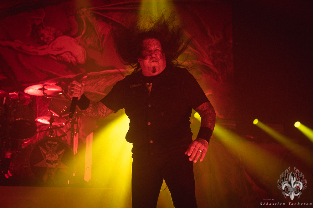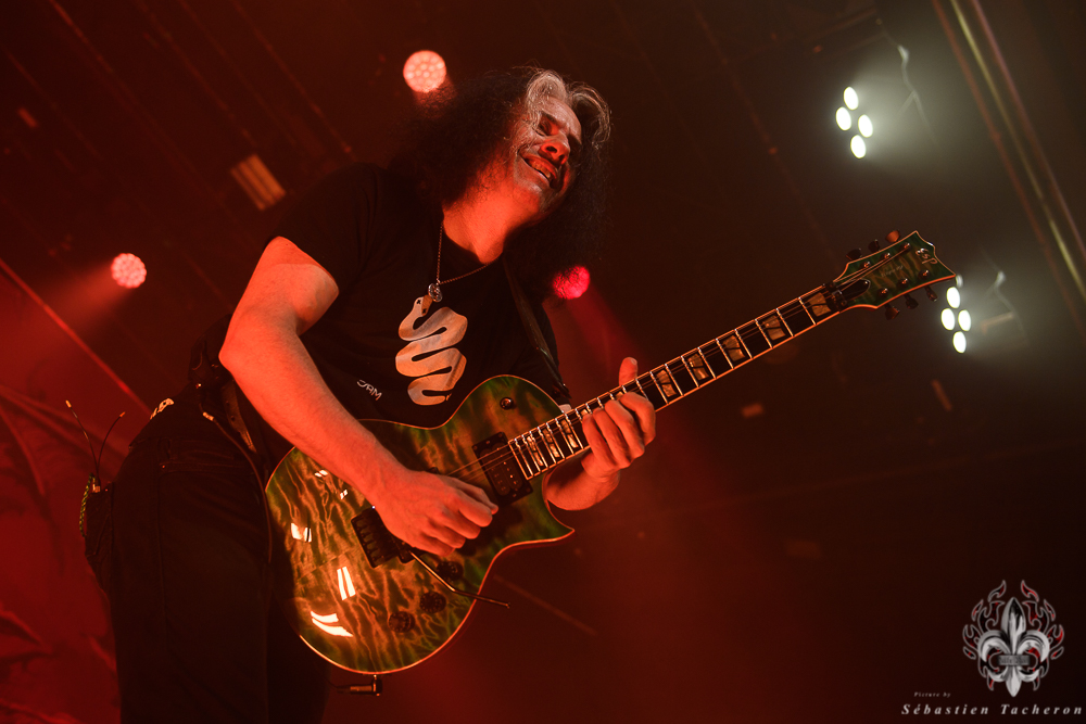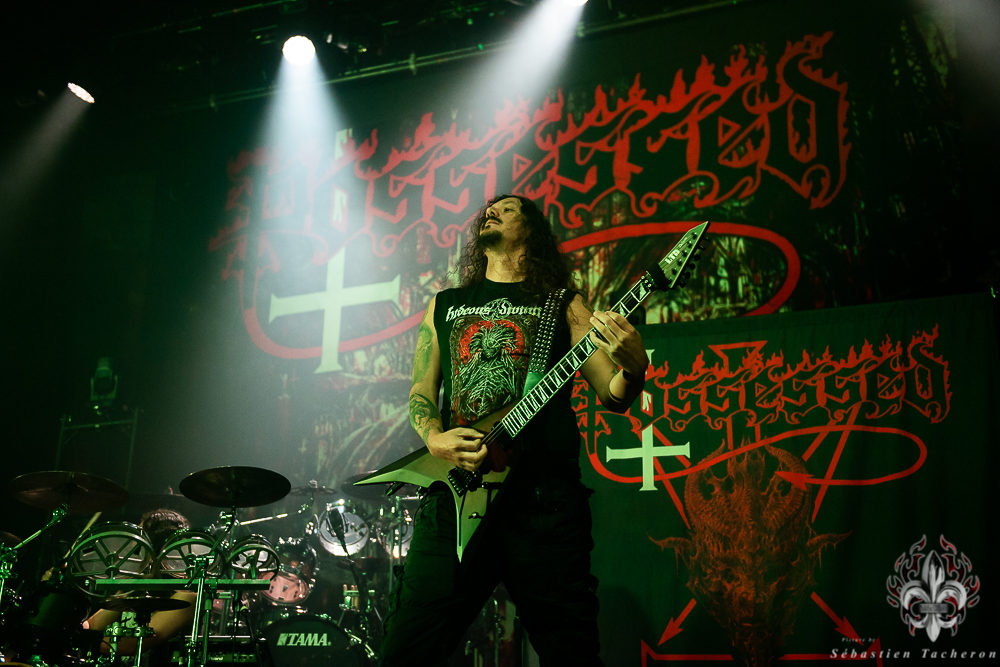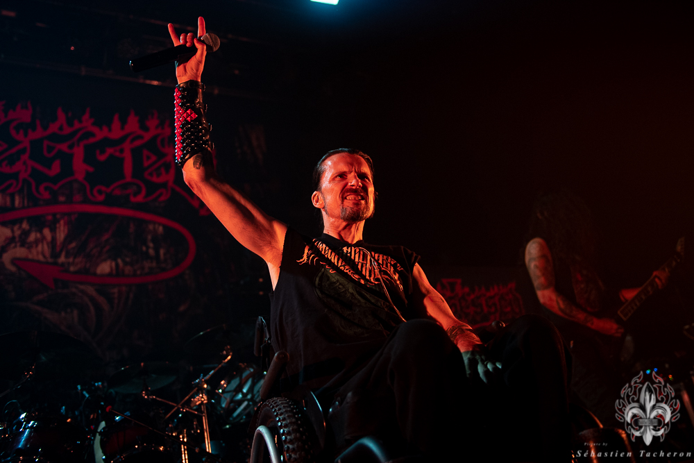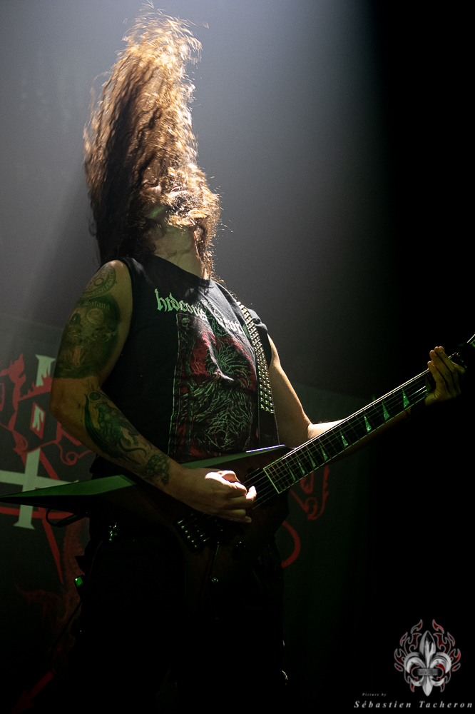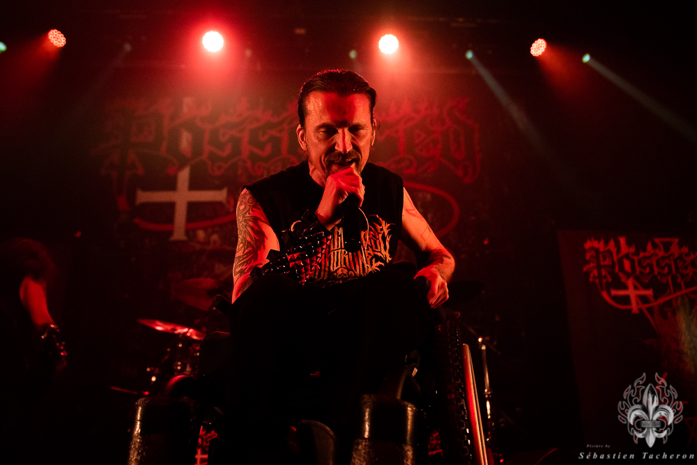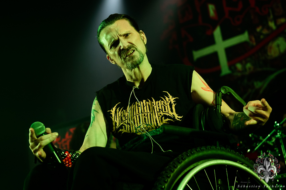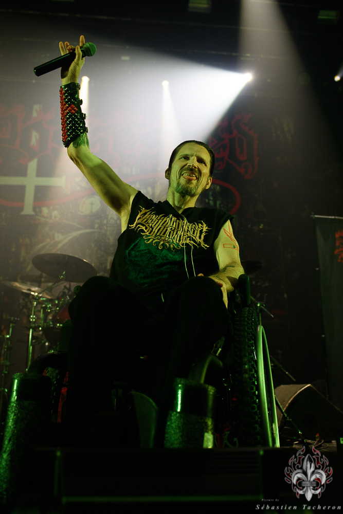 C’est Possessed qui lance la soirée même s’ils n’ont pas eu la carrière et surtout le succès qu’ils auraient dû avoir. Les musiciens arrivent sur scène, Jeff Becerra quant à lui, arrive sur son fauteuil roulant. Ceux qui connaissent bien le groupe sont au courant de son histoire et on ne la refera pas. Juste pour dire qu’il a pu remarcher (avec l’aide de jambes robotisées) il y a environ 3 ans. Jeff est d’ailleurs le seul membre original du groupe qui ont sortis en 1985 Seven Churches qui est considéré comme étant le premier album de death metal de l’histoire. Pendant toute leur trop courte prestation, Revelations of Oblivion, leur dernier album, et Seven Churches sont bien sûr mis en avant. C’est vraiment agréable d’entendre les vieux classiques du groupe, avec un son vraiment puissant. Jeff a eu quelques soucis d’oreillette tout le long du concert. C’est pour le titre The Exorcist, qui était attendu des fans, que son micro a décidé de rendre l’âme. Pour moi, c’était une belle découverte et un excellent concert qui a bien lancé cette soirée.