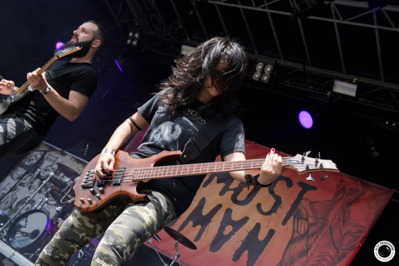 Au bout d’un moment, j’engage la conversation avec elle et elle m’apprend qu’elle vient d’intégrer Almøst Human comme bassiste. C’est donc son premier concert avec le groupe et elle commence direct avec le Greenfield ! Sympa le cadeau de bienvenue. En tous les cas bravo à elle car cela s’est super bien passé. Le groupe joue en plein soleil et arrive à attirer une jolie foule de curieux qui ne cessera de s’agrandir tout au long du set. La scène est plus grande que le tout le Bleu Lézard, mais elle est bien occupée par les musiciens. En faisant des photos, je vois que Gilles a tendance à rester sur le devant de la scène en plein soleil. Il me dira après le concert que s’il s’éloignait de cette zone, il perdait le contact avec ses retours et qu’effectivement il avait eu bien chaud. Pour ma part, j’ai eu l’occasion de shooter aussi depuis la scène, donc j’ai enfin eu des photos potables de Rosario.