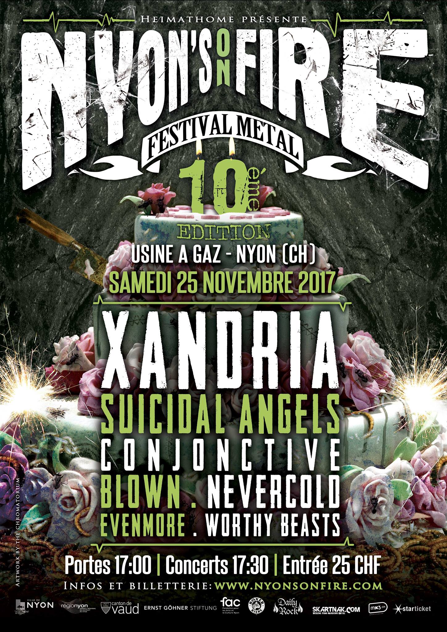 Heimathome, qui organise l’évènement a mis le paquet pour cette édition anniversaire qui s’annonce des plus brûlantes ! Ils vous présentent Xandria, Suicidal Angels, mais n’oublient évidemment pas les talents locaux, avec par exemple Conjonctive ou Evenmore ! Tout ce beau monde pour seulement 25.- ça ne se refuse pas !