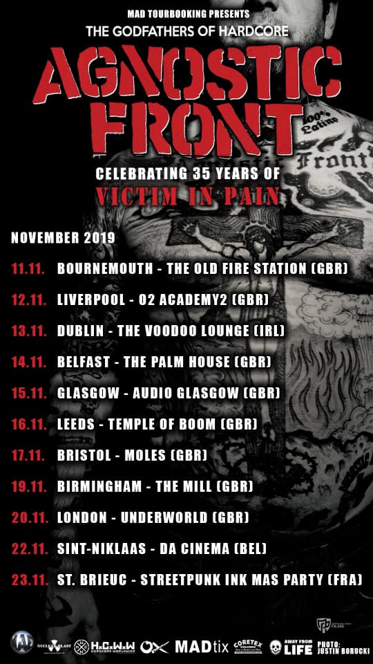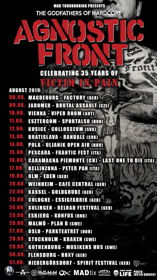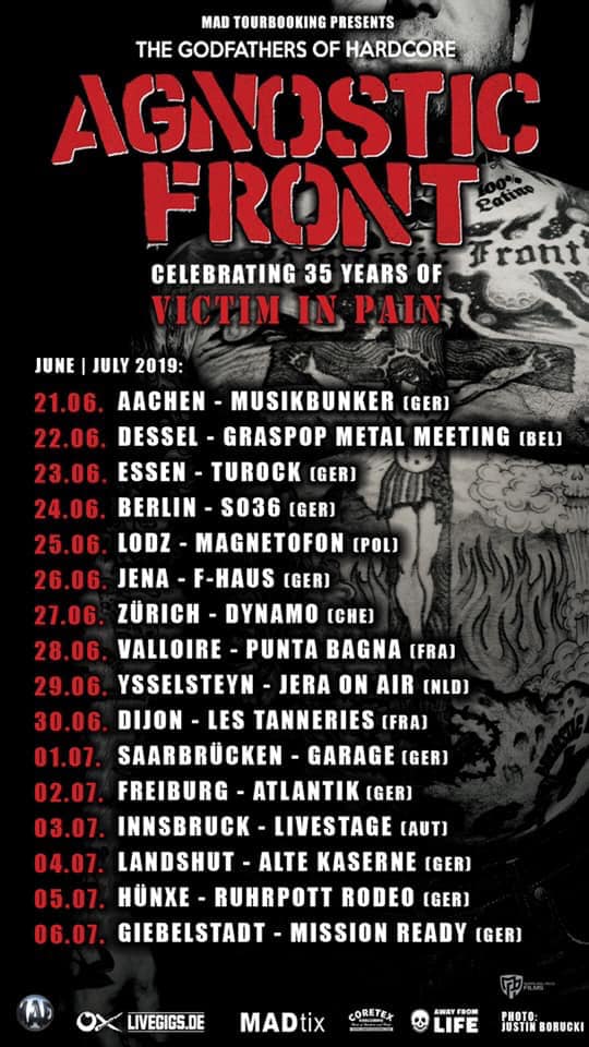 Les pionniers légendaires du punk hardcore new-yorkais Agnostic Front ont annoncé une tournée européenne cet été, afin de célébrer les 35 ans de leur premier album « Victim In Pain », sorti en 1984. Ils étaient de passage pour l’occasion au Dynamo de Zurich le 27 juin dernier.