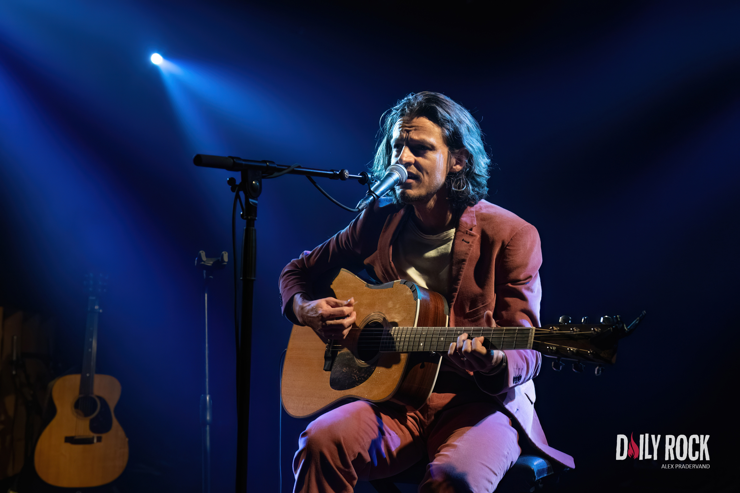 Le parterre met du temps à se remplir mais il est plein à craquer quand Omar Velasco s’installe sur une chaise et empoigne une de ses guitares acoustiques pour un set intimiste seul face au public. Il chante et joue les yeux fermés parce que, de son propre aveu, il est un peu intimidé par le public, qu’il trouve d’ailleurs très beau.