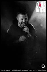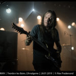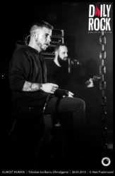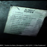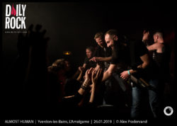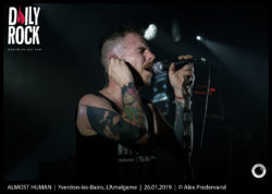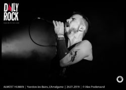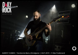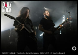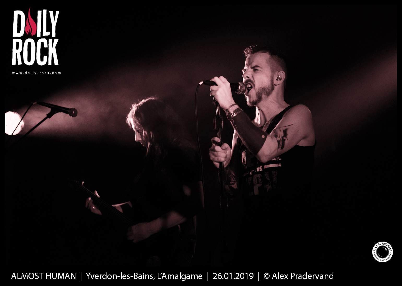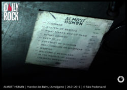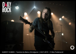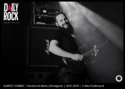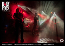 Le temps de saluer un public venu nombreux (salle pratiquement pleine dont un curieux/motivé venu depuis Paris; salut à toi), Almost Human démarre son set avec un peu de retard, mais on ne lui en tient pas rigueur car la performance est intense dès les premières notes. Les deux guitaristes Olivier et Gilles font preuve d’une belle complicité, au point que l’on met du temps à remarquer que personne ne joue de la basse sur scène ce soir ! Au fond de la salle dans un mélange de pénombre et de brouillard (une tradition locale d’Yverdon à ce qu’il paraît), on ne voit guère le batteur non plus, mais on l’entend bien.