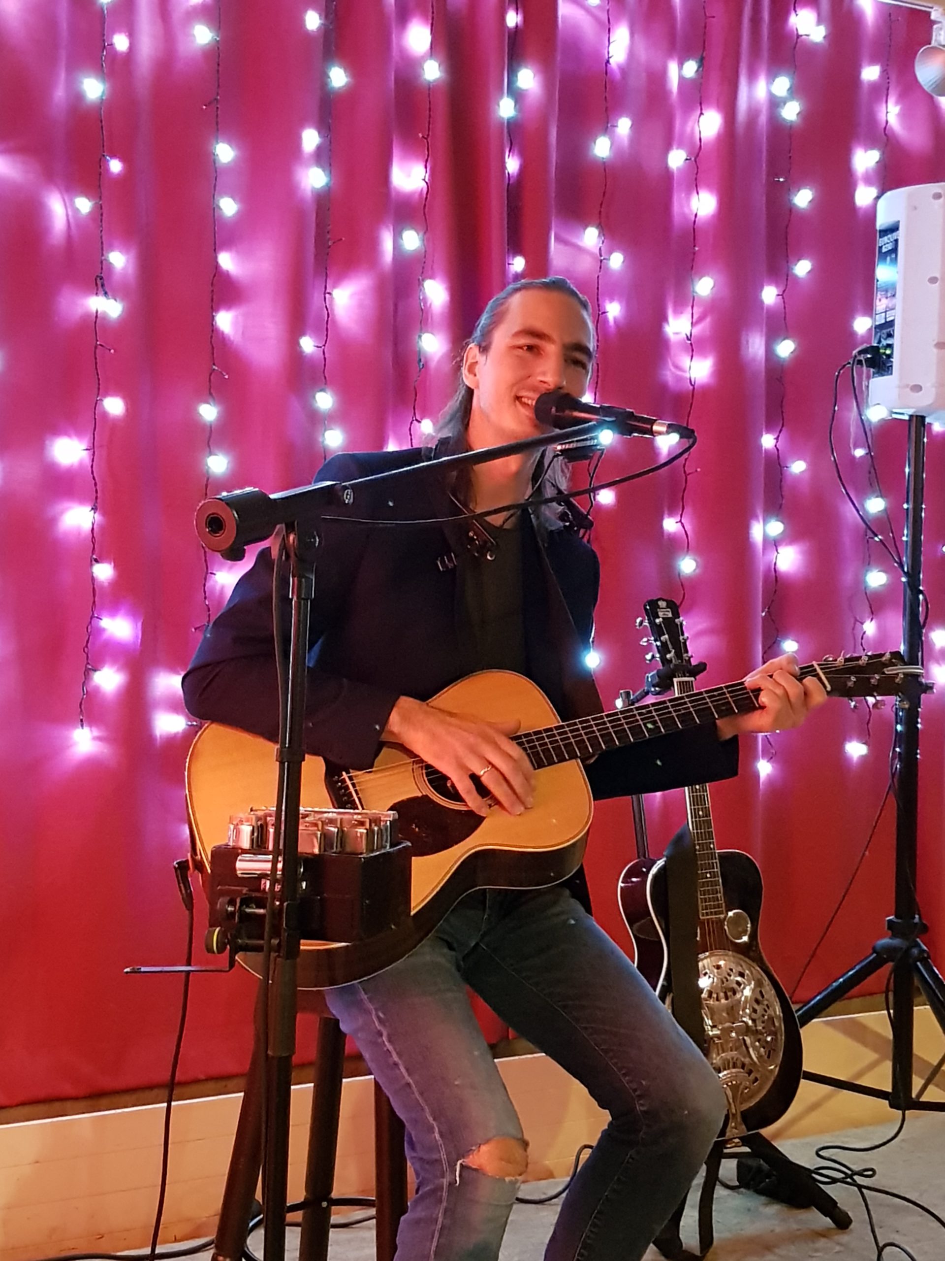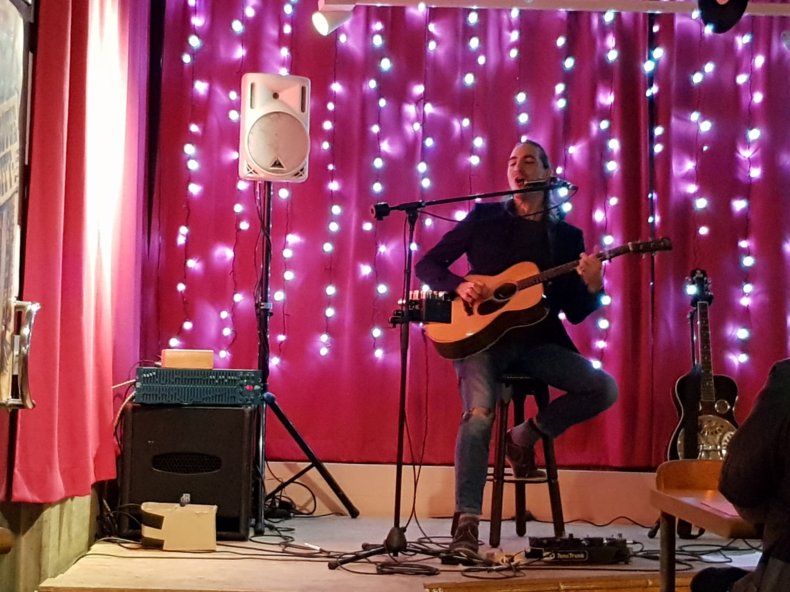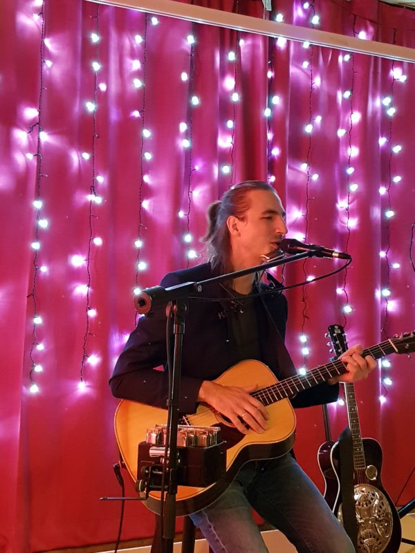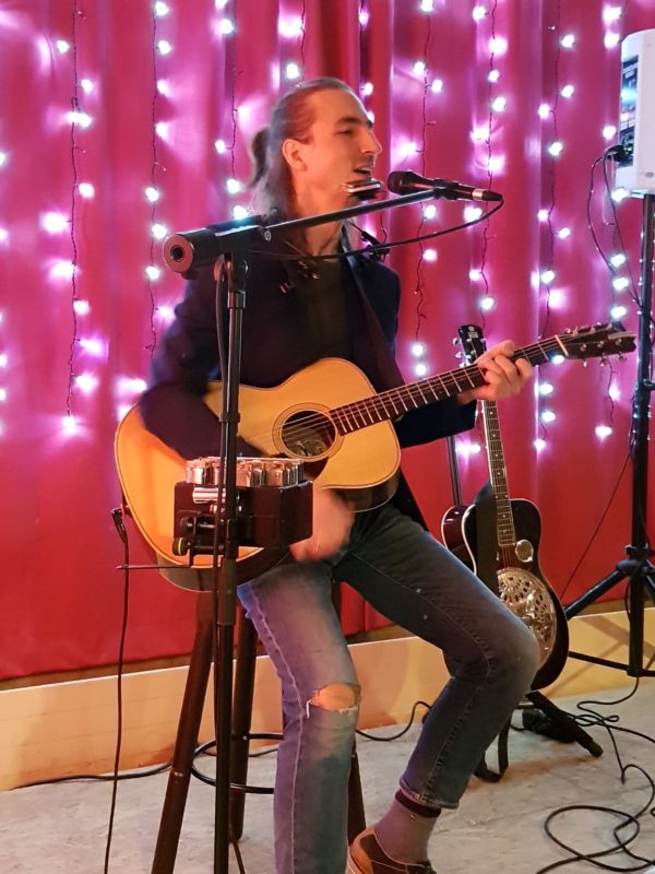 Et voilà que l’espace prend une coloration plus précise lorsqu’Amaury, silhouette filiforme se détachant du rideau fuchsias à lampions, débute son premier morceau. Guitare sèche et harmonica : place au blues acoustique pur sucre. D’entrée, c’est l’univers du Mississippi qui nous prend à bras le corps.