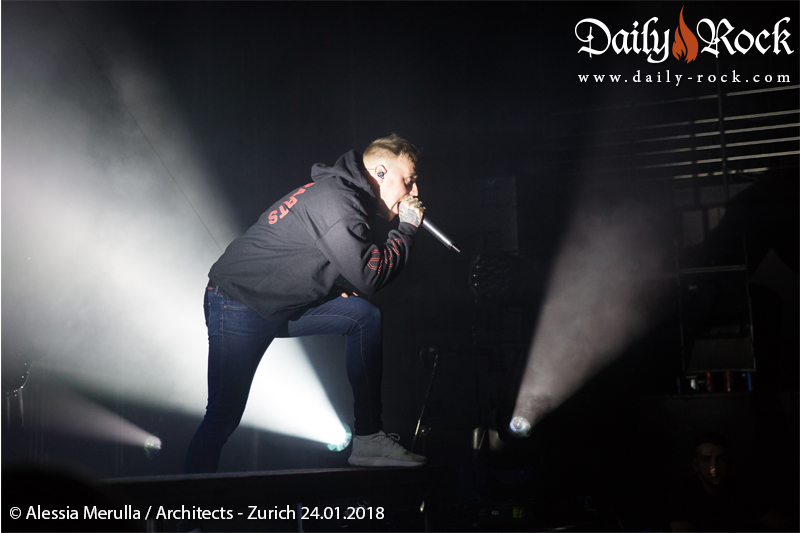 L’excitation est à son comble quand les lumières s’éteignent, lançant l’intro d’Architects. Encapuchonné d’un sweatshirt Counterparts, Sam Carter et sa bande entrent en scène devant une foule en délire. On entend presque plus les fans que le groupe à certains moments, tant ceux-ci s’égosillent pour démontrer leur amour au groupe. Le set est énergique et le partage entre la scène et la fosse magique. Le chanteur nous offre un discours inspirant sur l’état de notre monde, l’unité dont nous devons faire preuve, mais également sur le fait que Trump sera bientôt en Suisse et qu’il faut en profiter pour lui dire ce que l’on pense, avant d’entamer ‘The Devil Is Near’.