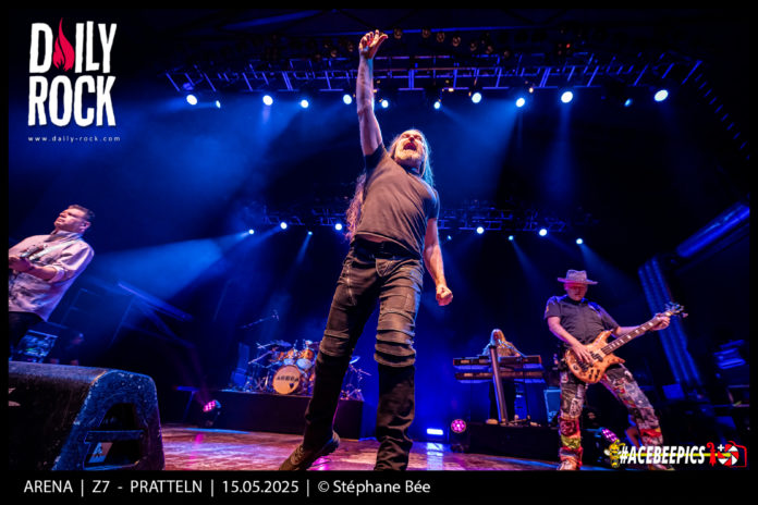 Trois décades (déjà !) qu’Arena, fer-de-lance du courant neo prog aux côtés de Marillion, IQ et Pendragon notamment, arpente les scènes européennes et nous offre des albums aux mélodies sublimes et aux textes bien construits. Accompagnant les pères fondateurs Clive Nolan (Pendragon, claviers) et Mick Pointer (ex-Marillion, batterie), on retrouve avec plaisir John Mitchell (It Bites, Asia, Frost*, Lonely Robot…, guitares et chœurs depuis 28 ans,) Kyle Amos (basse, depuis 11 ans) et Damian Wilson (Threshold, Headspace…), chanteur charismatique, au micro depuis 2020. Arena est l’un des groupes qui a le plus joué à la Z7 (14 fois au moins), autant dire que les fans de Suisse, d’Allemagne et France voisine n’allaient pas manquer de souffler les 30 bougies de cet appétissant gâteau d’anniversaire avec leurs héros.