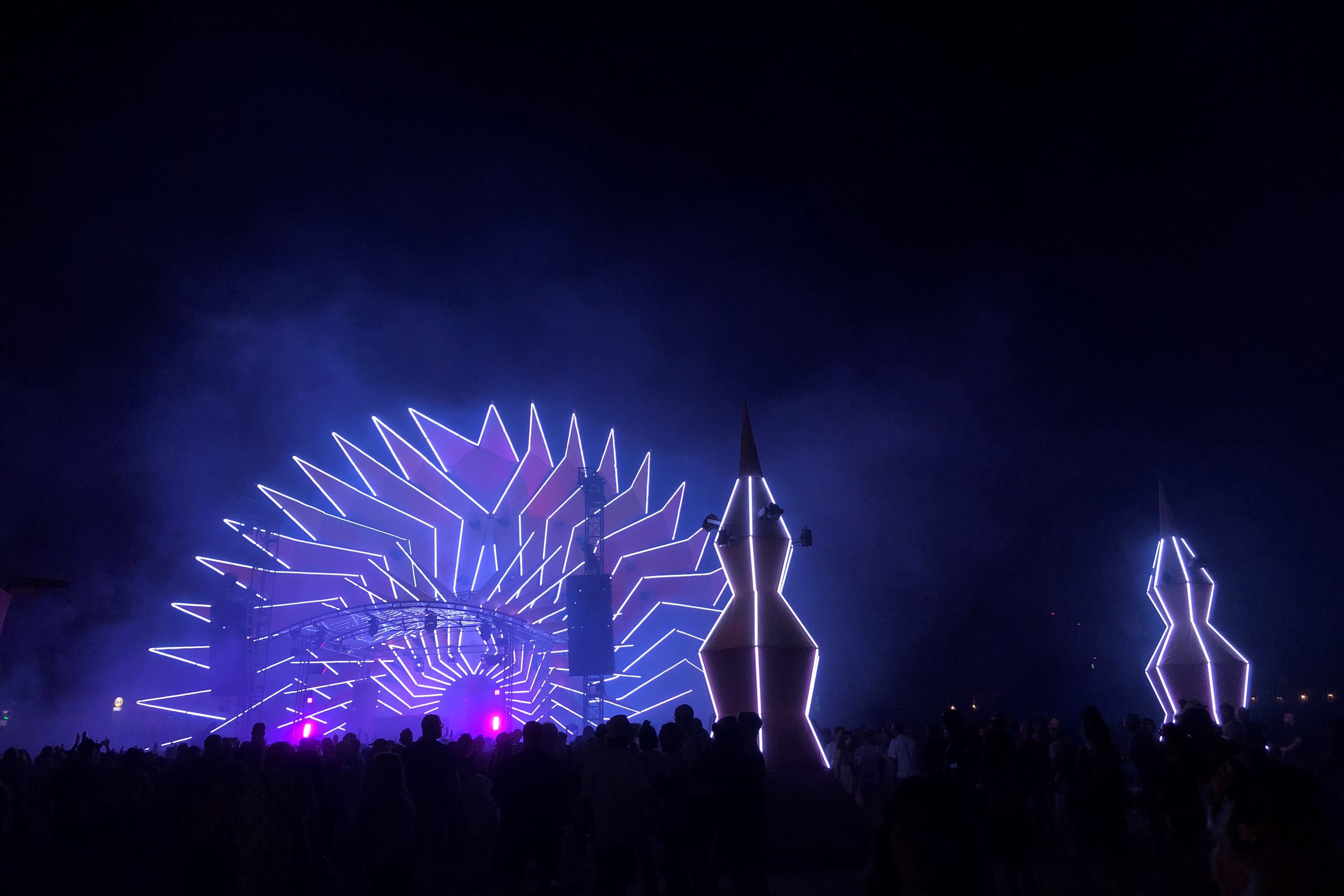 Déjà, la scène est magnifique. À mi-chemin entre un soleil, un tournesol ou un crabe avec une couronne (c’est selon l’appréciation des festivaliers), on la remarque depuis le parking avec ses couleurs criardes. À la nuit tombée, ce sont les LED qui se chargent de faire impression. Les lumières s’animent, en rythme avec la musique, créant un véritable spectacle. C’est comme pour KISS en début de festival, on s’arrête pour voir le show, même si on n’est pas fan de la musique.