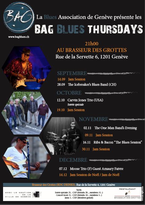 Le BAG est une association à but non lucratif née en avril 2008 dans le but de promouvoir et diffuser la musique Blues dans la région genevoise. Son principal objectif est de créer un réseau et d’établir des ponts entre les musiciens qui la pratiquent et les amateurs qui l’apprécient. http://www.bagblues.ch/