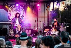 Une bonne nuit de sommeil et le festival redémarre directement avec une « Mississippi Juke Joint Jam Session », sur la pelouse du festival, à laquelle la plupart des musiciens prennent part, avant que le Rising Star Fife and Drum Band ne déplace la musique à nouveau sur la scène principale (si, si, ils ont véritablement défilé en musique de la pelouse à la scène). C’est un autre ancien bénévole, Yanik Gertch et son « Blues Street One Man Band » qui reprendra le flambeau, qu’il passera à Youri Defrance, de France, comme son nom l’indique. Guitare, chant diphonique et percussions africaines, avec Youri Defrance on part dans un voyage qui serpente entre le blues, les chants chamaniques et les musiques folkloriques mongoles, qui forment un ensemble très cohérent et intéressant. Une belle découverte. Avec Possessed by Paul James on revient à un blues plus énergique et écorché, en témoignent les cordes de banjo cassées ! On revient dans un blues plus typique du Mississippi avec Joyce SheWolf Jones, accompagnée par son fils Cameron Kimbrough, que nous avions eu le bonheur de découvrir l’année dernière avec son cousin Robert Kimbrough. Oui, le Blues Rules, c’est aussi une histoire de famille, de cette grande famille du blues née dans le Mississippi. Une prestation également en partie improvisée avec le retour sur scène de RL Boyce pour un morceau. Molly Gene et son One Whoaman Band est également une habituée du Blues Rules, puisque c’est aussi 3ème fois qu’elle y revient pour exprimer son blues torturé, presque punk. Avec le dernier groupe, Hypnotic Wheels, on revient dans un concept inhabituel dans ce genre de musique avec une guitare, une vielle et des percussions: à nouveau un mélange subtil de nouvelles sonorités qui renouvelle agréablement le blues. Et c’est Tia Gouttebel, guitariste du groupe, qui lancera la traditionnelle jam session finale qui réunira quelques-un des artistes du week-end.
