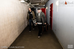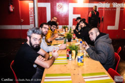 8:30 Tout le monde est là : les 5 musiciens de CardiaC (Riki*, Machete*, Schmitz*, Pepito*, Jul* – *noms réels connus de la rédaction), Boulard (ingé son), Paco (ingé volant) et Jo (ingé de tout le reste) et moi-même remplissons les 9 places du bus au départ pour Paris. On dort, on cause, on fait des pauses, on re-cause, on re-dort et après un voyage sans encombres ni gilets jaunes, on arrive à Paris.