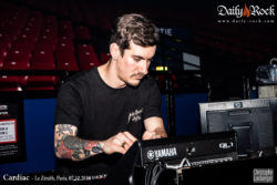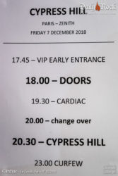 17:00 Soundcheck de Cardiac. On prend un peu de retard et tout à coup un des managers de Cypress Hill vient nous dire que c’est l’heure et qu’il faut arrêter. Heureusement, Boulard avait fini les réglages de tous les instruments et on négocie 2 minutes de rab juste pour régler tout le groupe ensemble. J’en profite pour faire quelques photos et je m’inquiète un peu : la machine à fumée n’a pas arrêté de tout l’après-midi et on a déjà un brouillard épais sur la scène du Zénith.
