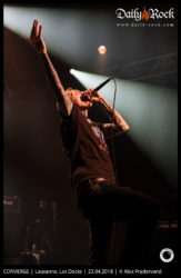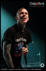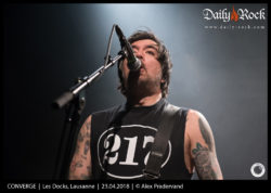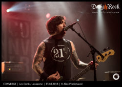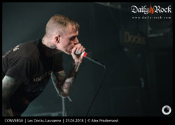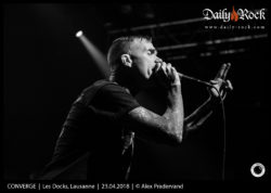Même état d’esprit avec les musiciens de Converge qui viennent eux aussi vérifier leur matériel sur scène. Derrière eux, une énorme bâche marquée du nom du groupe. Pas de pied de micro pour le chanteur, on sent bien que cela va devenir autrement plus remuant que les groupes précédents. Egalement dans un tee shirt Motörhead, Jacob Bannon dégage une énergie dingue. Le premier morceau, Reptilian, n’a pas commencé depuis 30 secondes qu’il a déjà parcouru 12 kilomètres. Dans le public, cela bouge bien et les photographes regrettent vite l’absence des crash barrières. Mais la priorité est au spectacle avec un chanteur qui se tient à proximité immédiate de son public et auquel il tend son micro sur les refrains. Meilleur concert de la soirée, Converge méritait sa place de tête d’affiche. Au moment de rentrer, petite pensée pour le lendemain matin et le reste de la semaine dont le budget sommeil a été anéanti ce lundi soir.