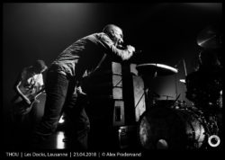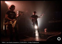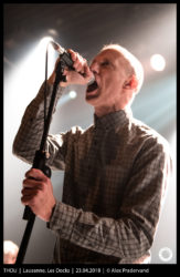 Dans la salle, pas de crash barrières, donc il faut se faufiler devant. Heureusement le public est bien clairsemé à cette heure. Arrivent les musiciens de Thou. Plutôt souriants, mais le chanteur passe son temps face à son batteur dans une lumière faiblarde qui empêche toute photo correcte. Musicalement, c’est lourd, mais il manque à l’évidence quelque chose pour susciter mon intérêt. Trop commun. Les gars sur scène ont l’air plutôt sympas et plaisantent sur le fait qu’ils ont besoin d’une place pour dormir cette nuit. Ce ne sont pas les propositions qui affluent depuis le public. Y’a encore du boulot pour remettre en cause la hiérarchie de l’affiche du soir.