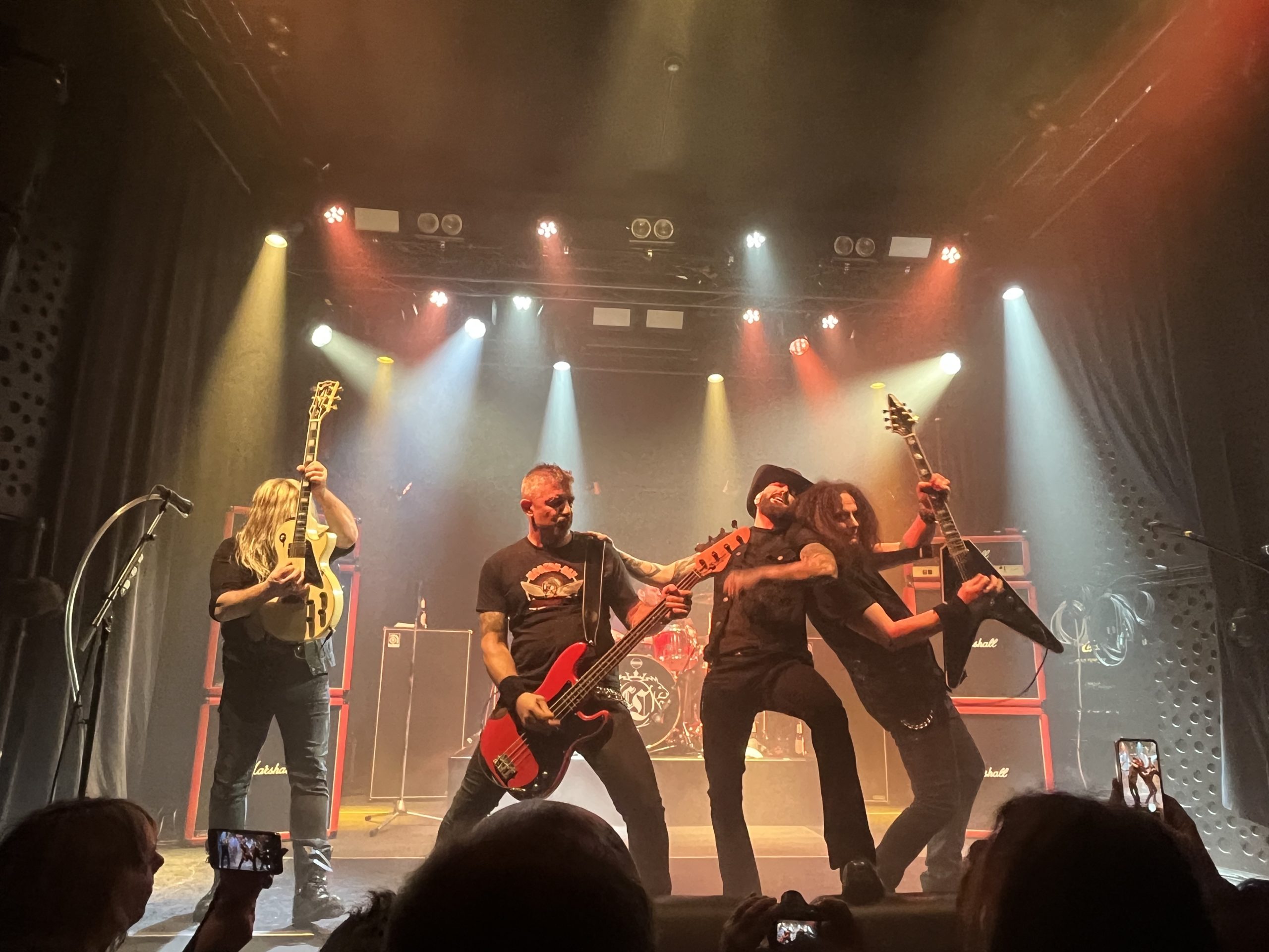 Le concert débute idéalement avec « Sister Moon », Gent Bushpepa est d’emblée très en voix, les musiciens tout sourire. On sent déjà que la soirée va être belle. Leo Leoni et Jgor Gianola, complices depuis toujours, se provoquent en duel à la six cordes avec efficacité et bonne humeur. La section rythmique n’est pas en reste avec le métronome Alex Motta derrière les fûts et l’énergique Mila Merker à la basse. Les titres s’enchaînent comme autant de perles musicales, pas le temps de reprendre sa respiration : « Like It Or Not », « She Goes Down », « Wake Up Call », « In The Name » (Leo rappelle son actualité près de 18 ans après son écriture) – j’en passe et des meilleures – sont un boulevard jusqu’à « Firedance » qui fait monter la température dans la salle. Nous sommes toujours impressionnés par le charisme de CoreLeoni sur scène et le rayonnement de son énergie positive.