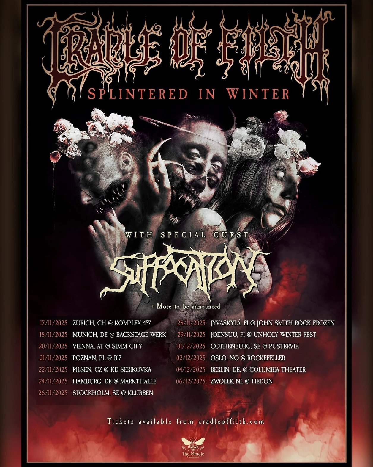 Les britanniques de Cradle of Filth, piliers du black metal symphonique, se produiront le lundi 17 novembre 2025 au Komplex 457 de Zurich dans le cadre de leur tournée européenne « Splintered in Winter ». Malgré un changement récent de personnel (guitariste et clavier), le groupe emmené par Dani Filth promet comme à son habitude un concert mêlant théâtralité, puissance et atmosphère gothique.