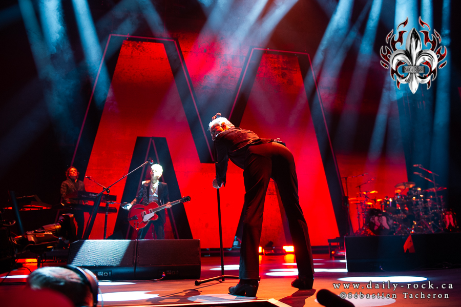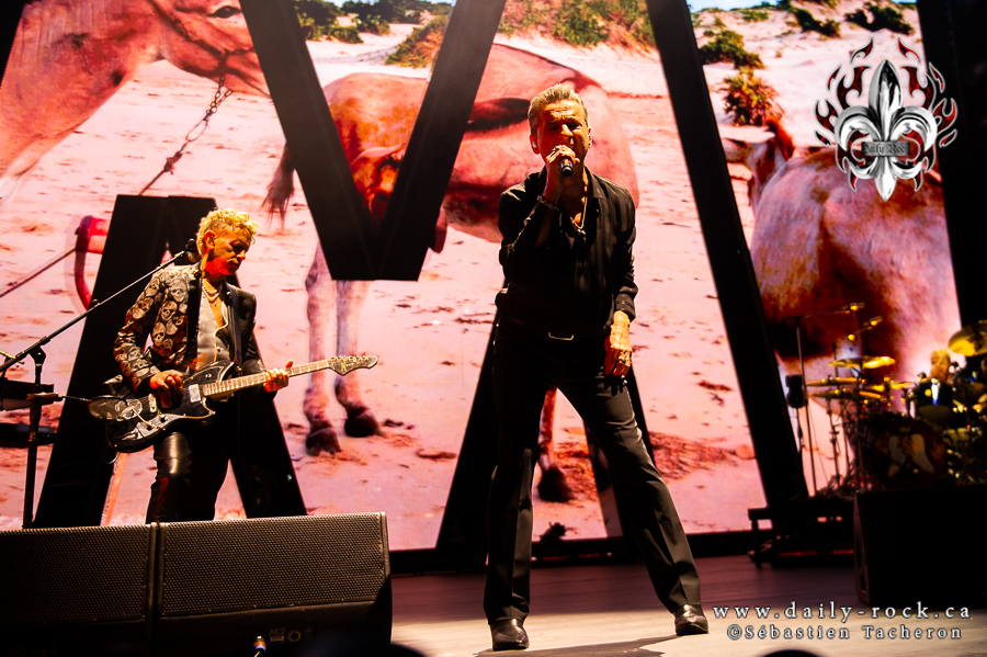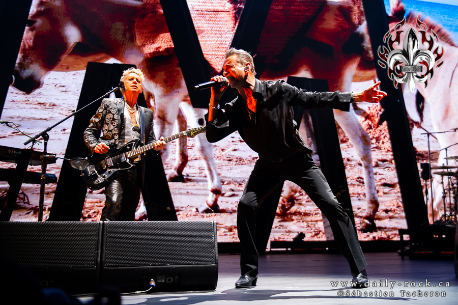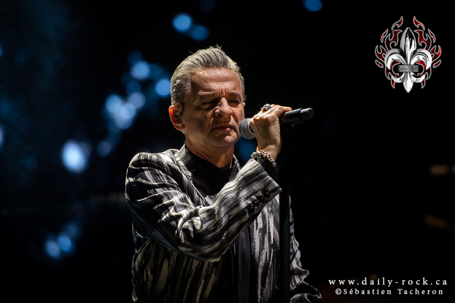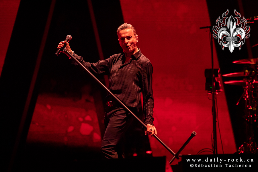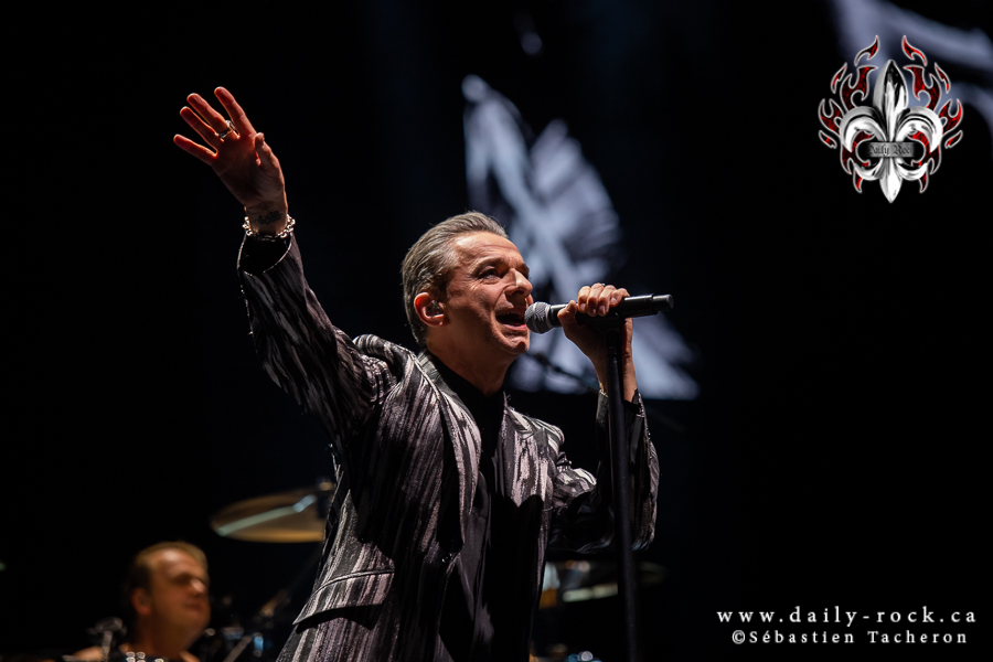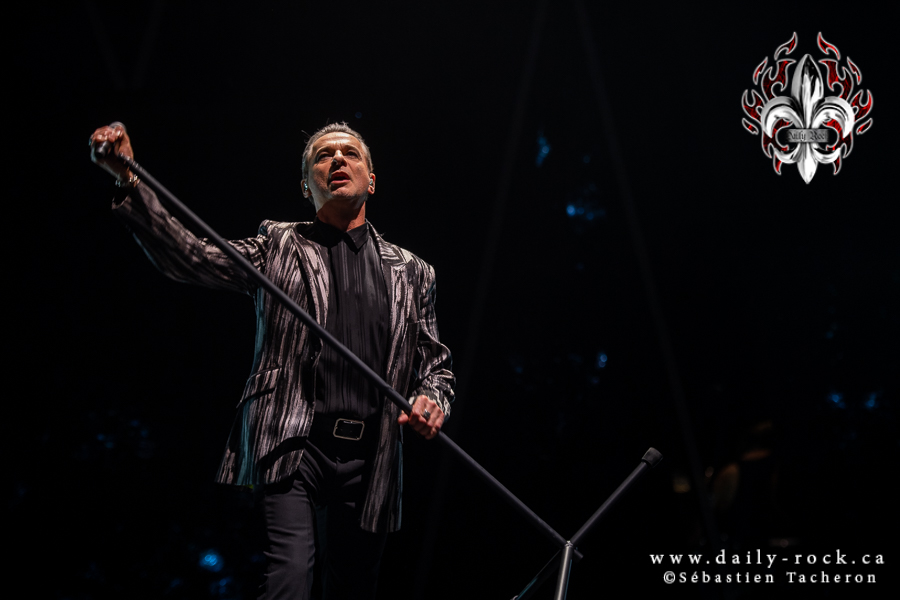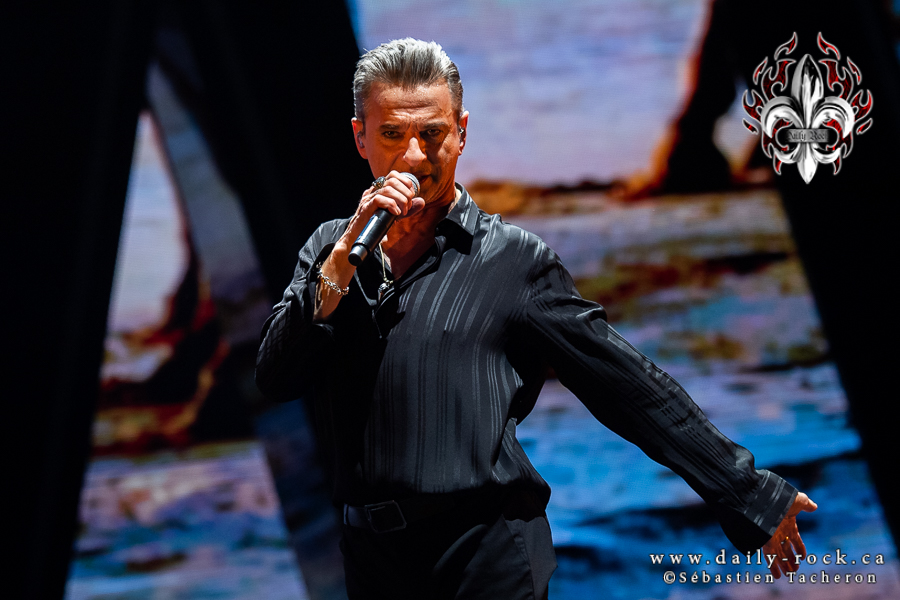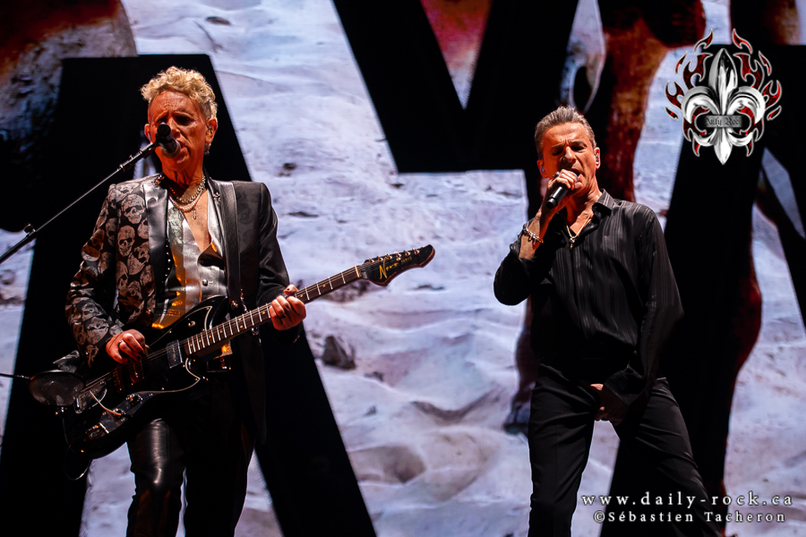 Martin Gore se place derrière ses synthétiseurs et joue les premières envolées d’Everything Counts, revenue du passé pour mettre le feu aux coeurs et faire sautiller un public conquis d’avance. Mais l’assurance de jouer avant tout pour les fans n’empêche pas les musiciens de tout donner sur scène. Pas de demi prestation ici, ces deux-là savent faire le show et le font divinement. Martin Gore assure les riffs essentiels sur ses superbes guitares et Dave Gahan irradie par sa voix et son charisme. La présence scénique du chanteur est exceptionnelle, et après 40 ans de carrière, il est toujours aussi généreux en déhanchés, porté par les visuels du photographe Anton Corbijn, qui signe ici une scène minimaliste mais efficace.