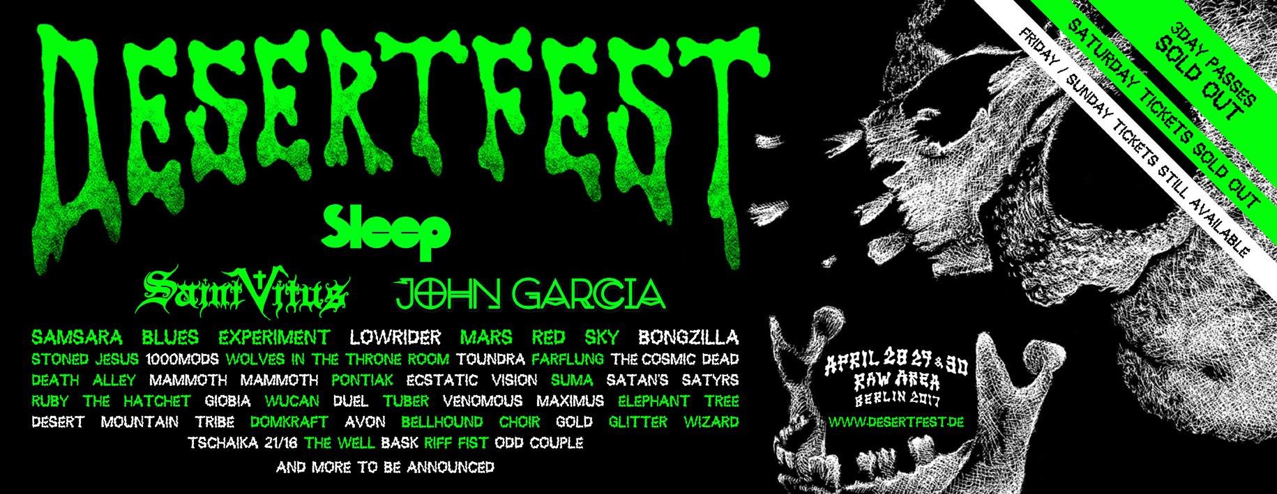 SLEEP * SAINT VITUS * JOHN GARCIA & BAND (playing songs from Kyuss to Slo Burn) * SAMSARA BLUES EXPERIMENT * MARS RED SKY * LOWRIDER * BONGZILLA * STONED JESUS * 1000MODS * TOUNDRA * ECSTATIC VISION * SUMA * THE COSMIC DEAD * PONTIAK * MAMMOTH MAMMOTH * TUBER * SATAN’S SATYRS * WUCAN * VENOMOUS MAXIMUS * THE WELL * GOLD * ODD COUPLE * RIFF FIST * TSCHAIKA 21/16