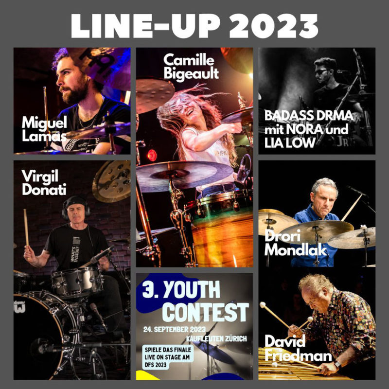 Funk, jazz, rock et musiques du monde, des batteurs de calibre international présenteront leurs compétences lors de cette septième édition. On pourra apprécier sur scène les prestations de Virgil Donati (AUS), Camille Bigeault (FR), Miguel Lamas (SP), Drori Mondlak (batterie) + David Friedman (vibraphone) (US), mais également Sebastian Mäder, Lia Schmid et Nora Lützelschwab (Band Ray Drama, CH). Et pour la 3e fois un concours jeunesse est organisé, donnant l’opportunité à des batteurs en herbe de s’exprimer sur la grande scène du festival !