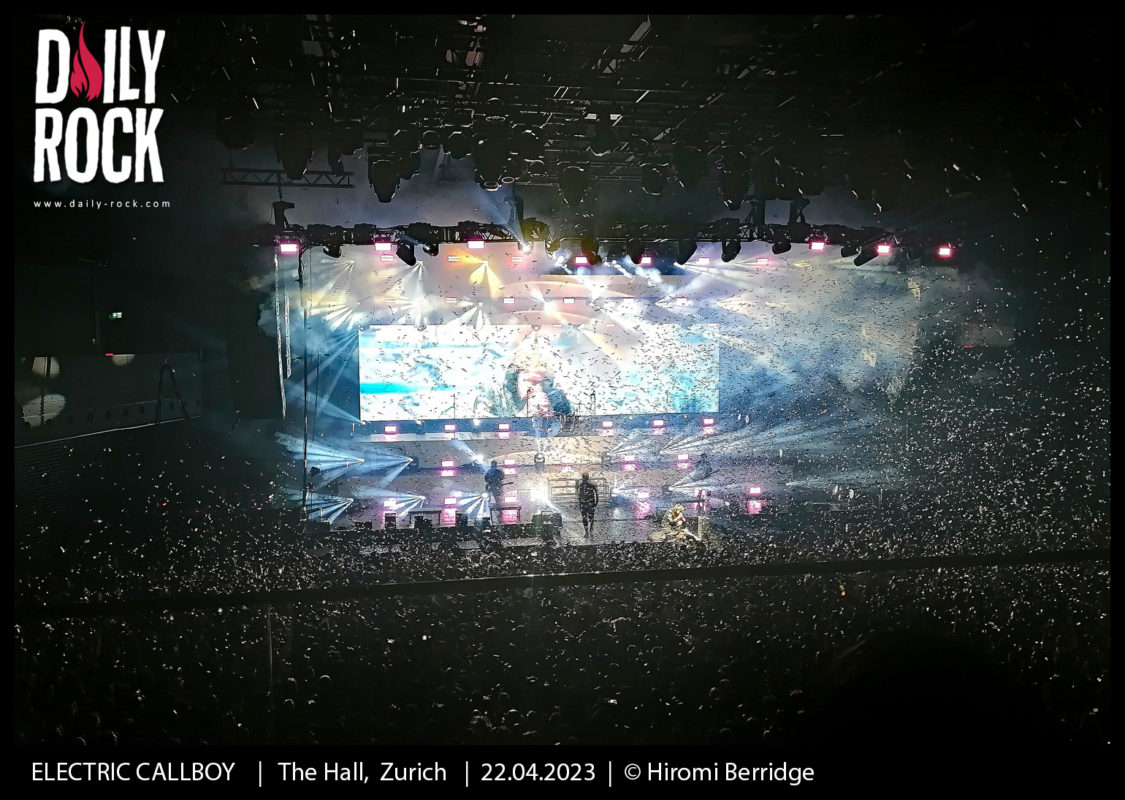 Le public est déjà bien enjoué par la première partie de concert assurée par Future Palace et Blind Channel. Durant la pause, la foule se prépare à accueillir le clou du spectacle, Electric Callboy, en chantant sur des hits tels que « Don’t stop me now ».