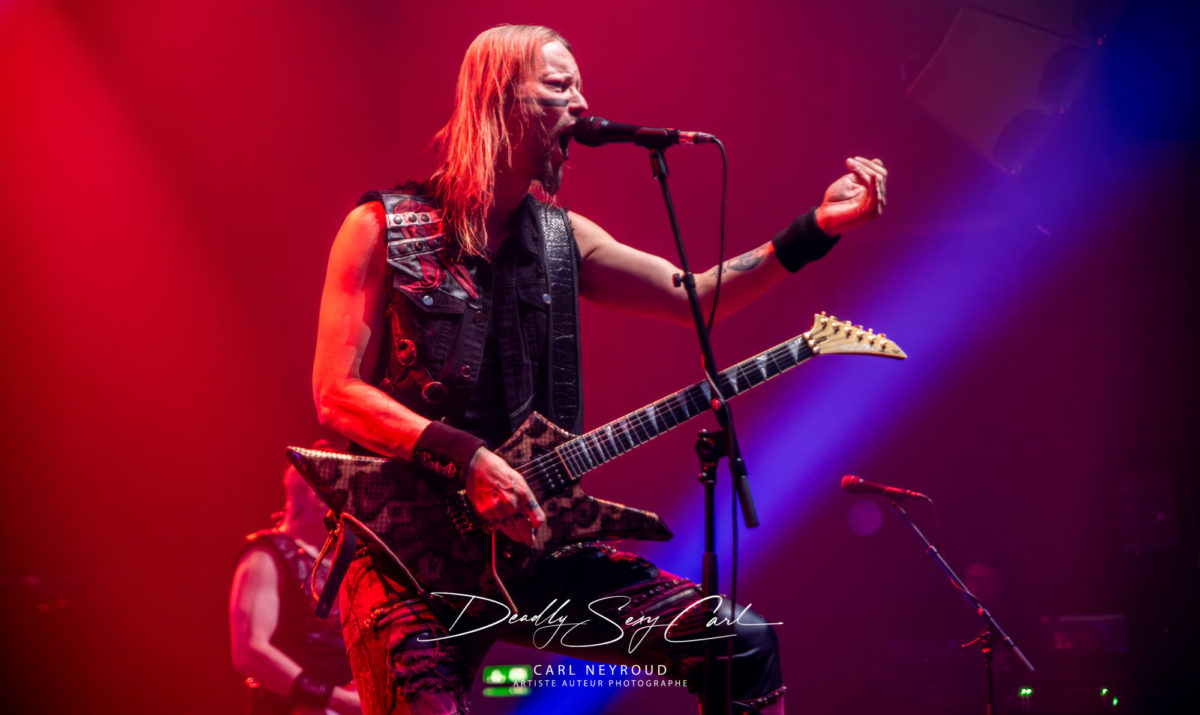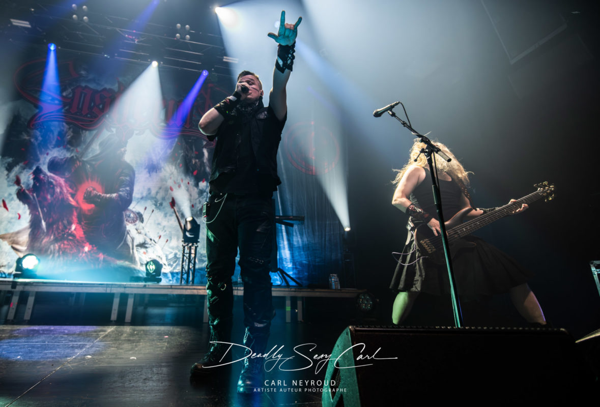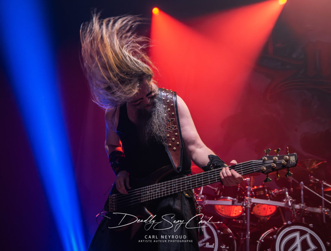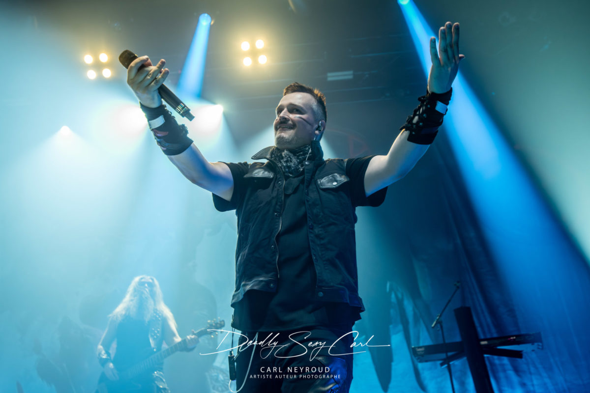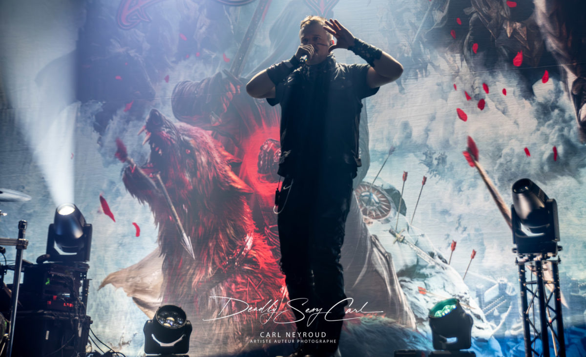 Fondé en 1995 en Finlande, Ensiferum est l’un des piliers du folk metal viking, mélangeant riffs tranchants, mélodies traditionnelles, chants épiques et thématiques guerrières. From Afar reste un album charnière, massif, fédérateur. Pas de décor non plus ici, mais un immense drap en fond de scène : logo, nom du groupe, et surtout cette image impressionnante d’un viking brandissant une épée, chevauchant un loup hurlant sur un champ de bataille. Tout est dit. Les jeux de lumière démarrent sur des teintes froides, bleu et blanc, presque glaciales. Puis, au fil de la setlist, les couleurs se réchauffent : rouge profond, parfois même des touches violettes.