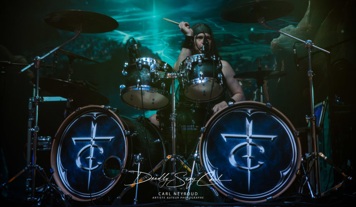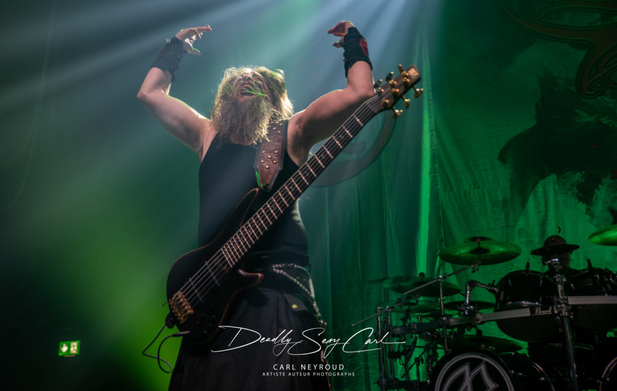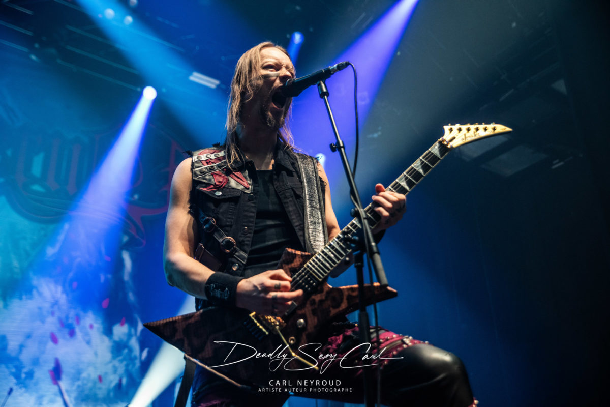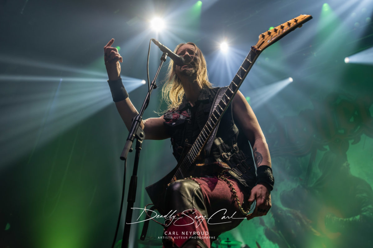 Fondé en 1995 en Finlande, Ensiferum est l’un des piliers du folk metal viking, mélangeant riffs tranchants, mélodies traditionnelles, chants épiques et thématiques guerrières. From Afar reste un album charnière, massif, fédérateur. Pas de décor non plus ici, mais un immense drap en fond de scène : logo, nom du groupe, et surtout cette image impressionnante d’un viking brandissant une épée, chevauchant un loup hurlant sur un champ de bataille. Tout est dit. Les jeux de lumière démarrent sur des teintes froides, bleu et blanc, presque glaciales. Puis, au fil de la setlist, les couleurs se réchauffent : rouge profond, parfois même des touches violettes.