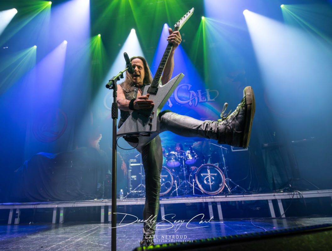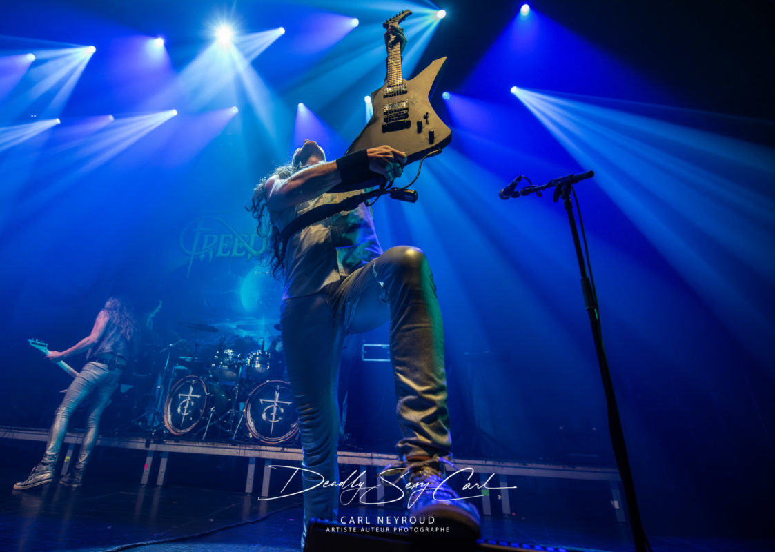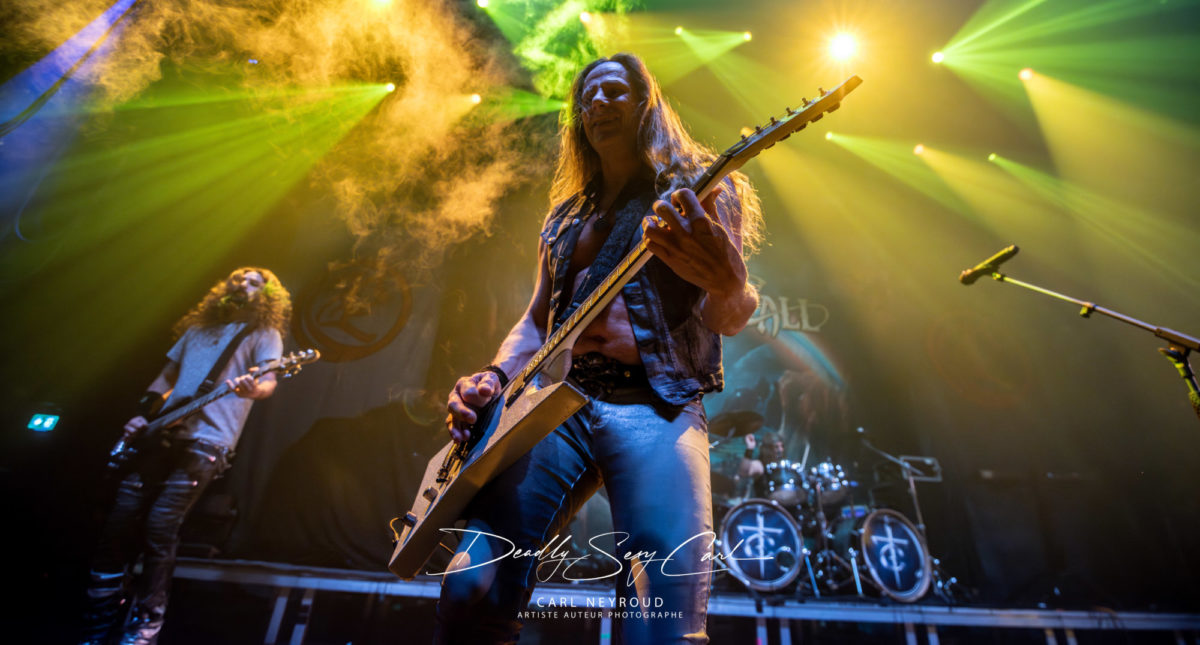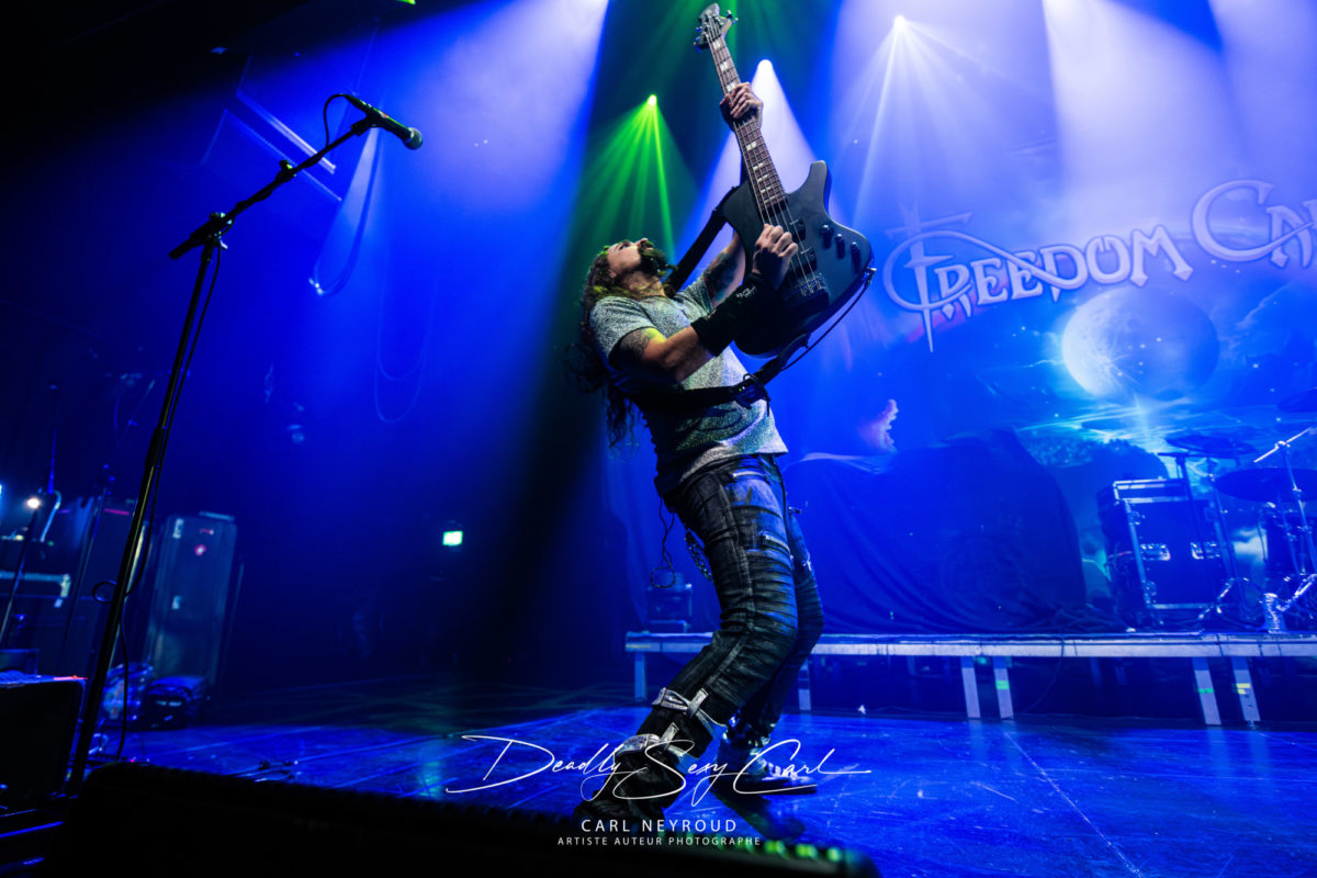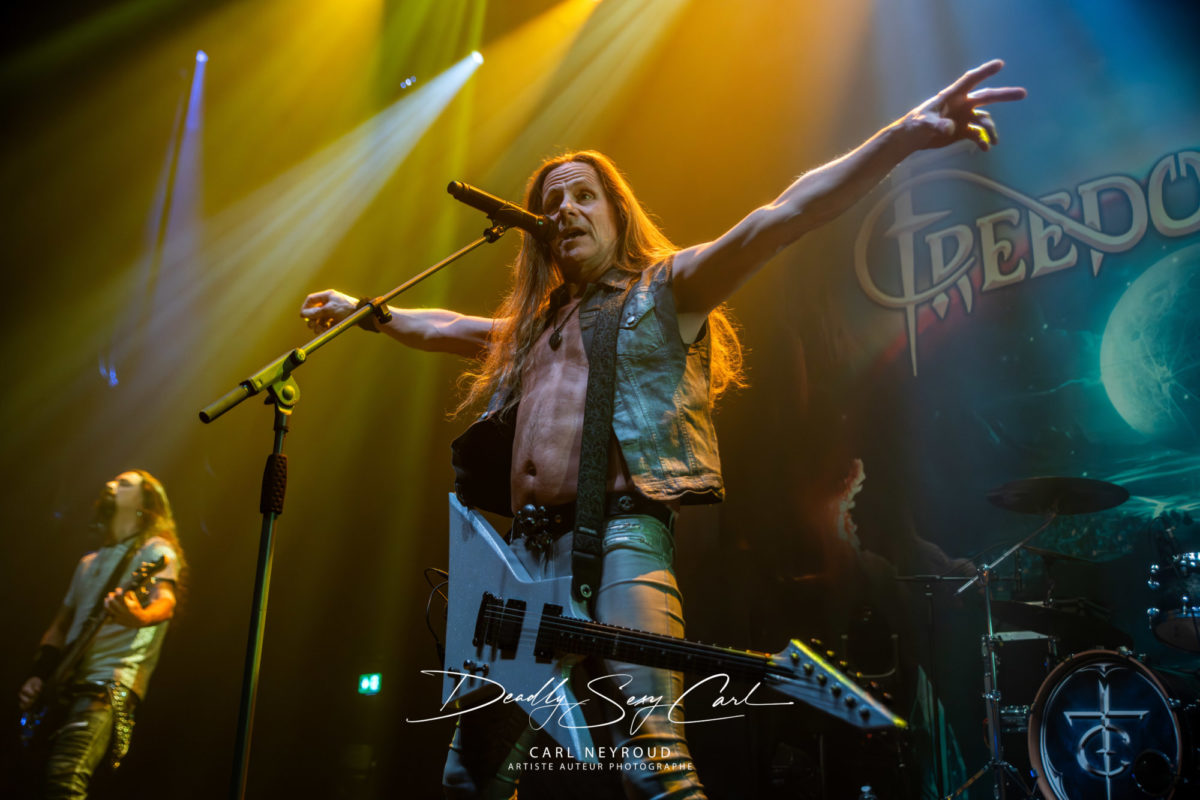 Créé en 1998 en Allemagne, Freedom Call est souvent cité comme l’un des groupes les plus positifs du power metal. Leur hymne Metal « Is for Everyone » est devenu un véritable manifeste, et leur réputation de groupe joyeux, presque solaire, les précède partout. Ici, pas de mise en scène élaborée : juste un drap derrière eux, avec le nom du groupe sur un ciel étoilé et un arc-en-ciel. Et honnêtement ? Ça suffit largement. Les jeux de lumière sont vifs, ultra colorés, presque flashy par moments, pendant que la machine à fumée crache à tout va, noyant la scène dans un nuage joyeusement opaque. Visuellement, ça claque : le chanteur, cheveux longs poivre et sel, sourire accroché au visage. Tous ont des cheveux interminables, du genre à rendre jalouse une bonne partie du public féminin (et masculin, soyons honnêtes). Vestes en jean ouvertes, rien dessous. Jeans, t-shirt gris métallisé.