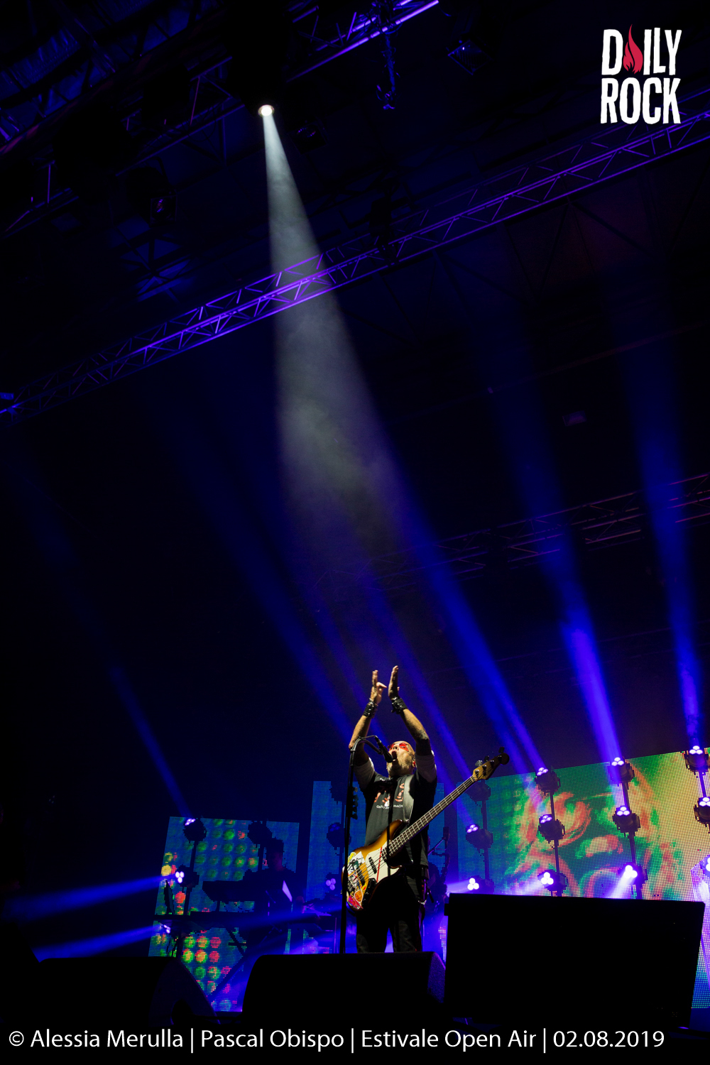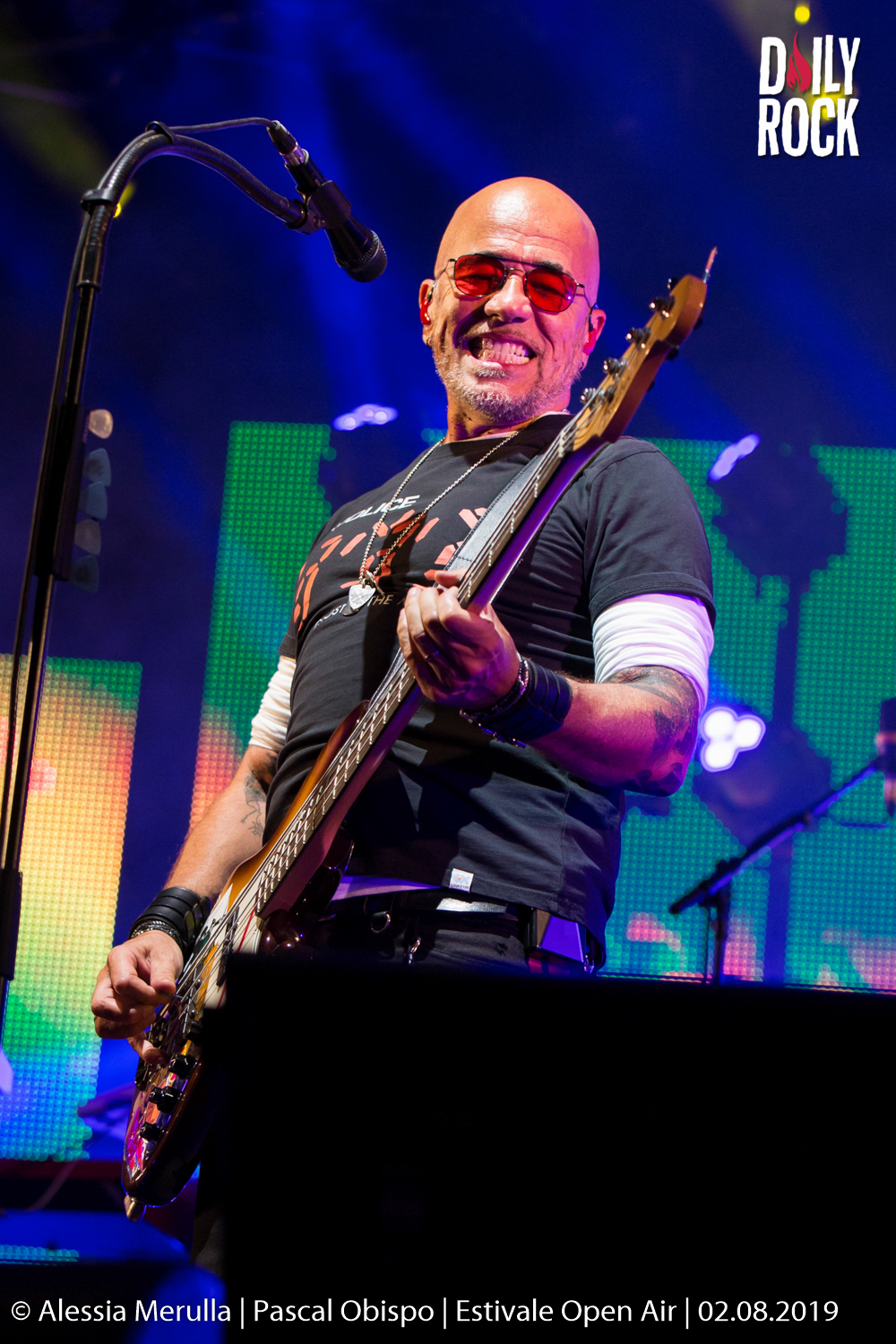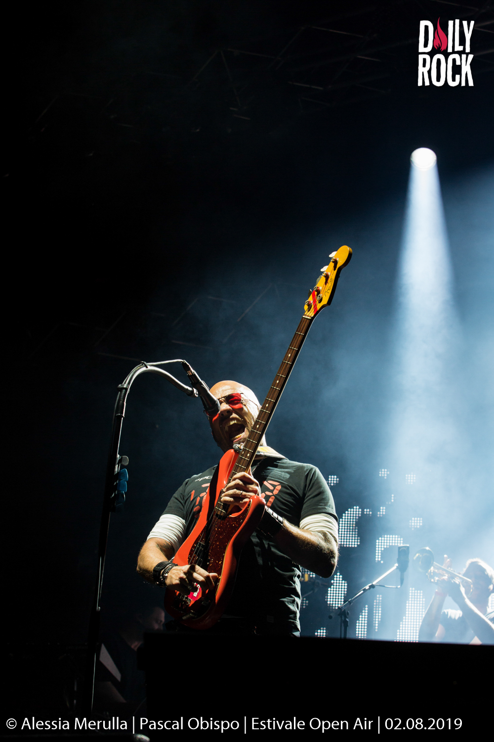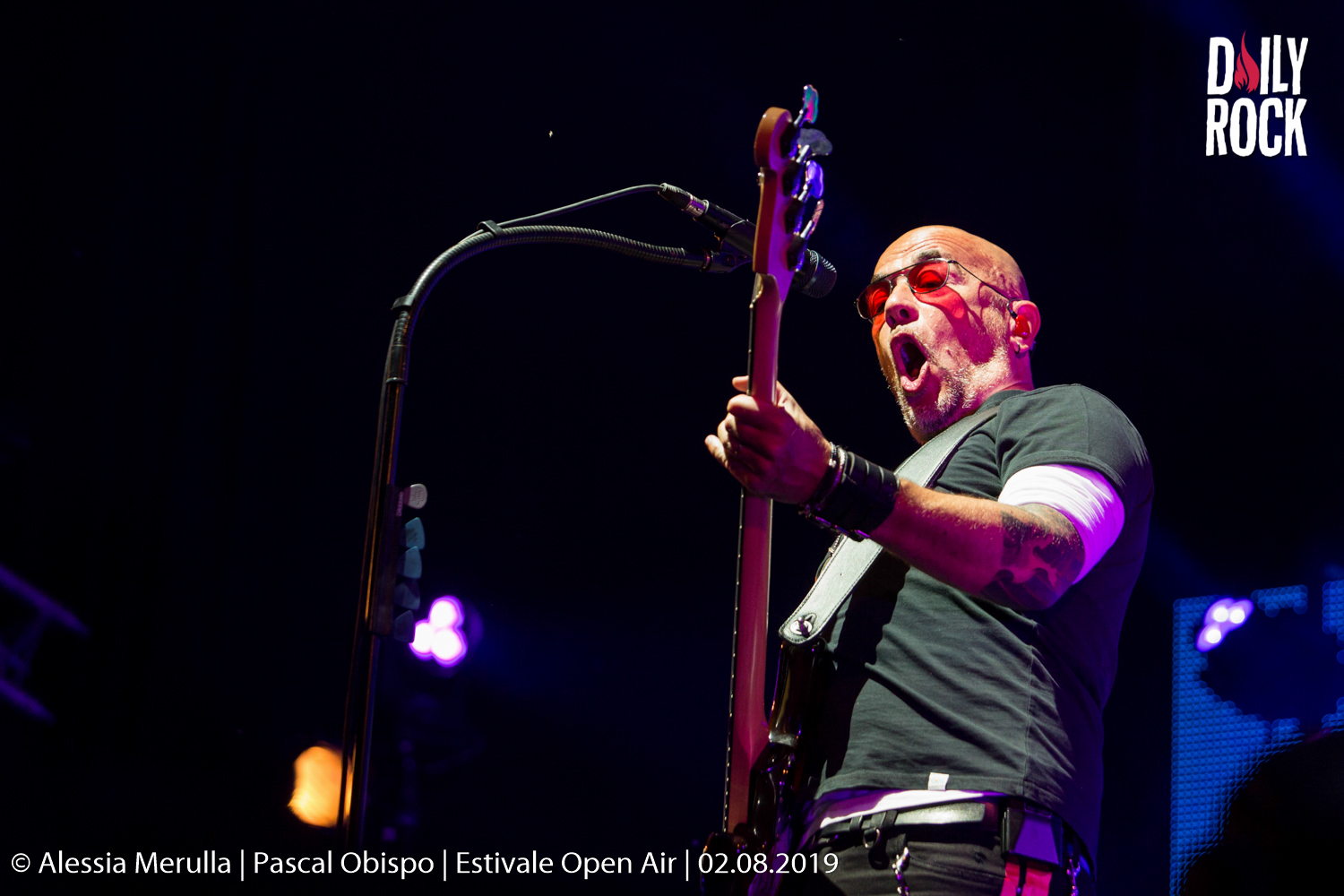 Au cas où ça n’a pas été mentionné plus haut, il est temps de préciser que pour cette troisième soirée d’Estivale, le public était très majoritairement féminin. Et celui que ces dames attendent toutes impatiemment depuis 18h, c’est bien sûr Pascal Obispo. Basse à la Calogero et lunettes rouges à la Bono, le Captain Samouraï Flower a amené son nouvel album, Obispo, à Estavayer-Le-Lac, mais pas que ! Pendant un peu plus d’une heure, il a lui aussi enchaîné les hits, que ce soit les siens ou ceux qu’il a écrits pour d’autres artistes. Ce sera d’ailleurs le seul point faible du concert. Le nombre de titres n’ayant pas été originellement interprétés par Obispo était un tantinet élevé vu la durée du concert. Ça nous aura tout de même fait une séquence blindtest ! Outre le set, c’est un Pascal Obispo au top de sa forme, surtout vocalement, qui s’est présenté devant le public de l’Estivale.