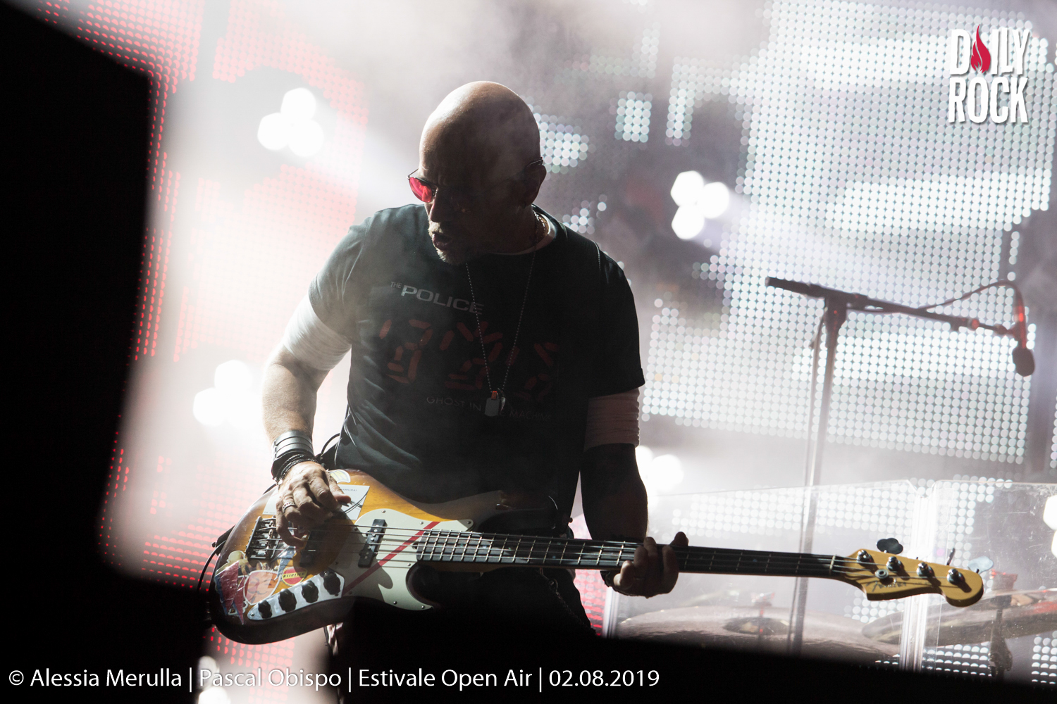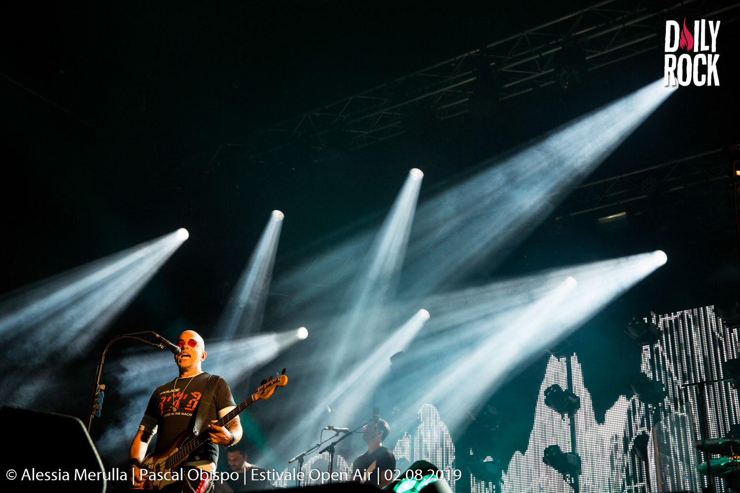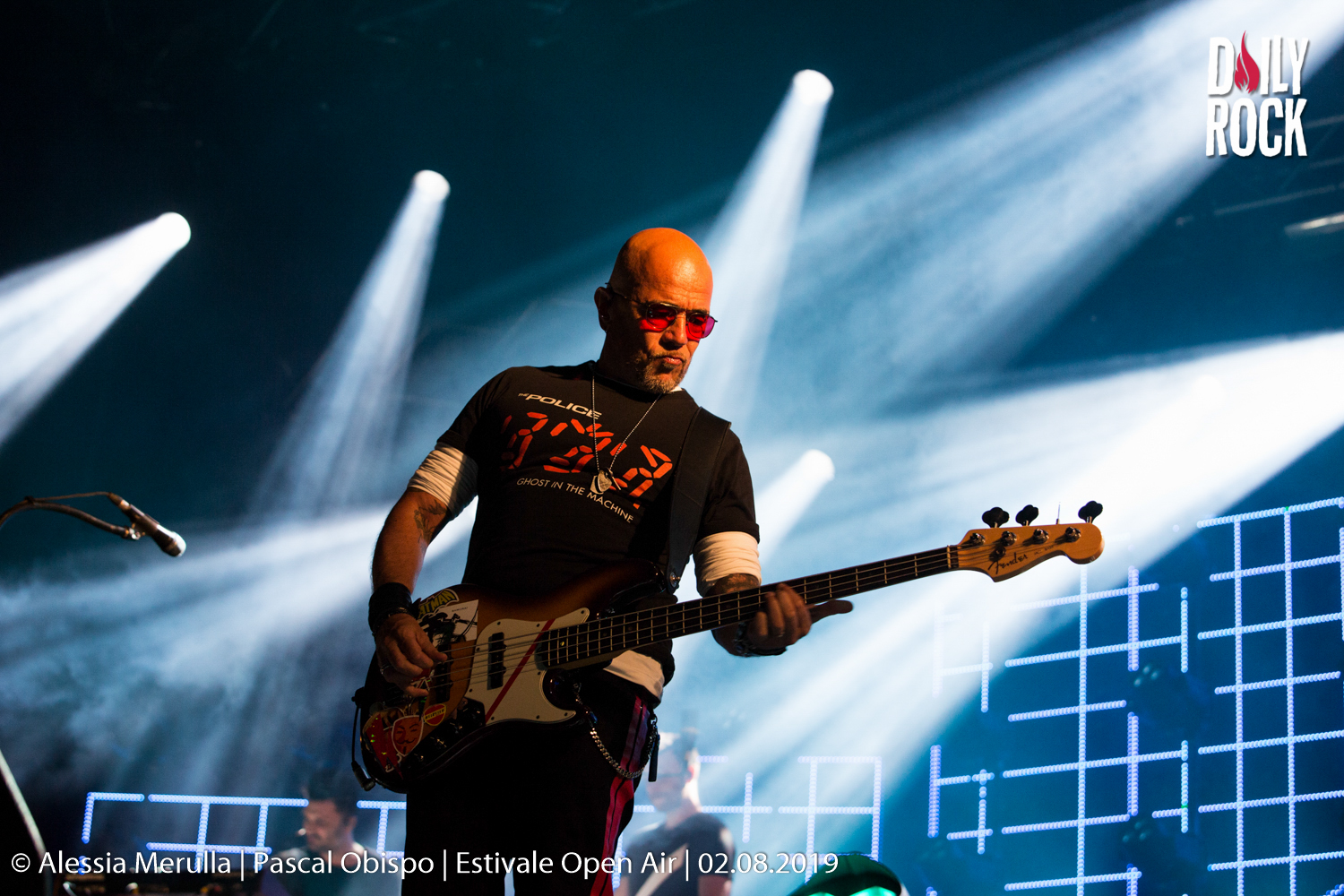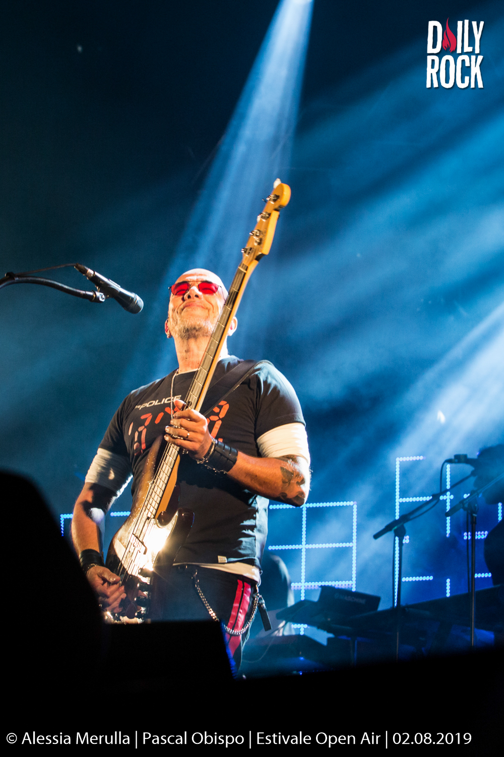 Au cas où ça n’a pas été mentionné plus haut, il est temps de préciser que pour cette troisième soirée d’Estivale, le public était très majoritairement féminin. Et celui que ces dames attendent toutes impatiemment depuis 18h, c’est bien sûr Pascal Obispo. Basse à la Calogero et lunettes rouges à la Bono, le Captain Samouraï Flower a amené son nouvel album, Obispo, à Estavayer-Le-Lac, mais pas que ! Pendant un peu plus d’une heure, il a lui aussi enchaîné les hits, que ce soit les siens ou ceux qu’il a écrits pour d’autres artistes. Ce sera d’ailleurs le seul point faible du concert. Le nombre de titres n’ayant pas été originellement interprétés par Obispo était un tantinet élevé vu la durée du concert. Ça nous aura tout de même fait une séquence blindtest ! Outre le set, c’est un Pascal Obispo au top de sa forme, surtout vocalement, qui s’est présenté devant le public de l’Estivale.