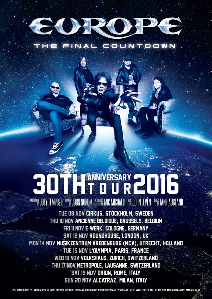 “It’s the final countdoooown ! Tulululu Tulu Lu Lu Luuuuu” Qui ne pense pas à ceci à l’évocation du nom ‘Europe’ ? Et bien, ça tombe bien car le groupe débarque en Suisse en novembre pour deux dates exceptionnelles. En effet, les rockeurs suédois interpréteront leur album mythique ‘The Final Countdown’ dans son intégralité, d’autres grands succès de leur répertoire ainsi que des morceaux encore jamais joués en live, tout cela pour célébrer leur trente ans de carrière. C’est l’occasion de ressortir ses anciennes fringues et d’emmener ses gosses pour leur faire comprendre une bonne fois pour toutes combien les années 80 étaient cool !