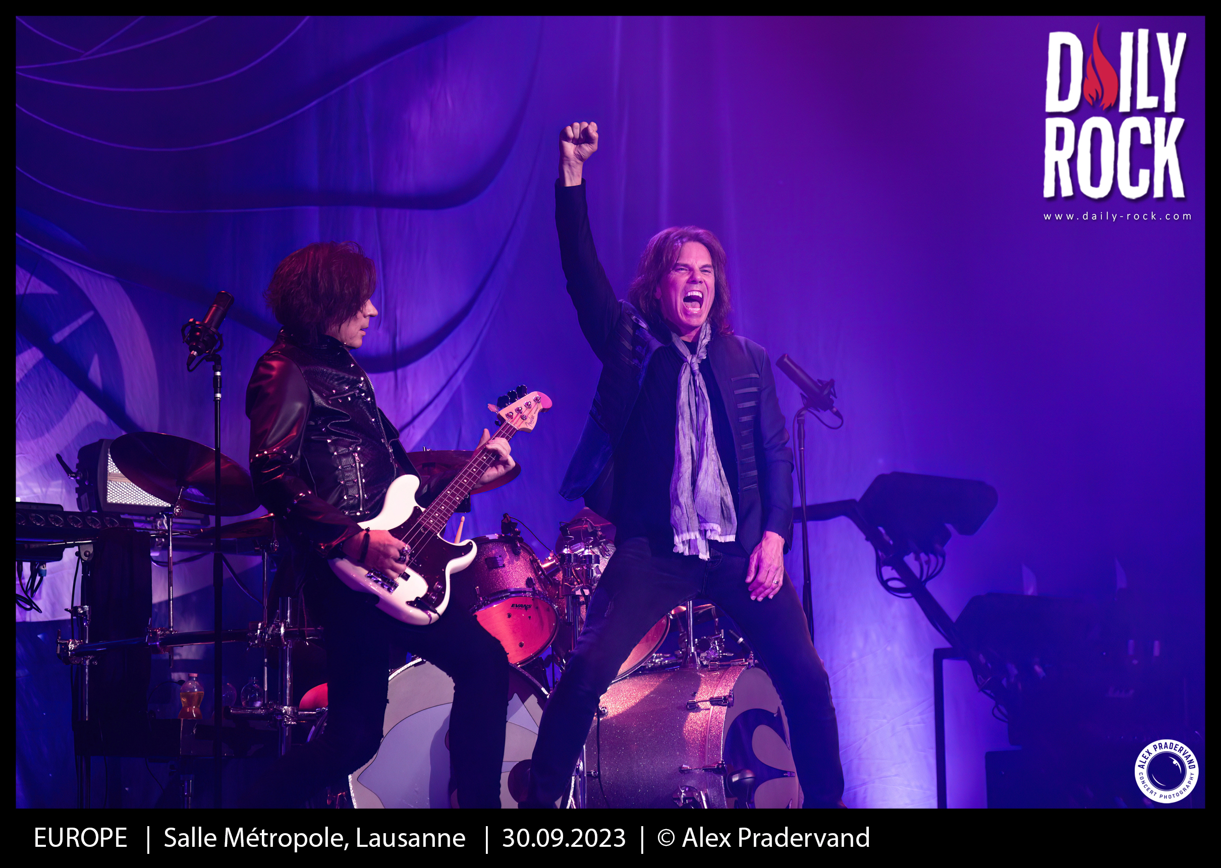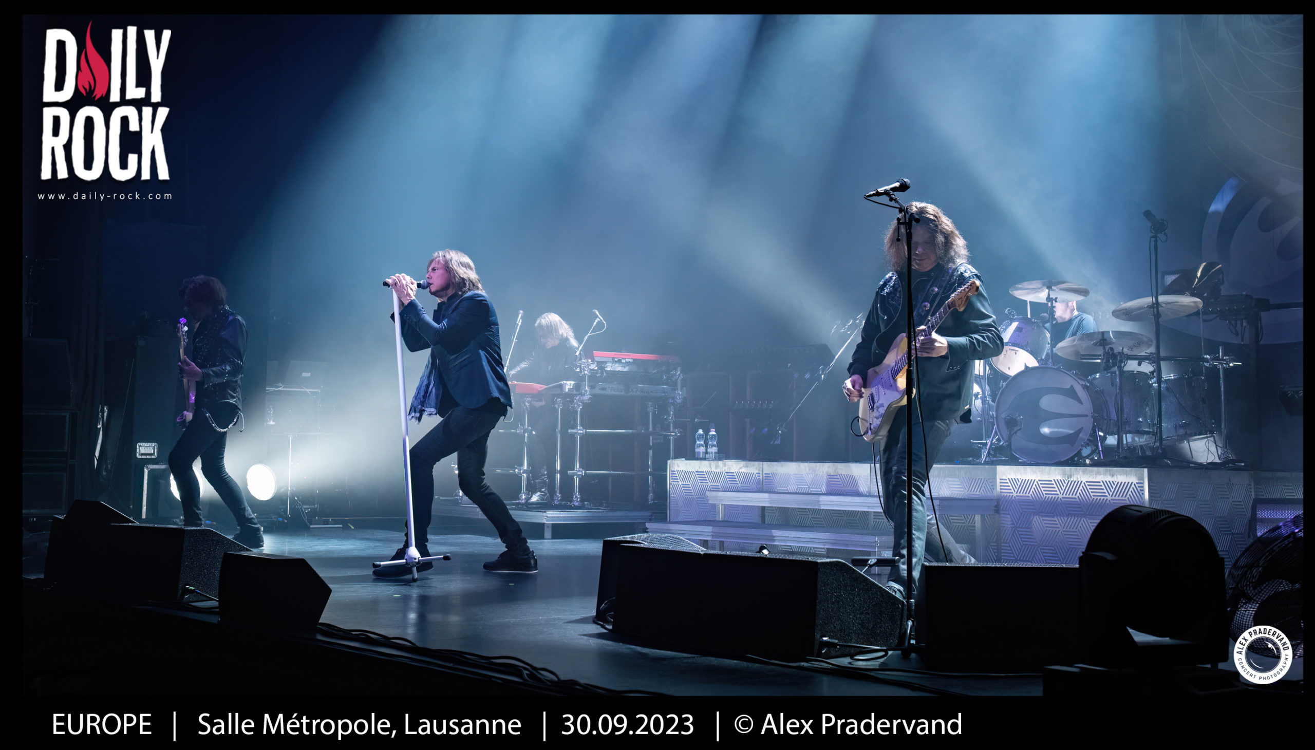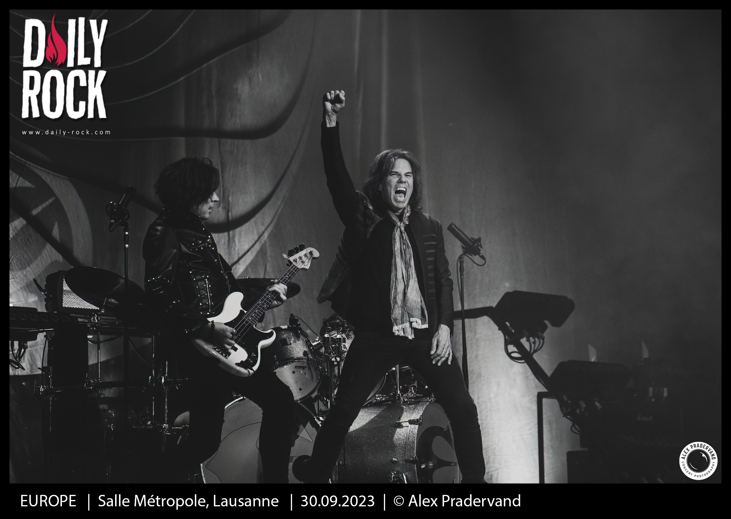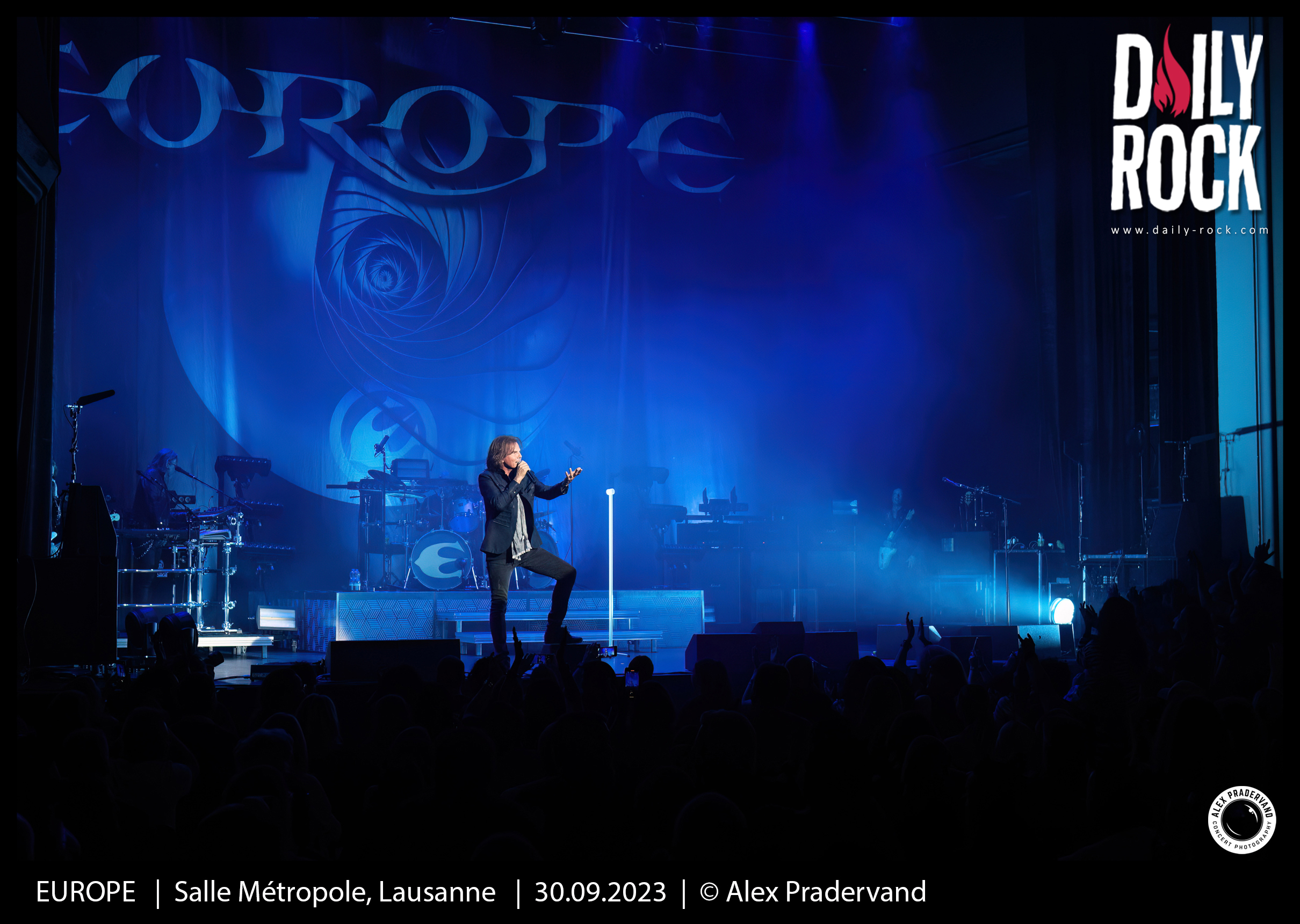 Samedi soir, Europe lançait à Lausanne son Time Capsule Tour, une tournée européenne d’une vingtaine de dates afin de célébrer 40 ans de carrière. Il fait encore chaud en cette fin de journée quand la foule commence à se rassembler sur le trottoir qui longe la Salle Métropole et surtout à se photographier devant l’énorme nightliner floqué du logo du groupe. Cerise sur le gâteau, la date est complète, comme celle de Zurich le lendemain, jolie preuve d’amour du public suisse pour ses suédois préférés.