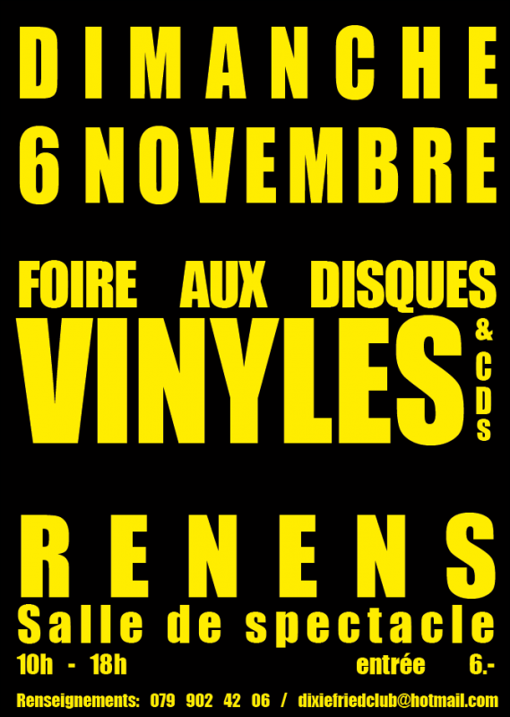 Ce dimanche 6 novembre aura lieu la foire aux vinyles à Renens. La foire ouvrira ses portes à partir de 10 heures et fermera à 18 heures. Vous y trouverez bien entendu des vinyles, mais des stands de CDs seront aussi installés.