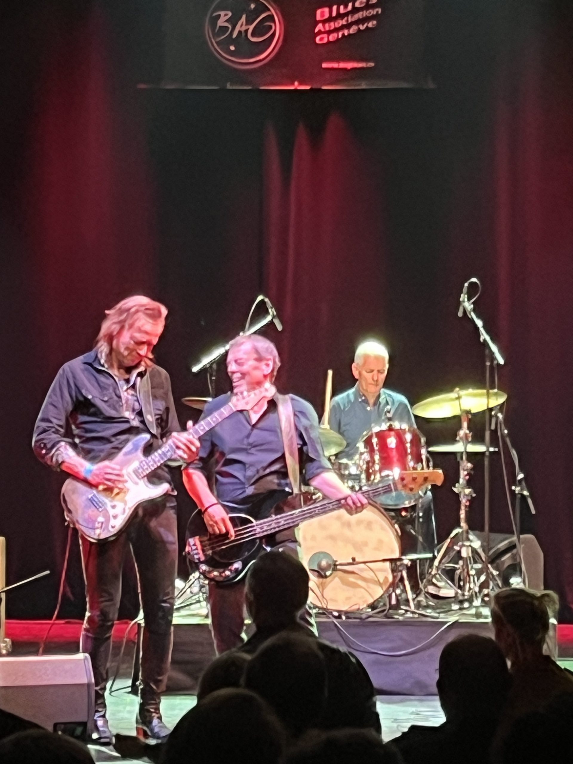 En première partie de soirée, une douzaine de musiciens parmi les plus fines gâchettes genevoises et sous la direction artistique d’Yves Staubitz ont régalé le public avec un florilège de standards blues. De Stevie Ray Vaughan (« Crossfire ») à ZZ Top (« Jesus Just Left Chicago ») en passant par Robben Ford (« Help the Poor ») et Buddy Guy (« Damn Right I’ve Got the Blues »), il y en avait pour tous les goûts, le plus difficile étant de faire un choix parmi l’abondance de classiques. Vers la fin du concert, le légendaire John Woolloff (guitariste qui a notamment collaboré avec une pléiade d’artistes français comme Daniel Balavoine, Patrick Bruel, Catherine Lara, Jacques Dutronc, William Sheller et plus récemment avec Gölä, star de l’autre côté du Röstigraben) entre en scène pour des soli de derrière les fagots. Le concert finit en beauté avec un hommage à Jeff Beck, une émouvante version de « Cause We’ve Ended As Lovers » à tirer les larmes d’un biker de Sons of Anarchy.