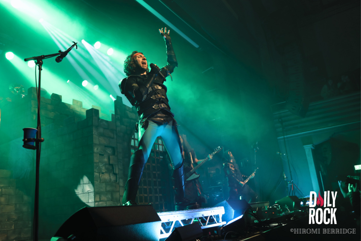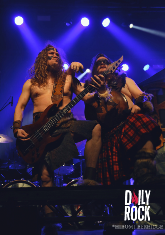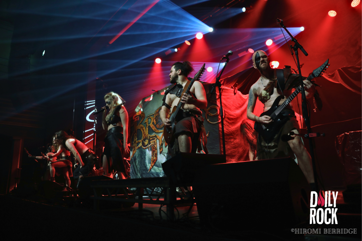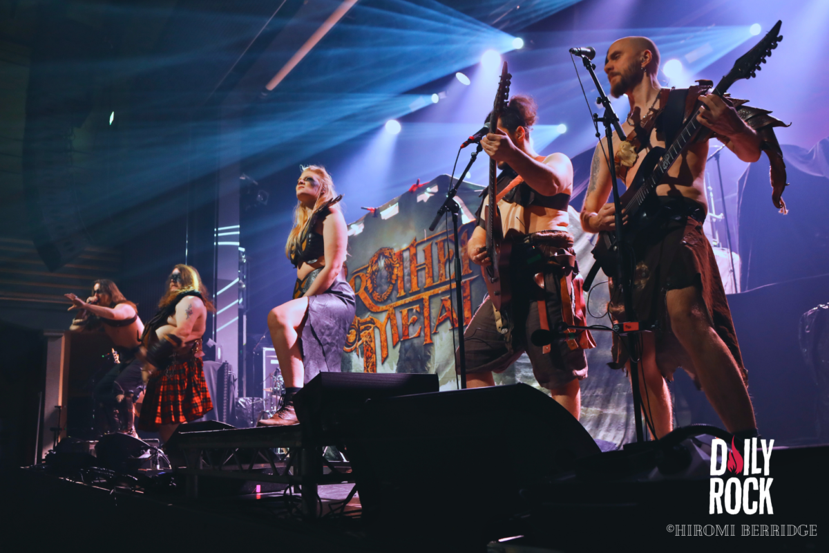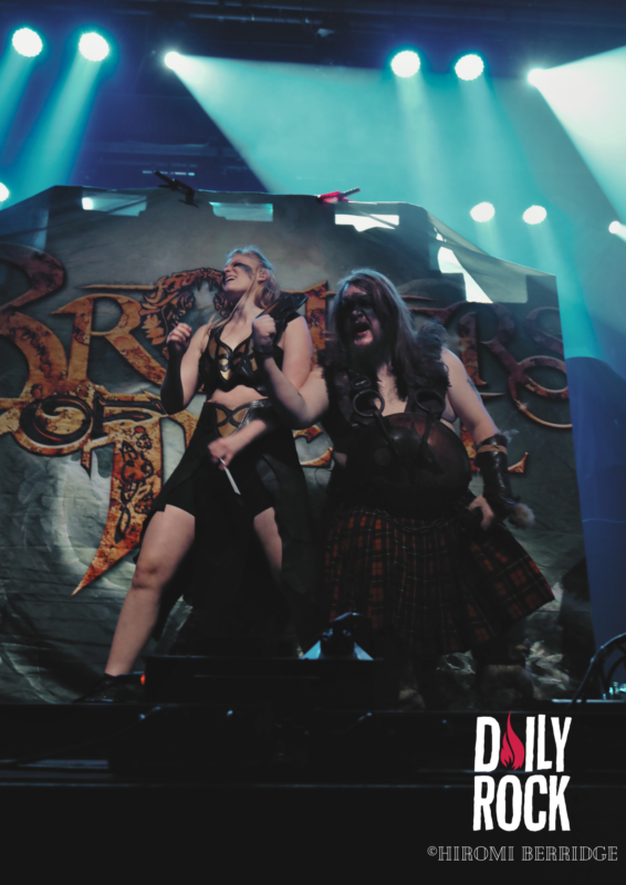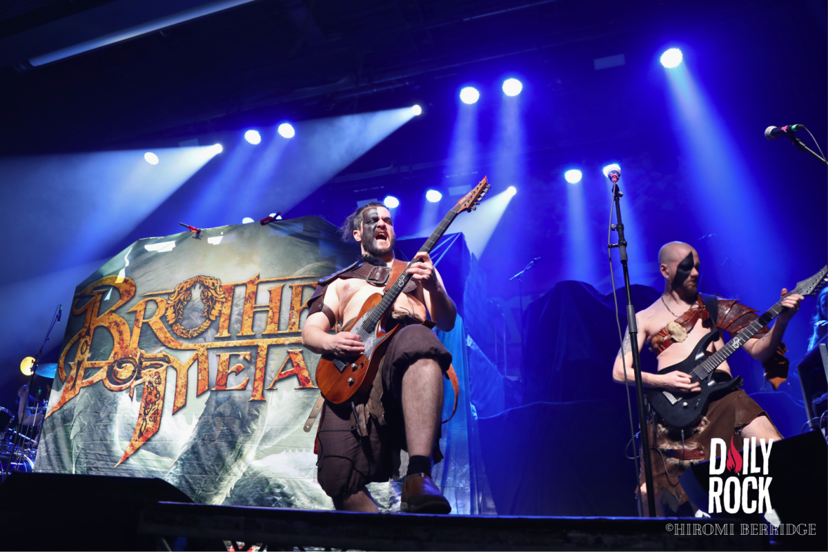 Une fois les lumières éteintes on voit débarquer une troupe de 8 barbares, répondant au nom de Brothers of Metal. Une petite horde, qui domine le peu d’espace qui reste. On se retrouve devant trois guitaristes, deux chanteurs, une chanteuse et bien entendu une base et une batterie (malheureusement caché par le décor depuis mon point de vue…) sur une petite parcelle de scène. Mais ce n’est pas pour autant que l’ambiance ne monte pas crescendo. Les chanteurs savent prendre la place et nous compter leurs histoires venant du Nord. Les guitaristes se passent le relais du rôle de soliste, ce qui permet une jolie occupation de l’espace. Le tout avec un public qui commence déjà à chanter et crier en cœur avec le groupe. On remarque d’ailleurs que ces derniers ne s’attendaient pas à être aussi bien accueilli.