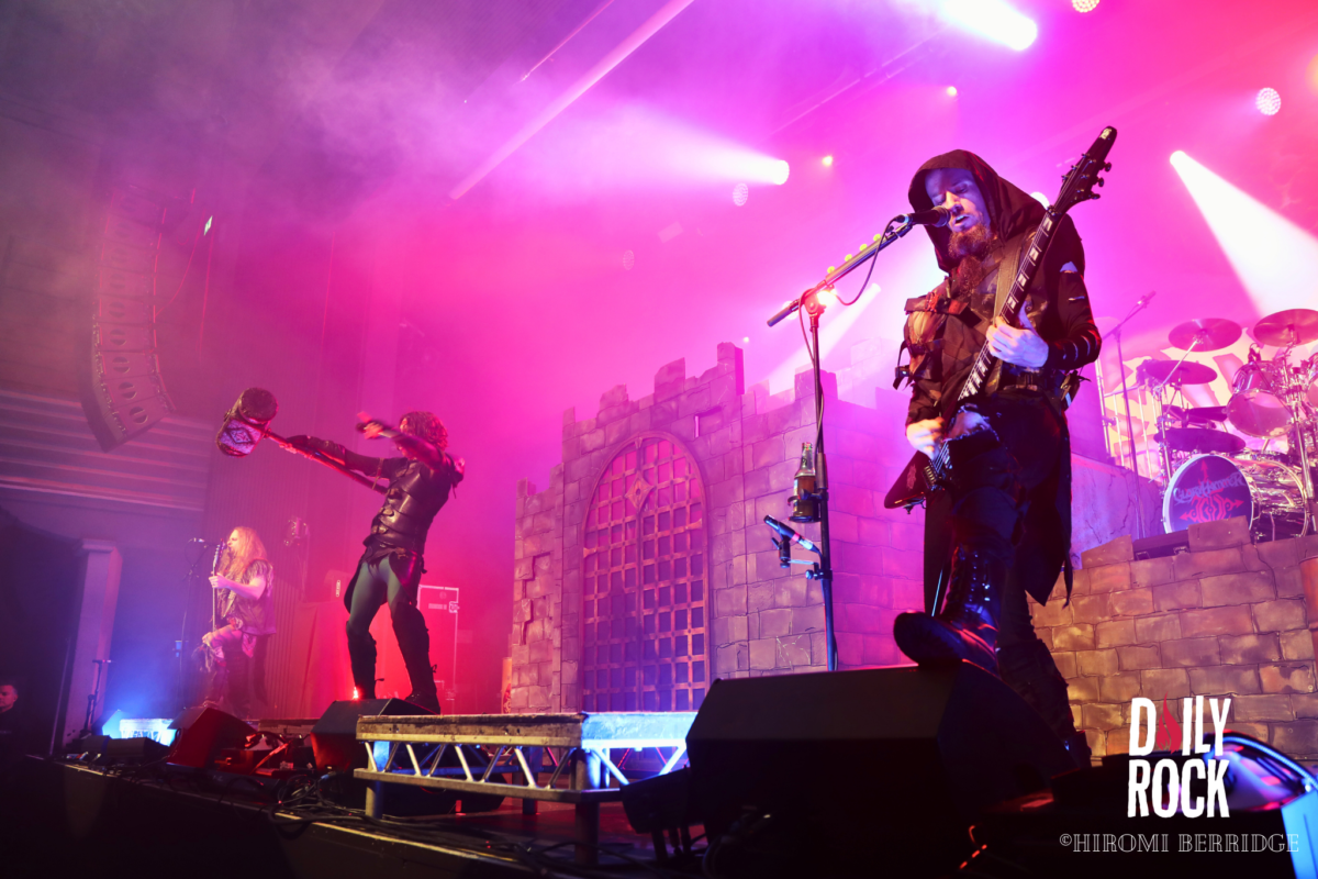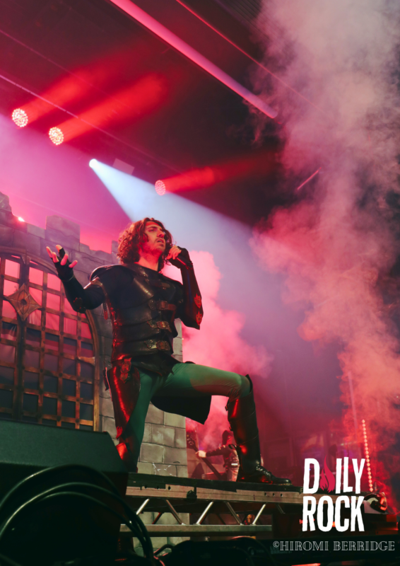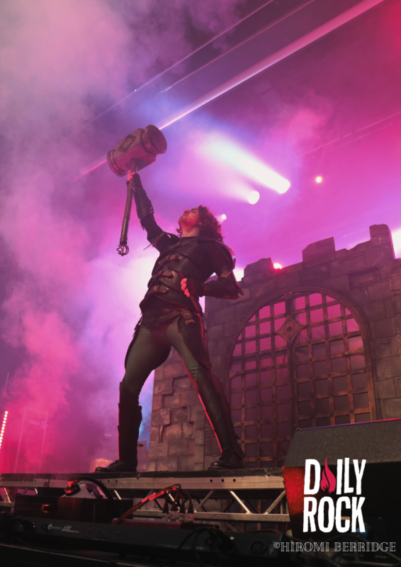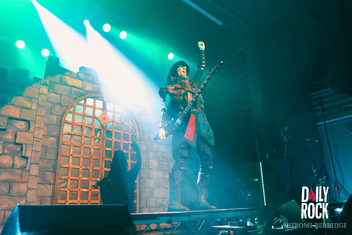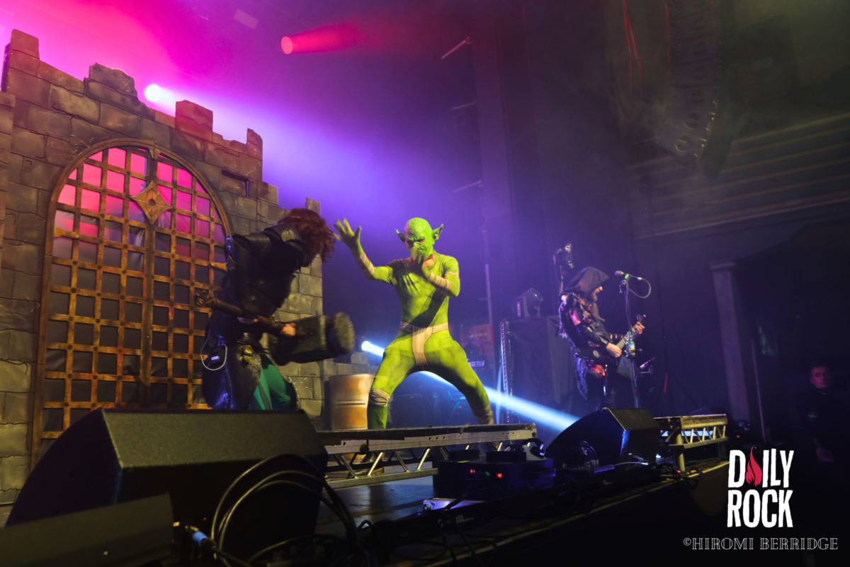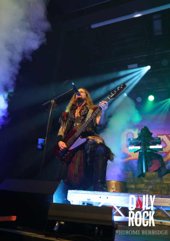 Après plusieurs légendes du Valhalla, des dieux du nord et un cul sec de bière de l’un des chanteurs, on regarde la technique mettre en place un château de brique (oui en carton mais faite un effort d’imagination) et l’immense bannière pour le prochain groupe, Gloryhammer. Comme à leur habitude, le concert commence par une effigie de taille humaine, cette fois-ci de David Hasselhoff. Et puis débarque un à un les musiciens pour nous emmener en voyage à travers l’espace et les dimensions. Que dire de ce groupe qui n’a pas déjà été dit. La voix angélique du chanteur, les solo endiablé du guitariste, les notes pressantes du claviériste et la partie rythmique toujours aussi efficace. Sans oublier notre ami, enfin… ennemie Le Goblin ! Qui se paie même le luxe d’une belle perruque bleu sur une de ses interventions. On pourra se réjouir d’avoir des morceaux de leur tout dernier album “Return to the Kingdom of Fife« , mélangés aux classiques Gloryhammer, Univers on Fire ou encore HootsForce. Le public ne se fait d’ailleurs pas privé pour chanter les paroles, hurler en rythme avec les musiciens, et commencent même les pogos.